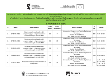 Harmonogram szkoleń z zakresu świadomości kompetencyjnych (diagnoza zasobów osobowościowych metodą MBTI) oraz pozostałych szkoleń miękkich w ramach projektu: „Podniesienie kompetencji studentów Wydziału Nauk o Zdrowiu Uniwersytetu Medycznego we Wrocławiu i zwiększenie konkurencyjności absolwentów na rynku pracy” Nr POWR.03.01.00-00-K191/15 Lp. Liczba godzin Liczba uczestników Termin Temat szkolenia 27-28.06.2016 Szkolenie z zakresu świadomości kompetencyjnych - diagnoza zasobów osobowościowych metodą MBTI 16 9 2. 27-28.06.2016 Szkolenie z zakresu świadomości kompetencyjnych - diagnoza zasobów osobowościowych metodą MBTI 16 10 3. 29-30.06.2016 Szkolenie z zakresu świadomości kompetencyjnych - diagnoza zasobów osobowościowych metodą MBTI 16 9 29-30.06.2016 Szkolenie z zakresu świadomości kompetencyjnych - diagnoza zasobów osobowościowych metodą MBTI 16 9 1. 4. 5. 11-12.07.2016 Porozumiewanie się skoncentrowane na rozwiązaniach 16 10 Miejsce szkolenia Uniwersytet Medyczny im. Piastów Śląskich we Wrocławiu Wydział Nauk o Zdrowiu ul. K. Bartla 5, 51-618 Wrocław Uniwersytet Medyczny im. Piastów Śląskich we Wrocławiu Wydział Nauk o Zdrowiu ul. K. Bartla 5, 51-618 Wrocław Uniwersytet Medyczny im. Piastów Śląskich we Wrocławiu Wydział Nauk o Zdrowiu ul. K. Bartla 5, 51-618 Wrocław Uniwersytet Medyczny im. Piastów Śląskich we Wrocławiu Wydział Nauk o Zdrowiu ul. K. Bartla 5, 51-618 Wrocław Uniwersytet Medyczny im. Piastów Śląskich we Wrocławiu Wydział Nauk o Zdrowiu ul. K. Bartla 5, 51-618 Wrocław Nr sali Godziny 106 8.00 - 15.00. 110 8.00 - 15.00. 106 8.00 - 15.00. 110 8.00 - 15.00. 15.00. - 20.30. (11.07.2016) 206 12.00. - 20.30. (12.07.2016) 1 6. 13-14.07.2016 Porozumiewanie się skoncentrowane na rozwiązaniach 7. 15-16.07.2016 Porozumiewanie się skoncentrowane na rozwiązaniach 16 9 8. 15-16.07.2016 Porozumiewanie się skoncentrowane na rozwiązaniach 16 10 9. 15-16.07.2016 Porozumiewanie się skoncentrowane na rozwiązaniach 16 10 10. 22-23.07.2016 Motywowanie pacjentów w procesie zdrowienia 16 9 11. 18-19.07.2016 Motywowanie pacjentów w procesie zdrowienia 16 8 12. 20-21.07.2016 Motywowanie pacjentów w procesie zdrowienia 16 8 13. 18.07.2016 Dawanie wsparcia i podejmowanie interwencji w sytuacji kryzysowej 8 9 16 10 Uniwersytet Medyczny im. Piastów Śląskich we Wrocławiu Wydział Nauk o Zdrowiu ul. K. Bartla 5, 51-618 Wrocław Uniwersytet Medyczny im. Piastów Śląskich we Wrocławiu Wydział Nauk o Zdrowiu ul. K. Bartla 5, 51-618 Wrocław Uniwersytet Medyczny im. Piastów Śląskich we Wrocławiu Wydział Nauk o Zdrowiu ul. K. Bartla 5, 51-618 Wrocław Uniwersytet Medyczny im. Piastów Śląskich we Wrocławiu Wydział Nauk o Zdrowiu ul. K. Bartla 5, 51-618 Wrocław Uniwersytet Medyczny im. Piastów Śląskich we Wrocławiu Wydział Nauk o Zdrowiu ul. K. Bartla 5, 51-618 Wrocław Uniwersytet Medyczny im. Piastów Śląskich we Wrocławiu Wydział Nauk o Zdrowiu ul. K. Bartla 5, 51-618 Wrocław Uniwersytet Medyczny im. Piastów Śląskich we Wrocławiu Wydział Nauk o Zdrowiu ul. K. Bartla 5, 51-618 Wrocław Uniwersytet Medyczny im. Piastów Śląskich we Wrocławiu Wydział Nauk o Zdrowiu 206 8.00 - 15.00. 106 8.00 - 15.00. 110 8.00 - 15.00. 206 8.00 - 15.00. 206 7.30 - 14.30. 14.30. - 20.30. (18.07.2016) 206 7.30. - 15.30. (19.07.2016) 15.00. - 20.30. (20.07.2016) 206 12.00. - 20.30. (21.07.2016) 106 7.30 - 14.30. 2 ul. K. Bartla 5, 51-618 Wrocław 14. 18.07.2016 Dawanie wsparcia i podejmowanie interwencji w sytuacji kryzysowej 8 8 15. 19.07.2016 Dawanie wsparcia i podejmowanie interwencji w sytuacji kryzysowej 8 9 16. 19.07.2016 Dawanie wsparcia i podejmowanie interwencji w sytuacji kryzysowej 8 9 17. 13-14.07.2016 Trening inteligencji emocj. w oparciu o model EQ-i 2.0 16 9 18. 13-14.07.2016 Trening inteligencji emocj. w oparciu o model EQ-i 2.0 16 9 19. 20-21.07.2016 Trening inteligencji emocj. w oparciu o model EQ-i 2.0 16 9 20. 20-21.07.2016 Trening inteligencji emocj. w oparciu o model EQ-i 2.0 16 9 Uniwersytet Medyczny im. Piastów Śląskich we Wrocławiu Wydział Nauk o Zdrowiu ul. K. Bartla 5, 51-618 Wrocław Uniwersytet Medyczny im. Piastów Śląskich we Wrocławiu Wydział Nauk o Zdrowiu ul. K. Bartla 5, 51-618 Wrocław Uniwersytet Medyczny im. Piastów Śląskich we Wrocławiu Wydział Nauk o Zdrowiu ul. K. Bartla 5, 51-618 Wrocław Uniwersytet Medyczny im. Piastów Śląskich we Wrocławiu Wydział Nauk o Zdrowiu ul. K. Bartla 5, 51-618 Wrocław Uniwersytet Medyczny im. Piastów Śląskich we Wrocławiu Wydział Nauk o Zdrowiu ul. K. Bartla 5, 51-618 Wrocław Uniwersytet Medyczny im. Piastów Śląskich we Wrocławiu Wydział Nauk o Zdrowiu ul. K. Bartla 5, 51-618 Wrocław Uniwersytet Medyczny im. Piastów Śląskich we Wrocławiu Wydział Nauk o Zdrowiu ul. K. Bartla 5, 51-618 Wrocław 110 7.30 - 14.30. 106 8.00 - 15.00. 110 13.30 - 20.30. 106 8.00 - 15.00. 110 8.00 - 15.00. 106 110 7.30. - 16.00. (20.07.2016) 7.30. - 13.00. (21.07.2016) 7.30. - 16.00. (20.07.2016) 7.30. - 13.00. (21.07.2016) 3 21. 23.07.2016 Perspektywa równościowa i polityka antydyskryminacyjna 22. 24.07.2016 Perspektywa równościowa i polityka antydyskryminacyjna 8 8 23. 25.07.2016 Perspektywa równościowa i polityka antydyskryminacyjna 8 9 24. 24.07.2016 Wykluczanie społeczne –budowanie postaw rozumienia i wrażliwości 8 9 25. 29.07.2016 Wykluczanie społeczne –budowanie postaw rozumienia i wrażliwości 8 10 26. 1.07.2016 Automotywacja i przeciwdziałanie wypaleniu zawodowemu 8 7 27. 17.07.2016 Praca w trudnych warunkach, radzenie sobie ze stresem 8 8 28. 22.07.2016 Praca w trudnych warunkach, radzenie sobie ze stresem 8 8 8 8 Uniwersytet Medyczny im. Piastów Śląskich we Wrocławiu Wydział Nauk o Zdrowiu ul. K. Bartla 5, 51-618 Wrocław Uniwersytet Medyczny im. Piastów Śląskich we Wrocławiu Wydział Nauk o Zdrowiu ul. K. Bartla 5, 51-618 Wrocław Uniwersytet Medyczny im. Piastów Śląskich we Wrocławiu W