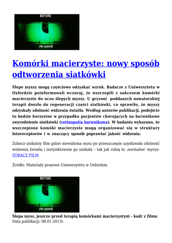 Komórki macierzyste: nowy sposób odtworzenia siatkówki Ślepe myszy mogą częściowo odzyskać wzrok. Badacze z Uniwersytetu w Oxfordzie poinformowali wczoraj, że wszczepili z sukcesem komórki macierzyste do oczu ślepych myszy. U gryzoni poddanych nowatorskiej terapii doszło do regeneracji części siatkówki, co sprawiło, że myszy odzyskały zdolność widzenia światła. Według autorów publikacji, podejście to będzie korzystne w przypadku pacjentów chorujących na barwnikowe zwyrodnienie siatkówki (retinopatia barwnikowa). W badaniu wykazano, że wszczepione komóki macierzyste mogą organizować się w struktury fotoreceptorów i w znaczący sposób poprawiać jakość widzenia. Zobacz unikalny film gdzie niewidoma mysz po przeszczepie uzyskiwała zdolność widzenia światła i instynktownie go unikała – tak jak robią to ‚normalne’ myszy: ZOBACZ FILM Źródło: Materiały prasowe Uniwersytetu w Oxfordzie. Ślepa mysz, jeszcze przed terapią komórkami macierzystyni - kadr z filmu Data publikacji: 08.01.2013r.