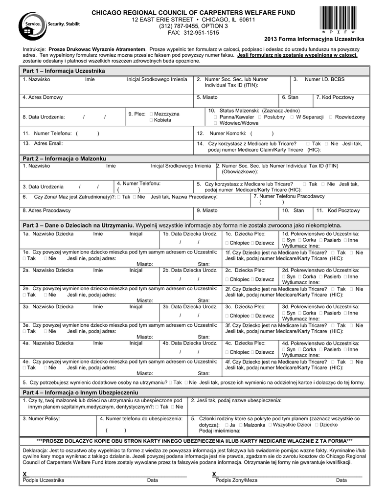 CHICAGO REGIONAL COUNCIL OF CARPENTERS WELFARE FUND 12 EAST ERIE STREET • CHICAGO, IL 60611 (312) 787-9455, OPTION 3 FAX: 312-951-1515 *PIF* 2013 Forma Informacyjna Uczestnika Instrukcje: Prosze Drukowac Wyraznie Atramentem. Prosze wypelnic ten formularz w calosci, podpisac i odeslac do urzedu funduszu na powyzszy adres. Ten wypelniony formularz rowniez mozna przeslac faksem pod powyzszy numer faksu. Jesli formularz nie zostanie wypelniona w calosci, zostanie odeslany i platnosci wszelkich roszczen zdrowotnych beda opoznione. Part 1 – Informacja Uczestnika 1. Nazwisko Imie Inicjal Srodkowego Imienia 4. Adres Domowy 2. Numer Soc. Sec. lub Numer Individual Tax ID (ITIN): 3. 5. Miasto 8. Data Urodzenia: / 11. Numer Telefonu: ( 7. Kod Pocztowy 10. Status Malzenski: (Zaznacz Jedno) Panna/Kawaler Poslubny W Separacji Wdowiec/Wdowa 9. Plec: Mezczyzna Kobieta / 6. Stan Numer I.D. BCBS ) 12. Numer Komorki: ( Rozwiedzony ) 14. Czy korzystasz z Medicare lub Tricare? Tak Nie Jesli tak, podaj numer Medicare Claim/Karty Tricare (HIC): 13. Adres Email: Part 2 – Informacja o Malzonku 1. Nazwisko 3. Data Urodzenia 6. Imie / Inicjal Srodkowego Imienia 2. Numer Soc. Sec. lub Numer Individual Tax ID (ITIN) (Obowiazkowe): 5. Czy korzystasz z Medicare lub Tricare? Tak Nie Jesli tak, podaj numer Medicare/Karty Tricare (HIC): 7. Numer Telefonu Pracodawcy Jesli tak, Nazwa Pracodawcy: ( ) 4. Numer Telefonu: / ( ) Czy Zona/ Maz jest Zatrudniona(y)?: Tak Nie 8. Adres Pracodawcy 9. Miasto 10. Stan 11. Kod Pocztowy Part 3 – Dane o Dzieciach na Utrzymaniu. Wypelnij wszystkie informacje aby forma nie zostala zwrocona jako niekompletna. 1a. Nazwisko Dziecka Imie 1b. Data Dziecka Urodz. Inicjal / 1e. Czy powyzej wymienione dziecko mieszka pod tym samym adresem co Uczestnik: Tak Nie Jesli nie, podaj adres: Miasto: Stan: 2b. Data Dziecka Urodz. 2a. Nazwisko Dziecka Imie Inicjal / / 2e. Czy powyzej wymienione dziecko mieszka pod tym samym adresem co Uczestnik: Tak Nie Jesli nie, podaj adres: Miasto: Stan: 3b. Data Dziecka Urodz. 3a. Nazwisko Dziecka Imie Inicjal / 1d. Pokrewienstwo do Uczestnika: Syn Corka Pasierb Inne Wytlumacz Inne: 1f. Czy Dziecko jest na Medicare lub Tricare? Tak Nie Jesli tak, podaj numer Medicare/Karty Tricare (HIC): 2c. Dziecka Plec: 2d. Pokrewienstwo do Uczestnika: Syn Corka Pasierb Inne Chlopiec Dziewcz Wytlumacz Inne: 2f. Czy Dziecko jest na Medicare lub Tricare? Tak Nie Jesli tak, podaj numer Medicare/Karty Tricare (HIC): 3c. Dziecka Plec: 3d. Pokrewienstwo do Uczestnika: Syn Corka Pasierb Inne Wytlumacz Inne: 3f. Czy Dziecko jest na Medicare lub Tricare? Tak Nie Jesli tak, podaj numer Medicare/Karty Tricare (HIC): Chlopiec Dziewcz / 3e. Czy powyzej wymienione dziecko mieszka pod tym samym adresem co Uczestnik: Tak Nie Jesli nie, podaj adres: Miasto: Stan: 4b. Data Dziecka Urodz. 4a. Nazwisko Dziecka Imie Inicjal / 1c. Dziecka Plec: Chlopiec Dziewcz / / 4e. Czy powyzej wymienione dziecko mieszka pod tym samym adresem co Uczestnik: Tak Nie Jesli nie, podaj adres: Miasto: Stan: 4c. Dziecka Plec: 4d. Pokrewienstwo do Uczestnika: Syn Corka Pasierb Inne Chlopiec Dziewcz Wytlumacz Inne: 4f. Czy Dziecko jest na Medicare lub Tricare? Tak Nie Jesli tak, podaj numer Medicare/Karty Tricare (HIC): 5. Czy potrzebujesz wymienic dodatkowe osoby na utrzymaniu? Tak Nie Jesli tak, prosze ich wymienic na oddzielnej kartce i dolaczyc do tej formy. Part 4 – Informacja o Innym Ubezpieczeniu 1. Czy ty, twoj malzonek lub dzieci na utrzymaniu sa ubespieczone pod innym planem szpitalnym,medycznym, dentystycznym?: Tak Nie 2. Jesli tak, podaj nazwe ubespieczenia: 3. Numer Polisy: 5. Czlonki rodziny ktore sa pokryte pod tym planem (zaznacz wszystkie co dotycza): Ja Malzonka Wszystkie Dzieci Dziecko Podaj imie/imiona: 4. Numer telefonu do ubespieczenia: ( ) ***PROSZE DOLACZYC KOPIE OBU STRON KARTY INNEGO UBEZPIECZENIA I/LUB KARTY MEDICARE WLACZNIE Z TA FORMA*** Deklaracja: Jest to oszustwo aby wypelniac ta forme z wiedza ze powyzsza informacja jest falszywa lub swiadomie pomijac wazne fakty. Kryminalne i/lub cywilne kary moga wyniknac z takiego dzialania. Jezeli powyzej podana informacja jest nie prawda, zgadzam sie do zwrotu kosztow do Chicago Regional Council of Carpenters Welfare Fund ktore zostaly wywolane przez ta falszywie podana informacja. Otrzymanie tej formy nie gwarantuje kwalifikacji. X_________________________________________________________ Podpis Uczestnika Data X____________________________________________________ Podpis Zony/Meza Data