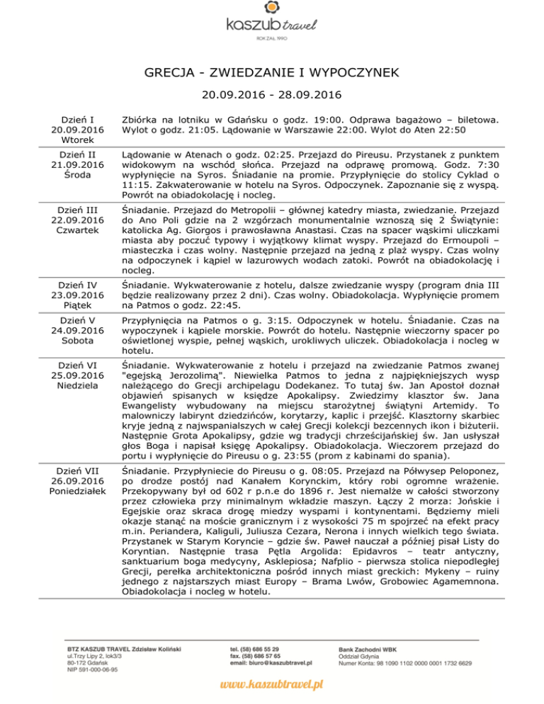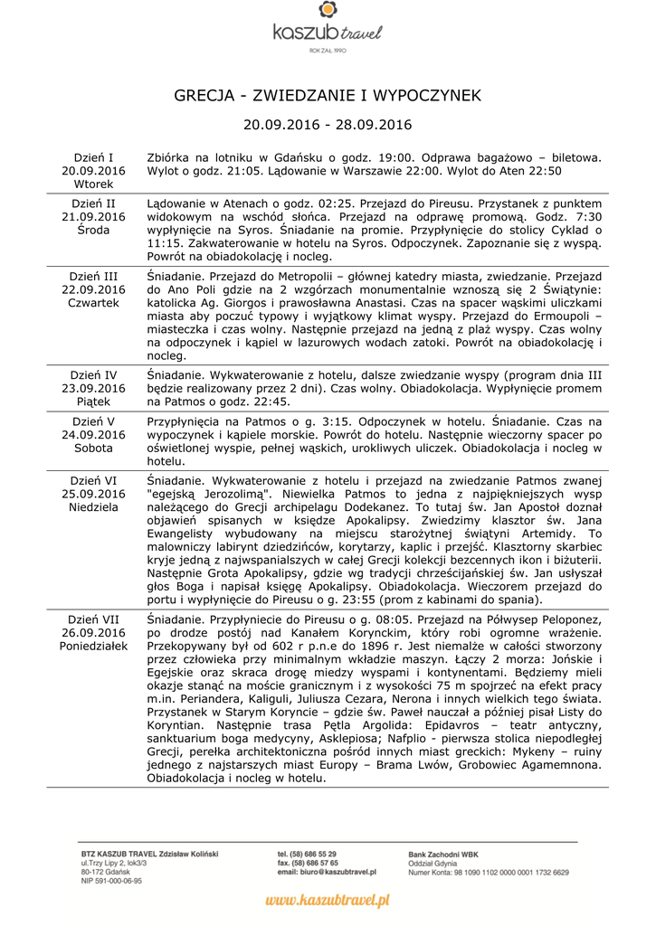 GRECJA - ZWIEDZANIE I WYPOCZYNEK 20.09.2016 - 28.09.2016 Dzień I 20.09.2016 Wtorek Zbiórka na lotniku w Gdańsku o godz. 19:00. Odprawa bagażowo – biletowa. Wylot o godz. 21:05. Lądowanie w Warszawie 22:00. Wylot do Aten 22:50 Dzień II 21.09.2016 Środa Lądowanie w Atenach o godz. 02:25. Przejazd do Pireusu. Przystanek z punktem widokowym na wschód słońca. Przejazd na odprawę promową. Godz. 7:30 wypłynięcie na Syros. Śniadanie na promie. Przypłynięcie do stolicy Cyklad o 11:15. Zakwaterowanie w hotelu na Syros. Odpoczynek. Zapoznanie się z wyspą. Powrót na obiadokolację i nocleg. Dzień III 22.09.2016 Czwartek Śniadanie. Przejazd do Metropolii – głównej katedry miasta, zwiedzanie. Przejazd do Ano Poli gdzie na 2 wzgórzach monumentalnie wznoszą się 2 Świątynie: katolicka Ag. Giorgos i prawosławna Anastasi. Czas na spacer wąskimi uliczkami miasta aby poczuć typowy i wyjątkowy klimat wyspy. Przejazd do Ermoupoli – miasteczka i czas wolny. Następnie przejazd na jedną z plaż wyspy. Czas wolny na odpoczynek i kąpiel w lazurowych wodach zatoki. Powrót na obiadokolację i nocleg. Dzień IV 23.09.2016 Piątek Śniadanie. Wykwaterowanie z hotelu, dalsze zwiedzanie wyspy (program dnia III będzie realizowany przez 2 dni). Czas wolny. Obiadokolacja. Wypłynięcie promem na Patmos o godz. 22:45. Dzień V 24.09.2016 Sobota Przypłynięcia na Patmos o g. 3:15. Odpoczynek w hotelu. Śniadanie. Czas na wypoczynek i kąpiele morskie. Powrót do hotelu. Następnie wieczorny spacer po oświetlonej wyspie, pełnej wąskich, urokliwych uliczek. Obiadokolacja i nocleg w hotelu. Dzień VI 25.09.2016 Niedziela Śniadanie. Wykwaterowanie z hotelu i przejazd na zwiedzanie Patmos zwanej "egejską Jerozolimą". Niewielka Patmos to jedna z najpiękniejszych wysp należącego do Grecji archipelagu Dodekanez. To tutaj św. Jan Apostoł doznał objawień spisanych w księdze Apokalipsy. Zwiedzimy klasztor św. Jana Ewangelisty wybudowany na miejscu starożytnej świątyni Artemidy. To malowniczy labirynt dziedzińców, korytarzy, kaplic i przejść. Klasztorny skarbiec kryje jedną z najwspanialszych w całej Grecji kolekcji bezcennych ikon i biżuterii. Następnie Grota Apokalipsy, gdzie wg tradycji chrześcijańskiej św. Jan usłyszał głos Boga i napisał księgę Apokalipsy. Obiadokolacja. Wieczorem przejazd do portu i wypłynięcie do Pireusu o g. 23:55 (prom z kabinami do spania). Dzień VII 26.09.2016 Poniedziałek Śniadanie. Przypłyniecie do Pireusu o g. 08:05. Przejazd na Półwysep Peloponez, po drodze postój nad Kanałem Korynckim, który robi ogromne wrażenie. Przekopywany był od 602 r p.n.e do 1896 r. Jest niemalże w całości stworzony przez człowieka przy minimalnym wkładzie maszyn. Łączy 2 morza: Jońskie i Egejskie oraz skraca drogę miedzy wyspami i kontynentami. Będziemy mieli okazje stanąć na moście granicznym i z wysokości 75 m spojrzeć na efekt pracy m.in. Periandera, Kaliguli, Juliusza Cezara, Nerona i innych wielkich tego świata. Przystanek w Starym Koryncie – gdzie św. Paweł nauczał a później pisał Listy do Koryntian. Następnie trasa Pętla Argolida: Epidavros – teatr antyczny, sanktuarium boga medycyny, Asklepiosa; Nafplio - pierwsza stolica niepodległej Grecji, perełka architektoniczna pośród innych miast greckich: Mykeny – ruiny jednego z najstarszych miast Europy – Brama Lwów, Grobowiec Agamemnona. Obiadokolacja i nocleg w hotelu. Dzień VIII 27.09.2016 Wtorek Śniadanie. Zwiedzanie Aten: Akropol, Areopag, gdzie św. Paweł przemawiał do Ateńczyków, Agora, Świątynia Ateny Nike, Propyleje i Erechtejon oraz rozrywkowo – rzemieślnicza dzielnica Plake, Plac Syntagma – z grobem Nieznanego Żołnierza, świątynie Zeusa Olimpijskiego. Zobaczymy teatralną zmianę warty oraz słynny stadion Panatenajski z IV w p.n.e, na którym miało miejsce otwarcie nowożytnych igrzysk olimpijskich. Obiadokolacja i odpoczynek w hotelu. Przejazd na lotnisko w Atenach. Dzień IX 28.09.2016 Środa Odprawa bagażowa- biletowa o godz. 02:00 Wylot do Polski o godz. 04:40. Lądowanie w Warszawie 6:20. Wylot do Gdańska 7:30. Lądowanie w Gdańsku 8:25. Zakończenie pielgrzymki. CENA: 560 EURO + bilet lotniczy ŚWIADCZENIA: • • • • • • • • • przelotu samolotem na trasie Gdańsk - Ateny oraz Ateny – Gdańsk przejazdy autokarem turystycznym zgodnie z programem 5 noclegów, w hotelach w pokojach 2 osobowych z WC i łazienką 1 nocleg na promie Patmos – Pireus w kabinach 4 osobowych 7 śniadań 7 obiadokolacji Promy: Pireus – Syros, Syros – Patmos ubezpieczenie KL, NNW i bagażu w Signal Iduna – obejmujący choroby przewlekłe opieka pilota, przewodnika na terenie Grecji CENA NIE ZAWIERA: • • • • biletów wstępu do zwiedzanych obiektów biletów komunikacji miejskiej indywidualnego nagłośnienia napojów do obiadokolacji UWAGI: • • • • każdego dnia Msza św. zgodnie z ustaleniami z Opiekunem Duchowym zastrzega się możliwość zmiany kolejności zwiedzanych obiektów organizator nie odpowiada za nieprzewidziane zmiany niezależne od niego dopłata do pokoju 1 osobowego