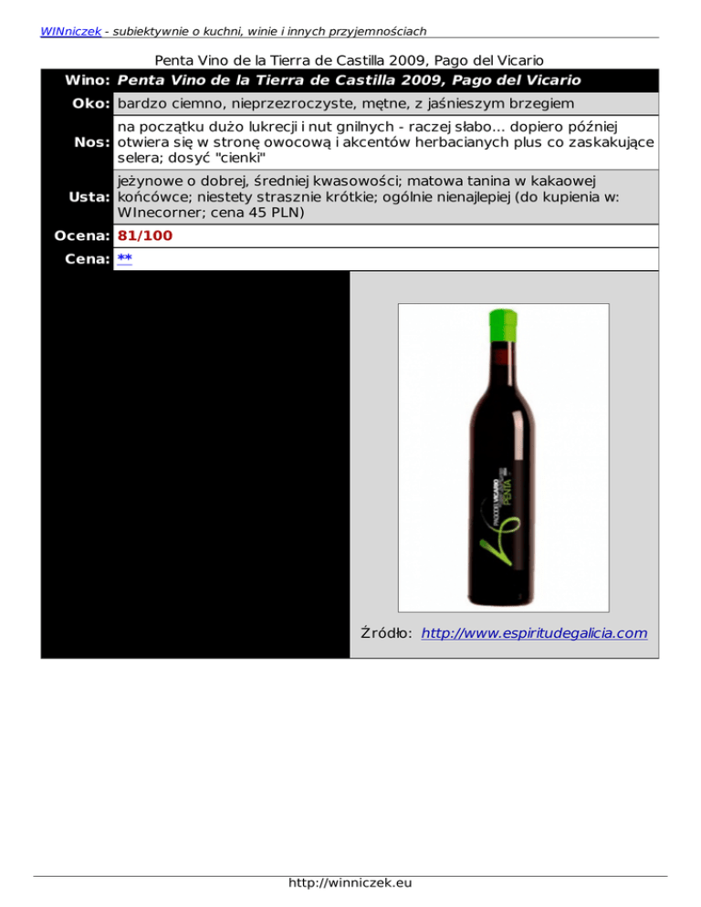 WINniczek - subiektywnie o kuchni, winie i innych przyjemnościach Penta Vino de la Tierra de Castilla 2009, Pago del Vicario Wino: Penta Vino de la Tierra de Castilla 2009, Pago del Vicario Oko: bardzo ciemno, nieprzezroczyste, mętne, z jaśnieszym brzegiem na początku dużo lukrecji i nut gnilnych - raczej słabo... dopiero później Nos: otwiera się w stronę owocową i akcentów herbacianych plus co zaskakujące selera; dosyć "cienki" jeżynowe o dobrej, średniej kwasowości; matowa tanina w kakaowej Usta: końcówce; niestety strasznie krótkie; ogólnie nienajlepiej (do kupienia w: WInecorner; cena 45 PLN) Ocena: 81/100 Cena: ** Etykieta zdjęcie Źródło: http://www.espiritudegalicia.com http://winniczek.eu