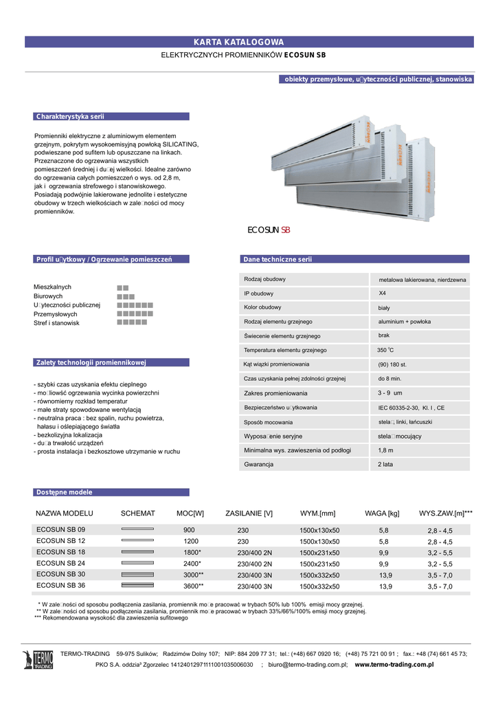 KARTA KATALOGOWA ELEKTRYCZNYCH PROMIENNIKÓW ECOSUN SB obiekty przemysłowe, użyteczności publicznej, stanowiska Charakterystyka serii Promienniki elektryczne z aluminiowym elementem grzejnym, pokrytym wysokoemisyjną powłoką SILICATING, podwieszane pod sufitem lub opuszczane na linkach. Przeznaczone do ogrzewania wszystkich pomieszczeń średniej i dużej wielkości. Idealne zarówno do ogrzewania całych pomieszczeń o wys. od 2,8 m, jak i ogrzewania strefowego i stanowiskowego. Posiadają podwójnie lakierowane jednolite i estetyczne obudowy w trzech wielkościach w zależności od mocy promienników. ECOSUN SB Profil użytkowy / Ogrzewanie pomieszczeń Dane techniczne serii Mieszkalnych Biurowych Użyteczności publicznej Przemysłowych Stref i stanowisk Zalety technologii promiennikowej - szybki czas uzyskania efektu cieplnego - możliowść ogrzewania wycinka powierzchni - równomierny rozkład temperatur - małe straty spowodowane wentylacją - neutralna praca : bez spalin, ruchu powietrza, hałasu i oślepiającego światła - bezkolizyjna lokalizacja - duża trwałość urządzeń - prosta instalacja i bezkosztowe utrzymanie w ruchu Rodzaj obudowy metalowa lakierowana, nierdzewna IP obudowy X4 Kolor obudowy biały Rodzaj elementu grzejnego aluminium + powłoka Świecenie elementu grzejnego brak Temperatura elementu grzejnego 350 0C Kąt wiązki promieniowania (90) 180 st. Czas uzyskania pełnej zdolności grzejnej do 8 min. Zakres promieniowania 3 - 9 um Bezpieczeństwo użytkowania IEC 60335-2-30, Kl. I , CE Sposób mocowania stelaż, linki, łańcuszki Wyposażenie seryjne stelaż mocujący Minimalna wys. zawieszenia od podłogi 1,8 m Gwarancja 2 lata Dostępne modele NAZWA MODELU SCHEMAT MOC[W] ZASILANIE [V] WYM.[mm] WAGA [kg] WYS.ZAW.[m]*** ECOSUN SB 09 900 230 1500x130x50 5,8 2,8 - 4,5 ECOSUN SB 12 1200 230 1500x130x50 5,8 2,8 - 4,5 ECOSUN SB 18 1800* 230/400 2N 1500x231x50 9,9 3,2 - 5,5 ECOSUN SB 24 2400* 230/400 2N 1500x231x50 9,9 3,2 - 5,5 ECOSUN SB 30 3000** 230/400 3N 1500x332x50 13,9 3,5 - 7,0 ECOSUN SB 36 3600** 230/400 3N 1500x332x50 13,9 3,5 - 7,0 * W zależności od sposobu podłączenia zasilania, promiennik może pracować w trybach 50% lub 100% emisji mocy grzejnej. ** W zależności od sposobu podłączenia zasilania, promiennik może pracować w trybach 33%/66%/100% emisji mocy grzejnej. *** Rekomendowana wysokość dla zawieszenia sufitowego TERMO TRADING TERMO-TRADING 59-975 Sulików; Radzimów Dolny 107; NIP: 884 209 77 31; tel.: (+48) 667 0920 16; (+48) 75 721 00 91 ; fax.: +48 (74) 661 45 73; PKO S.A. oddzia³ Zgorzelec 14124012971111001035006030 ; [email protected]; www.termo-trading.com.pl