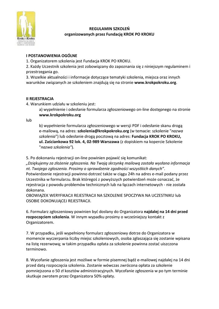 REGULAMIN SZKOLEŃ organizowanych przez Fundację KROK PO KROKU I POSTANOWIENIA OGÓLNE 1. Organizatorem szkolenia jest Fundacja KROK PO KROKU. 2. Każdy Uczestnik szkolenia jest zobowiązany do zapoznania się z niniejszym regulaminem i przestrzegania go. 3. Wszelkie aktualności i informacje dotyczące tematyki szkolenia, miejsca oraz innych warunków związanych ze szkoleniem znajdują się na stronie www.krokpokroku.org. II REJESTRACJA 4. Warunkiem udziału w szkoleniu jest: a) wypełnienie i odesłanie formularza zgłoszeniowego on-line dostępnego na stronie www.krokpokroku.org lub b) wypełnienie formularza zgłoszeniowego w wersji PDF i odesłanie skanu drogą e-mailową, na adres: [email protected] (w temacie: szkolenie "nazwa szkolenia") lub odesłanie drogą pocztową na adres: Fundacja KROK PO KROKU, ul. Zaściankowa 92 lok. 4, 02-989 Warszawa (z dopiskiem na kopercie Szkolenie "nazwa szkolenia"). 5. Po dokonaniu rejestracji on-line powinien pojawić się komunikat: „Dziękujemy za złożenie zgłoszenia. Na Twoją skrzynkę mailową została wysłana informacja nt. Twojego zgłoszenia. Prosimy o sprawdzenie zgodności wszystkich danych”. Potwierdzenie rejestracji powinno dotrzeć także w ciągu 24h na adres e-mail podany przez Uczestnika w formularzu. Brak któregoś z powyższych potwierdzeń może oznaczać, że rejestracja z powodu problemów technicznych lub na łączach internetowych - nie została dokonana. OBOWIĄZEK WERYFIKACJI REJESTRACJI NA SZKOLENIE SPOCZYWA NA UCZESTNIKU lub OSOBIE DOKONUJĄCEJ REJESTRACJI. 6. Formularz zgłoszeniowy powinien być dosłany do Organizatora najdalej na 14 dni przed rozpoczęciem szkolenia. W innym wypadku prosimy o wcześniejszy kontakt z Organizatorem. 7. W przypadku, jeśli wypełniony formularz zgłoszeniowy dotrze do Organizatora w momencie wyczerpania liczby miejsc szkoleniowych, osoba zgłaszająca się zostanie wpisana na listę rezerwową; w takim przypadku opłata za szkolenie powinna zostać uiszczona terminowo. 8. Wycofanie zgłoszenia jest możliwe w formie pisemnej bądź e-mailowej najdalej na 14 dni przed datą rozpoczęcia szkolenia. Zostanie wówczas zwrócona opłata za szkolenie pomniejszona o 50 zł kosztów administracyjnych. Wycofanie zgłoszenia w po tym terminie skutkuje zwrotem przez Organizatora 50% opłaty. 9. W przypadku odwołania szkolenia, zmiany daty szkolenia przez Organizatora lub niezakwalifikowania się osoby na szkolenie z powodu wyczerpania liczby miejsc, Uczestnik otrzymuje zwrot pełnej wpłaconej kwoty. III PŁATNOŚĆ 10. W ciągu 7 dni od daty wysłania formularza Uczestnik powinien dokonać opłaty za szkolenie na numer konta: Fundacja KROK PO KROKU ul. Zaściankowa 92 lok.4, 02-989 Warszawa Volkswagen Bank direct 16 2130 0004 2001 0419 2704 0001 tytułem: szkolenie "nazwa szkolenia" za Imię Nazwisko NIEDOKONANIE WPŁATY W CIĄGU 7 DNI SKUTKUJE AUTOMATYCZNYM ANULOWANIEM ZGŁOSZENIA. 11. W przypadku zgłaszania większej liczby uczestników konieczna jest korespondencja emailowa z Organizatorem w celu przekazania nazwisk delegowanych osób oraz szczegółów zgłoszenia. 12. Organizator wystawia rachunek, który będzie do odbioru podczas szkolenia. Na prośbę Uczestnika rachunek może być wysłany wcześniej pocztą. 13. Rachunki wystawiane są na podstawie danych określonych przez Uczestnika w formularzu zgłoszeniowym. 14. Koszt udziału obejmuje uczestnictwo w szkoleniu, materiały szkoleniowe, zaświadczenie o uczestnictwie oraz przerwy kawowe. Posiłki oraz noclegi Uczestnicy zapewniają sobie we własnym zakresie. 15. Opłata za szkolenie nie zawiera ubezpieczenia oraz kosztów noclegów. Na prośbę Uczestnika Fundacja przedstawi ofertę noclegową w okolicznych hotelach. IV OBECNOŚĆ PODCZAS SZKOLENIA 16. Każdy Uczestnik zgłasza się w miejscu szkolenia do REJESTRACJI, gdzie zostanie zarejestrowany i otrzyma rachunek oraz materiały szkoleniowe. V INNE 17. Materiały szkoleniowe, które Uczestnicy otrzymują podczas szkolenia, są własnością intelektualną Fundacji KROK PO KROKU i zabrania się ich powielania, publikowania i rozpowszechniania bez zgody Organizatora. 18. Uczestnicy udzielają Fundacji KROK PO KROKU nieodpłatnego prawa do wykorzystywania zdjęć i filmów ze swoim wizerunkiem, wykonanych podczas szkolenia, bez konieczności każdorazowego ich zatwierdzania. Zgoda obejmuje wykorzystanie, utrwalanie, obróbkę i powielanie wykonanych zdjęć, za pośrednictwem dowolnego medium wyłącznie w celu zgodnym z prowadzoną przez Fundację KROK PO KROKU działalnością statutową. 19. Uczestnicy szkolenia wyrażają zgodę na przeprowadzanie ankiet ewaluacyjnych przed i po szkoleniu w celach monitorowania efektywności nauczania. 20. Podczas szkolenia zabronione jest filmowanie, nagrywanie i fotografowanie bez zgody Organizatora. 21. Organizator zastrzega sobie prawo do odwołania lub zmiany terminu szkolenia z ważnych przyczyn lub wprowadzenia drobnych zmian w jego programie. 22. Organizator nie ponosi odpowiedzialności za rzeczy zagubione bądź pozostawione podczas szkolenia. 23. Uczestnicy ponoszą pełną odpowiedzialność za dokonane przez siebie zniszczenia zarówno na terenie obiektów, w których prowadzone są działania związane ze szkoleniem, jak również w miejscach zakwaterowania. 24. Zarejestrowanie się w charakterze Uczestnika konferencji jest równoznaczne z zaakceptowaniem powyższego regulaminu. 25. Powyższy regulamin wchodzi w życie z dniem 25 lipca 2011r. W przypadku pytań lub wątpliwości prosimy o kontakt z Organizatorem: Fundacja KROK PO KROKU ul. Zaściankowa 92 lok. 4, 02-989 Warszawa www.krokpokroku.org e-mail: [email protected]