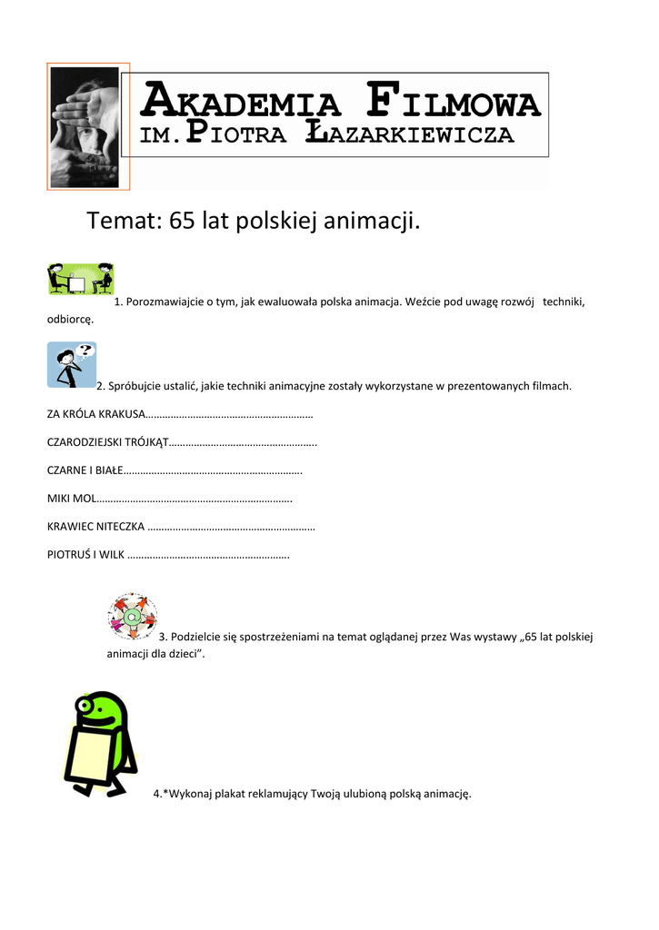 Temat: 65 lat polskiej animacji. 1. Porozmawiajcie o tym, jak ewaluowała polska animacja. Weźcie pod uwagę rozwój techniki, odbiorcę. 2. Spróbujcie ustalić, jakie techniki animacyjne zostały wykorzystane w prezentowanych filmach. ZA KRÓLA KRAKUSA…………………………………………………… CZARODZIEJSKI TRÓJKĄT…………………………………………….. CZARNE I BIAŁE………………………………………………………. MIKI MOL……………………………………………………………. KRAWIEC NITECZKA …………………………………………………… PIOTRUŚ I WILK …………………………………………………. 3. Podzielcie się spostrzeżeniami na temat oglądanej przez Was wystawy „65 lat polskiej animacji dla dzieci”. 4.*Wykonaj plakat reklamujący Twoją ulubioną polską animację. 5.* Opisz ulubionego bohatera polskiej animacji. Swoje prace przynieś do kina Echo lub wyślij na adres: [email protected] Przedstawimy je na stronie Szkolnej Akademii Filmowej www.akademia.jarocin.pl Przygotowała: Justyna Szczepaniak Projekt dofinansowano ze środków: Gminy Jarocin i Ministerstwa Kultury i Dziedzictwa Narodowego Kino ECHO im. P. Łazarkiewicza jest członkiem: