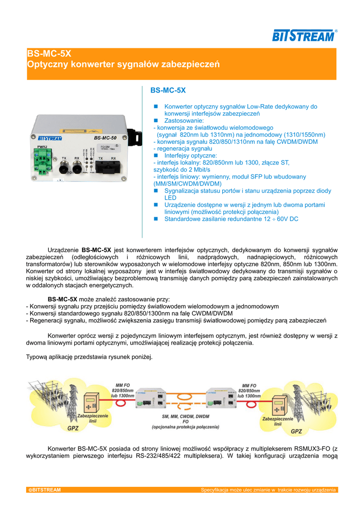 BS-MC-5X Optyczny konwerter sygnałów zabezpieczeń BS-MC-5X Konwerter optyczny sygnałów Low-Rate dedykowany do konwersji interfejsów zabezpieczeń Zastosowanie: - konwersja ze światłowodu wielomodowego (sygnał 820nm lub 1310nm) na jednomodowy (1310/1550nm) - konwersja sygnału 820/850/1310nm na falę CWDM/DWDM - regeneracja sygnału Interfejsy optyczne: - interfejs lokalny: 820/850nm lub 1300, złącze ST, szybkość do 2 Mbit/s - interfejs liniowy: wymienny, moduł SFP lub wbudowany (MM/SM/CWDM/DWDM) Sygnalizacja statusu portów i stanu urządzenia poprzez diody LED Urządzenie dostępne w wersji z jednym lub dwoma portami liniowymi (możliwość protekcji połączenia) Standardowe zasilanie redundantne 12 60V DC Urządzenie BS-MC-5X jest konwerterem interfejsów optycznych, dedykowanym do konwersji sygnałów zabezpieczeń (odległościowych i różnicowych linii, nadprądowych, nadnapięciowych, różnicowych transformatorów) lub sterowników wyposażonych w wielomodowe interfejsy optyczne 820nm, 850nm lub 1300nm. Konwerter od strony lokalnej wyposażony jest w interfejs światłowodowy dedykowany do transmisji sygnałów o niskiej szybkości, umożliwiający bezproblemową transmisję danych pomiędzy parą zabezpieczeń zainstalowanych w oddalonych stacjach energetycznych. BS-MC-5X może znaleźć zastosowanie przy: - Konwersji sygnału przy przejściu pomiędzy światłowodem wielomodowym a jednomodowym - Konwersji standardowego sygnału 820/850/1300nm na falę CWDM/DWDM - Regeneracji sygnału, możliwość zwiększenia zasięgu transmisji światłowodowej pomiędzy parą zabezpieczeń Konwerter oprócz wersji z pojedynczym liniowym interfejsem optycznym, jest również dostępny w wersji z dwoma liniowymi portami optycznymi, umożliwiającej realizację protekcji połączenia. Typową aplikację przedstawia rysunek poniżej. Konwerter BS-MC-5X posiada od strony liniowej możliwość współpracy z multiplekserem RSMUX3-FO (z wykorzystaniem pierwszego interfejsu RS-232/485/422 multipleksera). W takiej konfiguracji urządzenia mogą BITSTREAM Specyfikacja może ulec zmianie w trakcie rozwoju urządzenia zapewnić połączenie światłowodowe między parą zabezpieczeń/sterowników, z których jedno używa interfejsu światłowodowego RS232/422/485, natomiast drugie elektrycznego. Urządzenie zasilane jest z napięcia stałego z zakresu od 12 do 60V lub z zasilacza zewnętrznego dołączanego do urządzenia w przypadku napięcia przemiennego. Całkowity pobór mocy przez urządzenie nie przekracza 4 Wat. Urządzenie standardowo wyposażone w dodatkowe złącze zasilania w celu zapewnienia redundancji zasilania. PARAMETRY Porty optyczny lokalny: Wersja BS-MC-51: Złącze ST, 820nm, MM Szybkość transmisji 0 - 2Mbit/s Przybliżony zasięg transmisji (dla 62,5µm): 1500m Czułość: -25,4 dBm Moc optyczna: -18,8dBm (50µm), -16dBm (62,5µm), -12dBm (100µm), -7dBm (200µm) Porty optyczny liniowy: Wersja BS-MC-52: Złącze ST, 1300nm, MM Szybkość transmisji 0 – 2 Mbit/s Przybliżony zasięg transmisji (dla 62,5µm): 5000m Czułość: -21 dBm Moc optyczna: -17,0dBm (50µm), -14,0dBm (62,5µm) Wersja BS-MC-54: Złącze SC, 1310nm, SM Szybkość transmisji 0 - 2Mbit/s Przybliżony zasięg transmisji (dla 9/125µm): 10km Parametry mechaniczne: Wymiary 103x77x53mm Waga do 0,3 kg Wbudowany port optyczny lub slot SFP Szybkość transmisji 155Mbit/s Opcjonalny dodatkowy port optyczny dla protekcji połączenia SM, MM, WDM. Zasięgi w zależności do typu portu optycznego: 15km, 50km, 100km (1550nm) Dla wersji SFP parametry optyczne w zależności od modelu wkładki (MM/SM/CWDM/DWDM, pełna lista dostępnych modułów SFP pod adresem: www.bitstream.com.pl/sfp_bsmc50) Parametry zasilania: Zakres napięć zasilania: 12-60V DC, z izolacją galwaniczną, dołączany zewnętrzny zasilacz 230V AC (opcja) Pobór mocy do 4W Zasilanie redundantne w standardzie Złącze: terminal block, śrubowe 2x2, kątowe na przewód o przekroju 2.5 mm2 Parametry środowiskowe pracy: Temperatura pracy: +5C +40C Wilgotność: 80% w temperaturze +20ºC BS-MC-5X – S – (X) – (P) Protekcja połączenia - opcja Pole opcjonalne ważne tylko w przypadku wyboru interfejsu WDM w polu poprzedzającym: 1 – końcowy - 1310/1550 nm dla wersji WS/WM/WL lub 1550/1570 nm dla wersji WLL 2 – końcowy - 1550/1310 nm dla wersji WS/WM/WL lub 1570/1550 nm dla wersji WLL 3 – protekcja - 1310/1550 i 1550/1310 nm dla wersji WS/WM/WL lub 1550/1570 i1570/1550 nm dla wersji WLL Typ interfejsu: S – 1310 nm SM – zasięg 15/5 km* M – 1310 nm SM – zasięg do 50 km L – 1550 nm SM – zasięg do 100 km Interfejsy WDM (wymagane dodatkowe pole dla transceivera) WS – 1310/1550 i 1550/1310 nm SM/MM – zasięg do 20/5 km* WM – 1310/1550 i 1550/1310nm SM – zasięg do 40 km WL – 1310/1550 i 1550/1310 nm SM – zasięg do 60 km WLL – 1550/1570 i 1550/1570nm SM – zasięg do 100 km SFP – interfejs zrealizowany poprzez moduł SFP * - zasięg dla światłowodu MM jest orientacyjnym zależnym od rzeczywistych parametrów włókna. Typ interfejsu lokalnego: 1 – 820/850nm MM – zasięg do 1,5km, złącze ST/PC 2 – 1310nm MM – zasięg do 5km, złącze ST/PC 4 – 1310nm SM – zasięg do 10km, złącze SC/PC BITSTREAM Sp. z o.o. ul. Mełgiewska 7/9, 20-209 Lublin, Polska Tel. +48 81 743 86 43, Fax +48 81 442 02 98 [email protected] www.bitstream.com.pl BITSTREAM Specyfikacja może ulec zmianie w trakcie rozwoju urządzenia