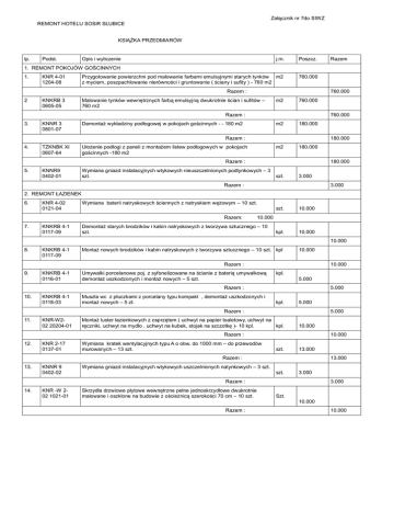 Załącznik nr 7do SIWZ REMONT HOTELU SOSiR SŁUBICE KSIĄŻKA PRZEDMIARÓW lp. Podst. Opis i wyliczenie j.m. Poszcz. Przygotowanie powierzchni pod malowanie farbami emulsyjnymi starych tynków m2 z myciem, poszpachlowanie nierówności i gruntowanie ( ściany i sufity ) - 760 m2 760.000 Razem 1. REMONT POKOJÓW GOŚCINNYCH 1. KNR 4-01 1204-08 Razem : 760.000 2 KNKRB 3 0605-05 Malowanie tynków wewnętrznych farbą emulsyjną dwukrotnie ścian i sufitów – 760 m2 3. KNNR 3 0801-07 Demontaż wykładziny podłogowej w pokojach gościnnych - - 180 m2 m2 760.000 m2 180.000 Razem : 760.000 Razem : 180.000 4. TZKNBK XI 0607-64 Ułożenie podłogi z paneli z montażem listew podłogowych w pokojach gościnnych -180 m2 5. KNNR9 0402-01 Wymiana gniazd instalacyjnych wtykowych nieuszczelnionych podtynkowych – 3 szt. m2 180.000 Razem : 180.000 szt. 3.000 Razem : 3.000 2. REMONT ŁAZIENEK 6. KNR 4-02 0121-04 Wymiana baterii natryskowych ściennych z natryskiem wężowym – 10 szt. KNKRB 4-1 0117-09 Demontaż starych brodzików i kabin natryskowych z tworzywa sztucznego – 10 szt. Razem: 7. szt. 10.000 kpl. 10.000 10.000 10.000 8. KNKRB 4-1 0117-09 Montaż nowych brodzików i kabin natryskowych z tworzywa sztucznego – 10 szt. kpl 10.000 Razem : 9. KNKRB 4-1 0116-01 Umywalki porcelanowe poj. z syfonelizowane na ścianie z baterią umywalkową demontaż uszkodzonych i montaż nowych – 5 szt. KNKRB 4-1 0118-03 Muszla wc z płuczkami z porcelany typu kompakt , demontaż uszkodzonych i montaż nowych – 5 zt. 10.000 kpl. 5.000 Razem ; 10. 5.000 kpl. 5.000 Razem : 11. KNR-W202 20204-01 5.000 Montaż luster łazienkowych z osprzętem ( uchwyt na papier toaletowy, uchwyt na ręczniki, uchwyt na mydło , uchwyt na kubek, stojak na szczotkę )- 10 kpl. kpl. 10.000 Razem : 12. KNR 2-17 0137-01 Wymiana kratek wentylacyjnych typu A o obw. do 1000 mm – do przewodów murowanych – 13 szt. KNNR 9 0402-02 Wymiana gniazd instalacyjnych wtykowych uszczelnionych natynkowych – 3 szt. 10.000 szt. 13.000 Razem : 13. 13.000 szt. 3.000 Razem : 14. KNR -W 202 1021-01 Skrzydła drzwiowe płytowe wewnętrzne pełne jednoskrzydłowe dwukrotnie malowane i oszklone na budowie z ościeżnicą szerokości 70 cm – 10 szt. 3.000 Szt. 10.000 Razem : 10.000