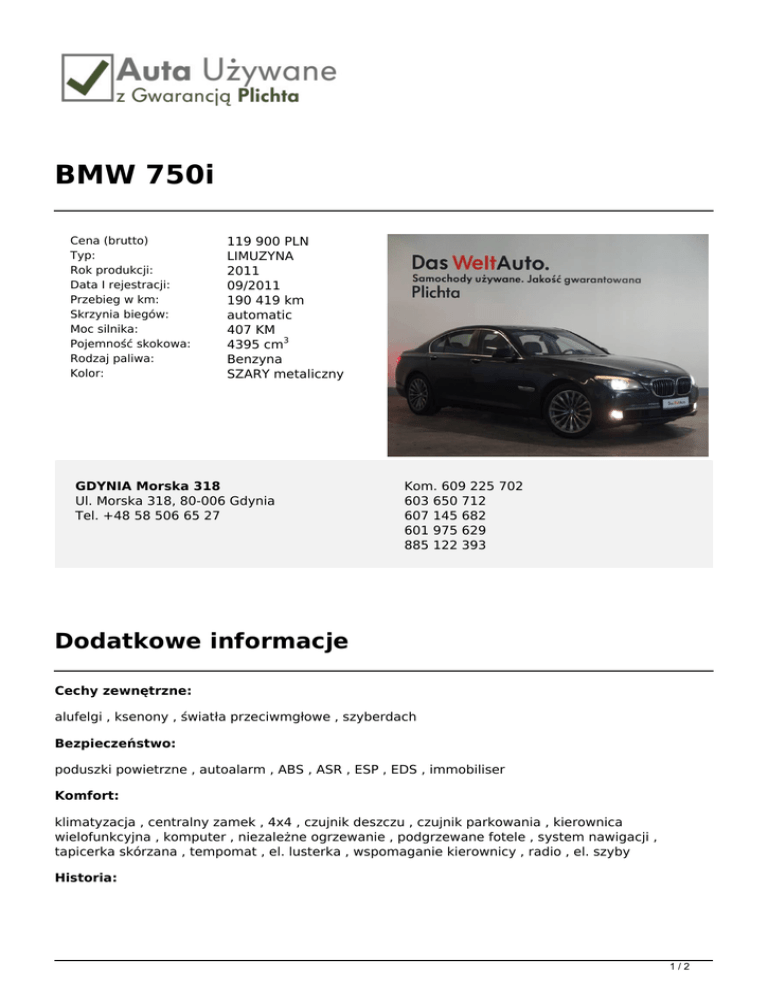 BMW 750i Cena (brutto) Typ: Rok produkcji: Data I rejestracji: Przebieg w km: Skrzynia biegów: Moc silnika: Pojemność skokowa: Rodzaj paliwa: Kolor: 119 900 PLN LIMUZYNA 2011 09/2011 190 419 km automatic 407 KM 4395 cm3 Benzyna SZARY metaliczny GDYNIA Morska 318 Ul. Morska 318, 80-006 Gdynia Tel. +48 58 506 65 27 Kom. 609 225 702 603 650 712 607 145 682 601 975 629 885 122 393 Dodatkowe informacje Cechy zewnętrzne: alufelgi , ksenony , światła przeciwmgłowe , szyberdach Bezpieczeństwo: poduszki powietrzne , autoalarm , ABS , ASR , ESP , EDS , immobiliser Komfort: klimatyzacja , centralny zamek , 4x4 , czujnik deszczu , czujnik parkowania , kierownica wielofunkcyjna , komputer , niezależne ogrzewanie , podgrzewane fotele , system nawigacji , tapicerka skórzana , tempomat , el. lusterka , wspomaganie kierownicy , radio , el. szyby Historia: 1/2 bezwypadkowy , serwisowany w ASO Gwarancja Szanowni Państwo, Pragniemy Państwa poinformować, iż firma Plichta – Autoryzowany Dealer Škoda Auto prowadzi skup oraz sprzedaż samochodów używanych wszystkich marek, oferując także samochody używane z gwarancją objęte programem „Auta używane z Gwarancją Plichta”. W ramach programu „Auta Używane z Gwarancją Plichta ” każdy Klient otrzymuje atrakcyjny pakiet zniżek pozwalający zoptymalizować koszty eksploatacji samochodu: -50% na serwis klimatyzacji -50% na ustawienie zbieżności -50% na kosmetykę auta -50% na ścieżkę diagnostyczną -25% na wymiany oleju -25% na zakup opon + 5zł na sezon za hotelowanie opon -15% na części i akcesoria Oferujemy również kompleksową obsługę w zakresie finansowania i ubezpieczenia: - kredyty już od 4,99% - leasingi i kredyty bez zaświadczeń - uproszczone procedury – decyzja już od 30 min. - atrakcyjne pakiety AC/OC/NW/ASS wiodących firm ubezpieczeniowych Możliwość pozostawienia dotychczas użytkowanego auta w rozliczeniu – BEZPŁATNA WYCENA!!! Zapraszamy wszystkich Klientów na jazdę próbną wybranym autem. Numer oferty: e094 Informacja nie stanowi oferty w rozumieniu art. 66 KC. Podane dane mają charakter wyłącznie informacyjny. 2/2 Powered by TCPDF (www.tcpdf.org)