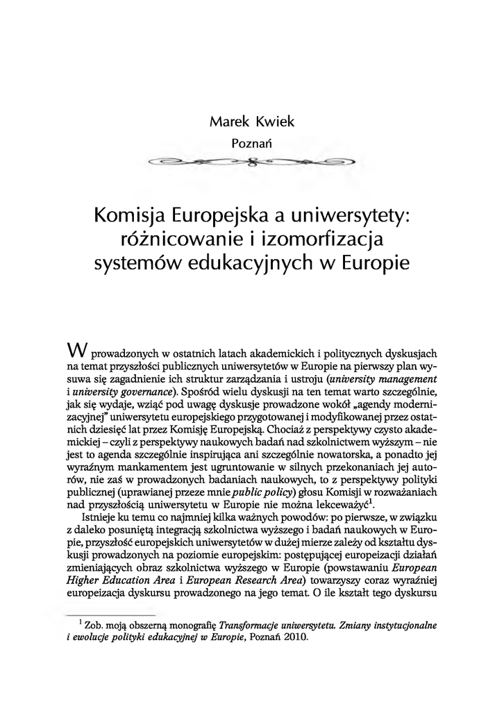 Marek Kwiek Poznań Komisja Europejska a uniwersytety: różnicowanie i izomorfizacja systemów edukacyjnych w Europie W prowadzonych w ostatnich latach akademickich i politycznych dyskusjach na temat przyszłości publicznych uniwersytetów w Europie na pierwszy plan wysuwa się zagadnienie ich struktur zarządzania i ustroju (university management i university governance). Spośród wielu dyskusji na ten temat warto szczególnie, jak się wydaje, wziąć pod uwagę dyskusje prowadzone wokół „agendy modernizacyjnej” uniwersytetu europejskiego przygotowanej i modyfikowanej przez ostatnich dziesięć lat przez Komisję Europejską. Chociaż z perspektywy czysto akademickiej – czyli z perspektywy naukowych badań nad szkolnictwem wyższym – nie jest to agenda szczególnie inspirująca ani szczególnie nowatorska, a ponadto jej wyraźnym mankamentem jest ugruntowanie w silnych przekonaniach jej autorów, nie zaś w prowadzonych badaniach naukowych, to z perspektywy polityki publicznej (uprawianej przeze mnie public policy) głosu Komisji w rozważaniach nad przyszłością uniwersytetu w Europie nie można lekceważyć1. Istnieje ku temu co najmniej kilka ważnych powodów: po pierwsze, w związku z daleko posuniętą integracją szkolnictwa wyższego i badań naukowych w Europie, przyszłość europejskich uniwersytetów w dużej mierze zależy od kształtu dyskusji prowadzonych na poziomie europejskim: postępującej europeizacji działań zmieniających obraz szkolnictwa wyższego w Europie (powstawaniu European Higher Education Area i European Research Area) towarzyszy coraz wyraźniej europeizacja dyskursu prowadzonego na jego temat. O ile kształt tego dyskursu 1 Zob. moją obszerną monografię Transformacje uniwersytetu. Zmiany instytucjonalne i ewolucje polityki edukacyjnej w Europie, Poznań 2010. 212 Marek Kwiek nie ma bezpośredniego wpływu na poszczególne instytucje i poszczególnych badaczy (i ma niewielki wpływ na kierunki badań naukowych nawet w takiej dziedzinie jak higher education research), o tyle ma on olbrzymi wpływ na rodzące się dzisiaj kierunki polityki edukacyjnej w poszczególnych krajach UE (oraz daleko poza UE – w ramach procesu bolońskiego integrującego kształcenie) oraz, może przede wszystkim, na sposoby myślenia – i tryby problematyzowania – całego szeregu zagadnień związanych z funkcjonowaniem uniwersytetów (finansowania, zarządzania, ustroju, kierunków badań priorytetowych etc.) przez policymakers, czyli decydentów politycznych. Integracja europejska jako projekt polityczny i gospodarczy coraz silnej obejmuje uniwersytety europejskie2. Po drugie, głos Komisji jest istotny, ponieważ doskonale współgra z globalnym myśleniem o przyszłości uniwersytetów i wyraża idee zbliżone do tych, które promuje na przykład OECD w odniesieniu do państw najbardziej rozwiniętych i Bank Światowy w odniesieniu do państw rozwijających się. Siła sprawcza dyskursu wspólnego najważniejszym globalnym i europejskim graczom w polityce reform szkolnictwa wyższego, w powiązaniu z mechanizmami finansowymi i pomocą techniczną oraz ekspercką jest bardzo poważna, zwłaszcza w kontekście powodu trzeciego – głoszonego powszechnie przez te instytucje (oraz stosunkowo szeroko przez nauki społeczne) paradygmatycznego przejścia do społeczeństwa i gospodarki opartych na wiedzy. W ramach nowego paradygmatu rola uniwersytetów jest kluczowa, ponieważ są one ujmowane jako narzędzia postępu technologicznego (poprzez transfer wiedzy i technologii) i siły napędowe rozwoju gospodarczego (poprzez badania naukowe, rozwój i innowacje). Powyższe trzy przyczyny (a ich katalog jest o wiele obszerniejszy) – rola integracji europejskiej, wspólny dyskurs globalny oraz idee społeczeństwa i gospodarki opartych na wiedzy – powodują, że prezentowane przez Komisję od dziesięciu lat ujęcie przyszłości uniwersytetu uznajemy tutaj za ważne. Ogólny obraz, jaki wyłania się z lektury jej najnowszych dokumentów, raportów, publikacji roboczych i komunikatów, jest taki, iż relacje między rządami i publicznymi instytucjami akademickimi wymagają dzisiaj głębokich zmian, a nie kosmetycznych modyfikacji. Dwa niedawne dokumenty, „Mobilising the Brainpower of Europe: Enabling Universities to Make Their Full Contribution to the Lisbon Strategy” oraz „Delivering on the Modernisation Agenda for Universities: Education, Research and Innovation” (oraz liczne dokumenty towarzyszące3), 2 Zob. zwłaszcza dwa niedawne tomy w bodaj najlepszej serii wydawniczej zajmującej się badaniami szkolnictwa wyższego (Springera Higher Education Dynamics): P. Maassen, J.P. Olsen (eds.), University Dynamics and European Integration, Dordrecht 2007, oraz A. Amaral, G. Neave, Ch. Musselin, P. Maassen (eds.), European Integration and the Governance of Higher Education and Research, Dordrecht 2009. 3 Zob. np.: Cluster ‘Modernisation of Higher Education’. Issue-paper on Governance, EC, Brussels 2006; European Universities: Enhancing Europe’s Research Base. Report by the Forum on University-based Research, DG Research, EC, Brussels 2005;„Education and Training 2010”. The Success of the Lisbon Strategy Hinges on UrgentReforms, COM(2003) 685 final, EC, Brussels 2003; The Role of Universities in the Europe of Knowledge, COM(2003)58, EC, Brussels 2003; Key Figures 2003-2004. Towards a European Research Komisja Europejska a uniwersytety 213 pokazują, że Komisja Europejska oczekuje radykalnych transformacji ustroju uczelni po to, aby umożliwić im pracę na rzecz tego komponentu strategii lizbońskiej, który określa się mianem „szybszy wzrost gospodarczy/więcej miejsc pracy” (chociaż szczegóły nowej strategii Komisji Europejskiej na lata 2010-2020 – zwanej Europe 2020 – dopiero się krystalizują, z dostępnej już dzisiaj dokumentacji i materiałów pomocniczych wynika, że rola uniwersytetów i szeroko pojętych badań nauk