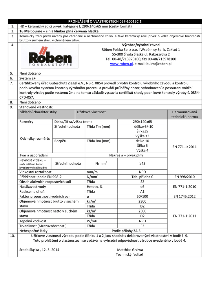 1. 2. 3. PROHLÁŠENÍ O VLASTNOSTECH 057-10015C.1 HD – keramický zdící prvek, kategorie I, 290x140x65 mm (český formát) 16 Melbourne – cihla klinker plná červená hladká Keramický zdící prvek určený pro chráněné a nechráněné zdivo, a také keramický zdící prvek o velké objemové hmotnosti brutto v suchém stavu v chráněném zdivu. 4. 5. 6. 7. 8. 9. Výrobce/výrobní závod Röben Polska Sp. z o.o. i Wspólnicy Sp. k. Zaklad 1 55-300 Środa Śląska ul. Rakoszycka 2 Tel. 00-48/713978100, fax 00-48/713978100 www.roben.pl, e-mail: [email protected] Není dotčeno Systém 2+ Certifikovaný úřad Güteschutz Ziegel e.V., NB č. 0854 provedl prvotní kontrolu výrobního závodu a kontrolu podnikového systému kontroly výrobního procesu a provádí průběžný dozor, vyhodnocení a posouzení vnitřní kontroly výroby podle systému 2+ a na tomto základě vystavila certifikát shody podnikové kontroly výroby č. 0854CPD-057. Není dotčeno Stanovené vlastnosti: Základní charakteristiky Užitkové vlastnosti Harmonizovaná technická norma Rozměry Délka/šířka/výška (mm) 290x140x65 Střední hodnota Třída Tm (mm) délka+5/-10 Šířka±5 Výška ±3 Odchylky rozměrů: Rozpětí Třída Rm (mm) délka 10 Šířka 6 EN 771-1: 2011 Výška 4 Tvar a uspořádání Nákres a – prvek plný Pevnost v tlaku – Střední hodnota N/mm2 ≥45 směr zatížení: kolmo k vodorovné spáře zdiva 10. Vlhkostní roztažnost mm/m NPD Přídržnost: podle EN 998-2 N/mm2 Tab. příloha C EN 998:2010 Obsah aktivních rozpustných solí Třída S2 Nasákavost vody Hmotn. % ≤6 EN 771-1:2010 Reakce na oheň: Třída A1 Faktor propustnosti vodních par μ 50/100 EN 1745:2012 3 Objemová hmotnost brutto v suchém kg/m 2300 stavu Třída D2 3 Objemová hmotnost netto v suchém kg/m 2300 stavu EN 771-1:2011 Třída D2 Tepelná vodivost W/mK NPD Trvanlivost (Mrazuvzdornost ) Třída F2 Nebezpečné látky Podle přílohy ZA.3 Užitkové vlastnosti výrobku podle článku 1 a 2 jsou shodné s deklarovanými vlastnostmi v bodě č. 9. Toto prohlášení o vlastnostech se vydává na výhradní odpovědnost výrobce uvedeného v bodě 4. Środa Śląska , 12. 5. 2014 Matthias Grziwa Technický ředitel DEKLARACJA WŁAŚCIWOŚCI UŻYTKOWYCH 057 – 10015C.1 1. HD – element murowy ceramiczny Kategoria I, 290 mm x 140 mm x 65 mm ( format czeski ) 2. 16 Melbourne – cegła klinkierowa pełna czerwona gładka 3. Element murowy ceramiczny przeznaczony do murów niezabezpieczonych, a także element murowy ceramiczny o dużej gęstości brutto w stanie suchym w murach zabezpieczonych. Producent / Zakład Produkujący Röben Polska Sp. z o.o. i Wspólnicy Sp. k. Zakład 1 4. 55 – 300 Środa Śląska ul. Rakoszycka 2 Tel. 00-48/71 39 78 100, Fax 00-48/71 39 78 100 www.roben.pl, e-mail : [email protected] 5. Nie dotyczy 6. System 2+ 7. Certyfikowana instytucja Güteschutz Ziegel e.V., NB Nr. 0854 przeprowadziła pierwsza inspekcję zakładu producenta oraz zakładowego systemu kontroli produkcji i prowadzi ciągły monitoring, ocenę i opiniowanie wewnętrznej kontroli produkcji według wymogów systemu 2+ i na tej podstawie wydała certyfikat zgodności Zakładowej Kontroli Produkcji Nr 0854-CPD-057. 8. Nie dotyczy 9. Deklarowane właściwości użytkowe Zharmonizowana specyfikacja techniczna Zasadnicze charakterystyki Właściwości użytkowe Wymiary Długość/szerokość/wysokość [mm] Średnia kategoria Tm [mm] Rozpiętość kategoria Rm [mm] Odchyłki wymiarów Kształt i budowa Wytrzymałość na ściskanie – kierunek obciązenia: Średnia prostopadle do poziomej spoiny w murze Rozszerzalność pod wpływem wilgoci 290/140/65 Długość + 5/-10 Szerokość ± 5 Wysokość ± 3 Długość 10 Szerokość 6 Wysokość 4 rysunek a – element pełny N/mm 2 mm/m EN 771-1:2011 ≥ 45 NPD Wytrzymałość spoiny wg EN 998-2 N/mm Zawartość aktywnych soli rozpuszczalnych Kategoria S2 Reakcja na ogień Klasa A1 Absorpcja wody % - wagowy ≤6 Współczynnik dyfuzji pary wodnej µ 50/100 2 3 Tab. Załącznik C kg/m 2300 Kategoria D2 EN 998:2010 EN 771-1:2011 EN 1745:2012 Gęstość brutto w stanie suchym 3 kg/m 2300 Kategoria D2 Współczynnik przewodzenia ciepła W/mK NPD Trwałość Kategoria F2 Substancje niebezpieczne załącznik ZA.3 Gęstość netto w stanie suchym EN 771-1:2011 Właściwośći użytkowe wyrobu określone w pkt 1 i 2 są zgodne z właściwościami użytkowymi deklarowanymi w pkt 9. 10. Niniejsza deklaracja właściwości użytkowych wydana zostaje na wyłączną odpowiedzialność producenta określonego w pkt 4. Środa Śląska 12.05.2014 Matthias Grziwa Dyrektor d/s Technicznych