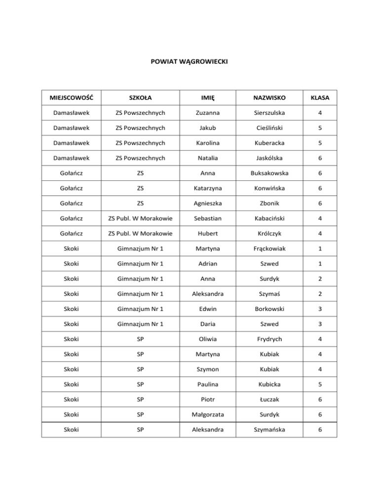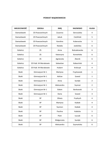 POWIAT WĄGROWIECKI MIEJSCOWOŚĆ SZKOŁA IMIĘ NAZWISKO KLASA Damasławek ZS Powszechnych Zuzanna Sierszulska 4 Damasławek ZS Powszechnych Jakub Cieśliński 5 Damasławek ZS Powszechnych Karolina Kuberacka 5 Damasławek ZS Powszechnych Natalia Jaskólska 6 Gołańcz ZS Anna Buksakowska 6 Gołańcz ZS Katarzyna Konwińska 6 Gołańcz ZS Agnieszka Zbonik 6 Gołańcz ZS Publ. W Morakowie Sebastian Kabaciński 4 Gołańcz ZS Publ. W Morakowie Hubert Królczyk 4 Skoki Gimnazjum Nr 1 Martyna Frąckowiak 1 Skoki Gimnazjum Nr 1 Adrian Szwed 1 Skoki Gimnazjum Nr 1 Anna Surdyk 2 Skoki Gimnazjum Nr 1 Aleksandra Szymaś 2 Skoki Gimnazjum Nr 1 Edwin Borkowski 3 Skoki Gimnazjum Nr 1 Daria Szwed 3 Skoki SP Oliwia Frydrych 4 Skoki SP Martyna Kubiak 4 Skoki SP Szymon Kubiak 4 Skoki SP Paulina Kubicka 5 Skoki SP Piotr Łuczak 6 Skoki SP Małgorzata Surdyk 6 Skoki SP Aleksandra Szymańska 6 Łekno SP w Łeknie Wiktor Andryszak 4 Łekno SP w Łeknie Maciej Lisiecki 5 Łekno SP w Łeknie Bartosz Wencel 5 Łekno SP w Łeknie Michał Baran 6 Wągrowiec Gimnazjum Nr 1 Julia Adamczewska 1 Wągrowiec Gimnazjum Nr 1 Julita Piechowiak 2 Wągrowiec Gimnazjum Nr 1 Magdalena Mantaj 3 Wągrowiec SP w Siennie Marta Radkiewicz 4 Wągrowiec SP w Siennie Paulina Siódmiak 4