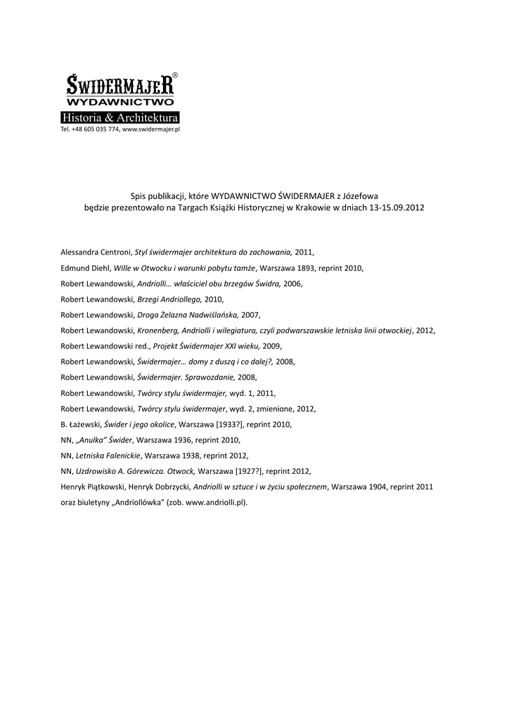 Spis publikacji, które WYDAWNICTWO ŚWIDERMAJER z Józefowa będzie prezentowało na Targach Książki Historycznej w Krakowie w dniach 13-15.09.2012 Alessandra Centroni, Styl świdermajer architektura do zachowania, 2011, Edmund Diehl, Wille w Otwocku i warunki pobytu tamże, Warszawa 1893, reprint 2010, Robert Lewandowski, Andriolli… właściciel obu brzegów Świdra, 2006, Robert Lewandowski, Brzegi Andriollego, 2010, Robert Lewandowski, Droga Żelazna Nadwiślańska, 2007, Robert Lewandowski, Kronenberg, Andriolli i wilegiatura, czyli podwarszawskie letniska linii otwockiej, 2012, Robert Lewandowski red., Projekt Świdermajer XXI wieku, 2009, Robert Lewandowski, Świdermajer… domy z duszą i co dalej?, 2008, Robert Lewandowski, Świdermajer. Sprawozdanie, 2008, Robert Lewandowski, Twórcy stylu świdermajer, wyd. 1, 2011, Robert Lewandowski, Twórcy stylu świdermajer, wyd. 2, zmienione, 2012, B. Łażewski, Świder i jego okolice, Warszawa [1933?], reprint 2010, NN, „Anulka” Świder, Warszawa 1936, reprint 2010, NN, Letniska Falenickie, Warszawa 1938, reprint 2012, NN, Uzdrowisko A. Górewicza. Otwock, Warszawa [1927?], reprint 2012, Henryk Piątkowski, Henryk Dobrzycki, Andriolli w sztuce i w życiu społecznem, Warszawa 1904, reprint 2011 oraz biuletyny „Andriollówka” (zob. www.andriolli.pl).
