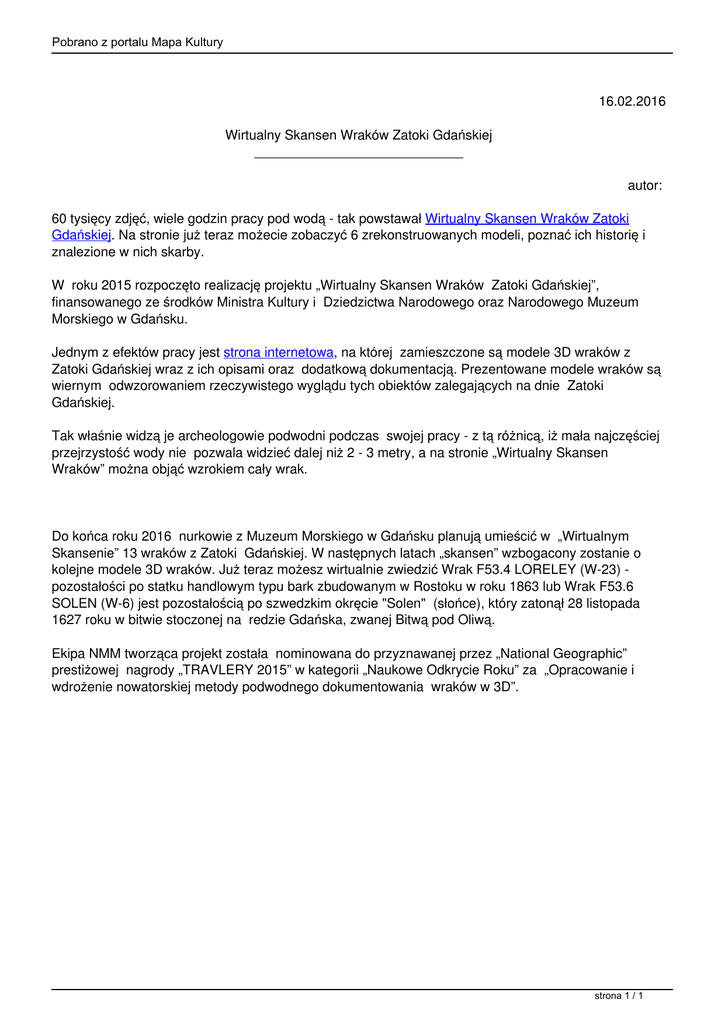 Pobrano z portalu Mapa Kultury 16.02.2016 Wirtualny Skansen Wraków Zatoki Gdańskiej ____________________________ autor: 60 tysięcy zdjęć, wiele godzin pracy pod wodą - tak powstawał Wirtualny Skansen Wraków Zatoki Gdańskiej. Na stronie już teraz możecie zobaczyć 6 zrekonstruowanych modeli, poznać ich historię i znalezione w nich skarby. W roku 2015 rozpoczęto realizację projektu „Wirtualny Skansen Wraków Zatoki Gdańskiej”, finansowanego ze środków Ministra Kultury i Dziedzictwa Narodowego oraz Narodowego Muzeum Morskiego w Gdańsku. Jednym z efektów pracy jest strona internetowa, na której zamieszczone są modele 3D wraków z Zatoki Gdańskiej wraz z ich opisami oraz dodatkową dokumentacją. Prezentowane modele wraków są wiernym odwzorowaniem rzeczywistego wyglądu tych obiektów zalegających na dnie Zatoki Gdańskiej. Tak właśnie widzą je archeologowie podwodni podczas swojej pracy - z tą różnicą, iż mała najczęściej przejrzystość wody nie pozwala widzieć dalej niż 2 - 3 metry, a na stronie „Wirtualny Skansen Wraków” można objąć wzrokiem cały wrak. Do końca roku 2016 nurkowie z Muzeum Morskiego w Gdańsku planują umieścić w „Wirtualnym Skansenie” 13 wraków z Zatoki Gdańskiej. W następnych latach „skansen” wzbogacony zostanie o kolejne modele 3D wraków. Już teraz możesz wirtualnie zwiedzić Wrak F53.4 LORELEY (W-23) pozostałości po statku handlowym typu bark zbudowanym w Rostoku w roku 1863 lub Wrak F53.6 SOLEN (W-6) jest pozostałością po szwedzkim okręcie "Solen" (słońce), który zatonął 28 listopada 1627 roku w bitwie stoczonej na redzie Gdańska, zwanej Bitwą pod Oliwą. Ekipa NMM tworząca projekt została nominowana do przyznawanej przez „National Geographic” prestiżowej nagrody „TRAVLERY 2015” w kategorii „Naukowe Odkrycie Roku” za „Opracowanie i wdrożenie nowatorskiej metody podwodnego dokumentowania wraków w 3D”. strona 1 / 1