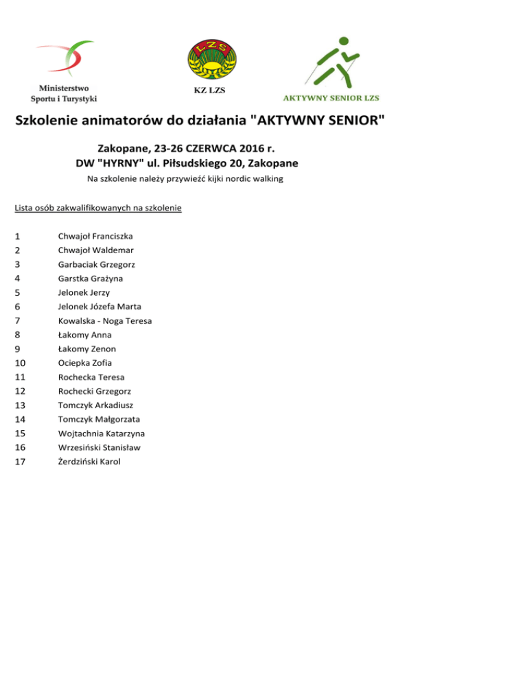 KZ LZS Szkolenie animatorów do działania "AKTYWNY SENIOR" Zakopane, 23-26 CZERWCA 2016 r. DW "HYRNY" ul. Piłsudskiego 20, Zakopane Na szkolenie należy przywieźć kijki nordic walking Lista osób zakwalifikowanych na szkolenie 1 2 3 4 5 6 7 8 9 10 11 12 13 14 15 16 17 Chwajoł Franciszka Chwajoł Waldemar Garbaciak Grzegorz Garstka Grażyna Jelonek Jerzy Jelonek Józefa Marta Kowalska - Noga Teresa Łakomy Anna Łakomy Zenon Ociepka Zofia Rochecka Teresa Rochecki Grzegorz Tomczyk Arkadiusz Tomczyk Małgorzata Wojtachnia Katarzyna Wrzesiński Stanisław Żerdziński Karol