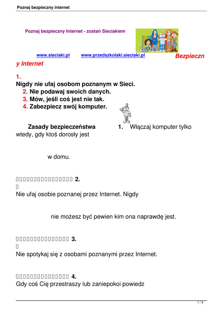 Poznaj bezpieczny internet Poznaj bezpieczny Internet - zostań Sieciakiem www.sieciaki.pl www.przedszkolaki.sieciaki.pl y Internet Bezpieczn 1. Nigdy nie ufaj osobom poznanym w Sieci. 2. Nie podawaj swoich danych. 3. Mów, jeśli coś jest nie tak. 4. Zabezpiecz swój komputer. Zasady bezpieczeństwa wtedy, gdy ktoś dorosły jest 1. Włączaj komputer tylko w domu. 2. Nie ufaj osobie poznanej przez Internet. Nigdy nie możesz być pewien kim ona naprawdę jest. 3. Nie spotykaj się z osobami poznanymi przez Internet. 4. Gdy coś Cię przestraszy lub zaniepokoi powiedz 1/3 Poznaj bezpieczny internet o tym dorosłemu. 5. Nie zdradzaj nikomu swojego imienia ani adresu! Nie mów też ile masz lat i do jakiej szkoły chodzisz. Nie podawaj numeru telefonu. 6. Wym yśl sobie jakiś fajny Nick, czyli internetowy pseudonim. 7. Używaj komunikatorów tylko do kontaktów ze znajomymi o których wiedzą twoi rodzice. Z komunikatorów i czatów korzystają też osoby o złych zamiarach i trzeba być bardzo ostrożnym. 8. Pomyśl kilka razy, zanim wyślesz wiadomość, e-mail czy sms, gdy klikniesz „wyślij”, nie można już tego cofnąć. 9. 2/3 Poznaj bezpieczny internet Nie dokuczaj innym. Pamiętaj, że w Internecie obowiązuje zasada nieużywania brzydkich słów. Traktuj innych tak, jak byś chciał by Ciebie traktowano. 10. Długie korzystanie z komputera szkodzi zdrowiu i może być powodem innych problemów, np. w szkole. Nie zapominaj o sporcie i innych zainteresowaniach nie związanych z komputerami i Internetem. 3/3