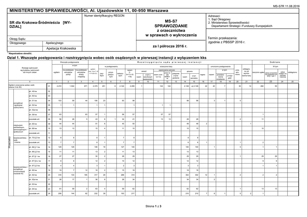 MS-S7R 11.08.2016 MINISTERSTWO SPRAWIEDLIWOŚCI, Al. Ujazdowskie 11, 00-950 Warszawa Numer identyfikacyjny REGON MS-S7 SPRAWOZDANIE z orzecznictwa w sprawach o wykroczenia SR dla Krakowa-Śródmieścia [WYDZIAL] Okręg Sądu: Okręgowego Okręgowego Adresaci: 1. Sąd Okręgowy 2. Ministerstwo Sprawiedliwości Departament Strategii i Funduszy Europejskich Apelacyjnego Termin przekazania: zgodnie z PBSSP 2016 r. za I półrocze 2016 r. Apelacja Krakowska w .............................................................................................................. *) Niepotrzebne skreślić. Dział 1. Wszczęte postępowania i rozstrzygnięcia wobec osób osądzonych w pierwszej instancji z wyłączeniem kks Wszczęto postępowanie Roz st rz ygni ęci a w tym Rodzaje wykroczeń wg kodeksu wykroczeń lub innych ustaw ogółem 0 Ogółem orzeczenia wobec osób (wiersz 2 do 50) 1 01 2 na podstawie wniosków straży miejskiej 3 ogółem (rubr. 5 do 7 =8 +17+20+21) 4 zwykłym przyspieszonym nakazowym 5 6 7 2.472 1.504 871 2.379 251 44 106 23 1 1 63 57 1 5 43 8 6 sądu pi erw sz ej in stancji razem (r. 9+11+15 +16) razem 8 9 ograniczenie wolności areszt 2.122 2.295 83 98 razem (rubr. w tym z 12+13) warunkowym zawieszeniem 10 1 11 prace na cele społeczne potrącenie z wynagrodzenia 12 13 124 124 1 1 1 56 57 57 57 34 41 13 13 w tym grzywna razem w tym samoistna 14 15 2.148 a) 2.148 98 98 28 28 02 03 art. 51 kw 04 103 59 art. 52 kw 05 1 1 art. 52a kw 06 art. 58 kw 07 63 pozostałe art. 08 56 28 art. 65 kw instytucjom państwowym, art. 66 kw samorządowym i społecznym pozostałe art. 09 44 44 51 6 45 50 48 48 10 13 13 15 4 11 15 15 15 art. 70 § 2 kw 12 8 8 8 1 7 8 8 8 pozostałe art. 13 7 7 8 1 7 7 6 6 art. 86 § 1 kw 14 129 129 146 19 127 140 140 140 art. 86 § 2 kw 15 11 11 13 2 11 13 13 13 art. 87 §1 kw 16 27 27 30 2 28 29 29 29 art. 87 §1a kw 17 8 8 12 2 10 12 12 12 18 4 4 3 1 19 19 7 12 18 2 bezpieczeństwu osób i mienia art. 87 § 2 kw bezpieczeństwu i porządkowi art. 90 kw w komunikacji (rozdział XI) art. 92 kw razem nagana 16 art. 50 kw 1 Środki karne umorzono postępowanie orzeczono kary art. 49 kw porządkowi i spokojowi publicznemu Przeciwko na podstawie wniosków policji w postępowaniu 17 22 przedawnienie orzekania 18 z 61§1 pkt2 19 W tym odstąpiono od zakaz orzeczono ogółem zakaz prowadzeodstąpiono wymiena nia pojazdów art. wstępu imprezę rzenia kary 28 § 1 pkt 1 uniewinniono masową 20 21 40 7 30 3 1 5 23 22 14 282 24 55 1 2 2 11 1 10 11 1 2 3 3 3 15 18 18 18 20 318 133 185 317 29 288 314 302 302 art. 92a kw 21 28 17 1 36 8 28 34 34 34 art. 93 kw 22 art. 94 kw 23 61 59 2 63 4 59 62 62 62 pozostałe art. 24 208 144 62 232 39 193 217 210 210 Strona 1 z 3 1 1 12 1 1 2 5 1 1 1 29 29 9 9 1 1 2 2 13 13 2 2 1 7 8 1 5 2 1 25 MS-S7R 11.08.2016 Dział 1. Wszczęte postępowania i rozstrzygnięcia wobec osób osądzonych w pierwszej instancji z wyłączeniem kks (dok.) Wszczęto postępowanie Roz st rz ygni ęci a w tym Rodzaje wykroczeń wg kodeksu wykroczeń lub innych ustaw ogółem 0 osobie (rozdział XII kw) 25 art. 105 kw 26 pozostałe art. 27 Przeciwko (dok.) zdrowiu (rozdział XIII kw art. 109 do 118) mieniu (rozdział XIV) interesom konsumentów (rozdział XV) na podstawie wniosków straży miejskiej 2 3 2 2 ogółem (rubr. 4 do 6 =8 +17+20+21) 4 zwykłym przyspieszonym nakazowym 5 6 7 5 4 pi erw sz ej in stancji Środki karne umorzono postępowanie areszt razem (r. 8+11+15 +16) razem w tym z warunkowym zawieszeniem 8 9 10 1 4 ograniczenie wolności potrąprace razem cenie na cele (rubr. z wynaspo12+13) grodzełeczne nia 11 12 13 w tym grzywna razem w tym samoistna 14 15 nagana 16 4 4 razem 17 439 436 431 38 392 417 371 371 12 30 10 10 12 3 9 9 9 9 3 art. 127 kw 31 pozostałe art. 32 29 28 28 3 25 26 26 26 1 art. 134 kw 33 3 3 3 3 3 art. 136 kw 34 pozostałe art. 35 7 9 2 7 8 36 189 141 48 204 12 192 201 7 7 art. 143 kw 37 3 2 1 1 1 1 1 1 pozostałe art. 38 36 10 26 34 5 29 19 uniewinniono 20 21 orzeczono ogółem 3 1 42 545 153 392 392 16 43 2 2 3 1 45 45 8 8 194 194 31 31 31 373 386 386 386 3 3 3 3 19 2 2 171 9 1 16 1 1 1 2 1 40 pozostałe art. 41 3 3 5 1 2 1 44 45 46 33 24 6 18 19 19 47 5 7 3 4 4 4 Ustawa z dnia 18 lipca 2002 r. o świadczeniu usług drogą elektroniczną (Dz. U. Nr 144, poz. 1204, z późn. zm.) art. 24 (spam) 48 Ustawa z dnia 20 marca 2009 r. o bezpieczeństwie imprez masowych (Dz. U. Nr 62, poz.504, z późn. zm.) 49 Pozostałe z kw i innych ustaw 50 Uwaga: wykroczenia pozostałe art. kw w wierszu 4 5 1 2 a) 61 21 08: 11: 13: 24: 27: 32: 35: 38: 41: 27 67 6 61 64 64 52b, 53 do 57, 59 do 64, 67 do 69, 70 § 1, 71 do 83, 84 do 85, 86 § 3, 88 do 89, 91, 95 do 103, 106 do 108, 119 do 123, 125 do 126, 128 do 131, 133, 135, 137 do 138, 144 do 145, 148 do 164, 166, Strona 2 z 3 64 2 1 1 zakaz prowadzenia pojazdów art. 28 § 1 pkt 1 23 22 39 art. 165 kw (kłusownictwo) Przeciwko ochronie środowiska (rozdział XIX kw), ustawy z dnia 16 kwietnia 2004 r. o ochronie przyrody (Dz. U. z 2009 r. Nr 151, poz. 1220, z późn. zm.), ustawy z dnia 18 kwietnia 1985 r. o rybołówstwie śródlądowym (Dz. U. z 2009 r. Nr 189, poz. 1471, z późn. zm.) i in. Sprawy z ustawy z dnia 27 sierpnia 2004 r. o świadczeniach opieki zdrowotnej finansowanych ze środków publicznych (Dz. U. z 2008 r. Nr 164, poz.1027, z późn. zm.) Ustawa z dnia 20 kwietnia art. 123 2004 r. o promocji zatrudnienia i instytucjach rynku pracy (Dz. U. z 2008 r. Nr 69, poz. pozostałe 415, z późn. zm.) Kodeks pracy art. 281283 z 61§1 pkt2 1 29 Ustawa z dnia 26 października 1982 r. o wychowaniu w trzeźwości i przeciwdziałaniu alkoholizmowi (Dz. U. z 2007 r. Nr 70, poz. 473, z późn. zm.) przedawnienie orzekania 18 W tym odstąpiono od wymierzenia kary 28 art. 124 kw obowiązkowi ewidencji (rozdział XVIII kw art. 146 do 147) Szkodnictwo leśne, polne i ogrodowe na podstawie wniosków policji sądu orzeczono kary art. 119 kw obyczajności publicznej (rozdział XVI kw art. 140 do 142) u
