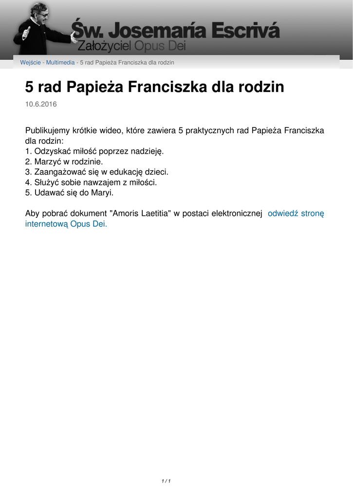 Wejście - Multimedia - 5 rad Papieża Franciszka dla rodzin 5 rad Papieża Franciszka dla rodzin 10.6.2016 Publikujemy krótkie wideo, które zawiera 5 praktycznych rad Papieża Franciszka dla rodzin: 1. Odzyskać miłość poprzez nadzieję. 2. Marzyć w rodzinie. 3. Zaangażować się w edukację dzieci. 4. Służyć sobie nawzajem z miłości. 5. Udawać się do Maryi. Aby pobrać dokument "Amoris Laetitia" w postaci elektronicznej odwiedź stronę internetową Opus Dei. 1/1 Powered by TCPDF (www.tcpdf.org)