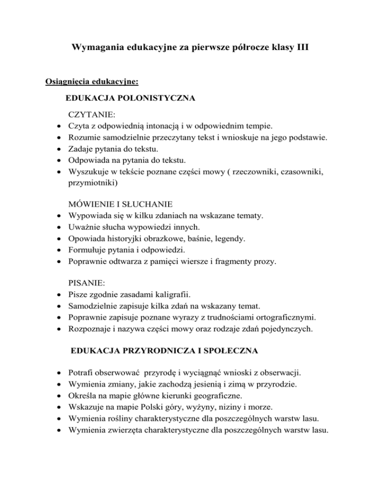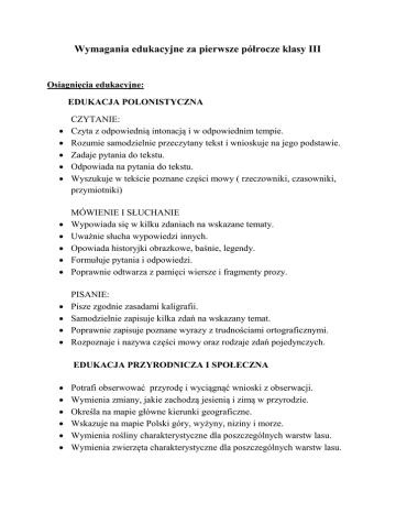 Wymagania edukacyjne za pierwsze półrocze klasy III Osiągnięcia edukacyjne: EDUKACJA POLONISTYCZNA CZYTANIE: Czyta z odpowiednią intonacją i w odpowiednim tempie. Rozumie samodzielnie przeczytany tekst i wnioskuje na jego podstawie. Zadaje pytania do tekstu. Odpowiada na pytania do tekstu. Wyszukuje w tekście poznane części mowy ( rzeczowniki, czasowniki, przymiotniki) MÓWIENIE I SŁUCHANIE Wypowiada się w kilku zdaniach na wskazane tematy. Uważnie słucha wypowiedzi innych. Opowiada historyjki obrazkowe, baśnie, legendy. Formułuje pytania i odpowiedzi. Poprawnie odtwarza z pamięci wiersze i fragmenty prozy. PISANIE: Pisze zgodnie zasadami kaligrafii. Samodzielnie zapisuje kilka zdań na wskazany temat. Poprawnie zapisuje poznane wyrazy z trudnościami ortograficznymi. Rozpoznaje i nazywa części mowy oraz rodzaje zdań pojedynczych. EDUKACJA PRZYRODNICZA I SPOŁECZNA Potrafi obserwować przyrodę i wyciągnąć wnioski z obserwacji. Wymienia zmiany, jakie zachodzą jesienią i zimą w przyrodzie. Określa na mapie główne kierunki geograficzne. Wskazuje na mapie Polski góry, wyżyny, niziny i morze. Wymienia rośliny charakterystyczne dla poszczególnych warstw lasu. Wymienia zwierzęta charakterystyczne dla poszczególnych warstw lasu. Wymienia nazwiska sławnych Polaków i dziedziny, w których się wsławili. Nazywa etapy życia człowieka. EDUKACJA MATEMATYCZNA Sprawnie dodaje i odejmuje liczby w zakresie 100. Mnoży i dzieli liczby w zakresie 50. Nazywa liczby w dodawaniu , odejmowaniu, mnożeniu, dzieleniu. Rozwiązuje zadania tekstowe na dodawanie i odejmowanie, na mnożenie i dzielenie oraz na porównywanie różnicowe. Stosuje swoje umiejętności matematyczne w nietypowych sytuacjach. EDUKACJA PLASTYCZNA Stosuje poznane techniki przy wykonywaniu prac plastycznych. Wykorzystuje własne pomysły przy tworzeniu prac plastycznych. Wykonuje prace z papieru zgodnie z instrukcją. ZAJĘCIA TECHNICZNE Bezpiecznie posługuje sie narzędziami i przyrządami. Dba o ład i porządek w miejscu pracy. Dobiera odpowiednio materiały, narzędzia. Pamięta o bezpieczeństwie podczas pracy. EDUKACJA MUZYCZNA Śpiewa poznane piosenki. Śpiewa hymn Polski i szkoły. Zna nuty i ich nazwy. Tańczy podstawowe kroki poznanych tańców narodowych. Wyróżnia poszczególne instrumenty. WYCHOWANIE FIZYCZNE Jest przygotowany do zajęć. Chętnie uczestniczy w zajęciach ruchowych. Współpracuje z rówieśnikami podczas gier zespołowych. Dba o bezpieczeństwo swoje i kolegów podczas wykonywania ćwiczeń. ZAJĘCIA KOMPUTEROWE Obsługuje komputer i posługuje się w wybranymi programami. Wyszukuje informacje na wybranych stronach internetowych. Wymagania edukacyjne po zakończeniu klasy III. Osiągnięcia edukacyjne: EDUKACJA POLONISTYCZNA CZYTANIE: Rozumie samodzielnie przeczytany tekst i wnioskuje na podstawie jego treści. Zadaje pytania do tekstu i na nie odpowiada. Przeczytał wybrane lektury i potrafi powiedzieć o nich kilka zdań. MÓWIENIE I SŁUCHANIE Wypowiada się w kilku zdaniach na wskazane tematy. Uważnie słucha wypowiedzi innych. Recytuje wiersze we właściwym tempie, z odpowiednia intonacją. PISANIE: Pisze zgodnie zasadami kaligrafii. Pisze z pamięci i ze słuchu. Przestrzega zasad kaligrafii oraz dba o poprawność gramatyczną, ortograficzną i interpunkcyjną napisanych tekstów. Poprawnie zapisuje poznane części mowy z przeczeniem "nie" Samodzielnie redaguje i zapisuje kilka zdań na wskazany temat oraz krótkie opowiadanie, opis, zaproszenie, życzenia i ogłoszenie. EDUKACJA PRZYRODNICZA I SPOŁECZNA Nazywa główne kierunki na mapie. Pokazuje na mapie granice Polski i wymienia nazwy krajów z nią sąsiadujących. Wymienia walory geograficzne i przyrodnicze swojego regionu. Wymienia zjawiska atmosferyczne i rozumie ich zależność od pór roku. Wskazuje na mapie kontynenty. Rozpoznaje wybrane zwierzęta charakterystyczne dla kontynentów. Nazywa charakterystyczne elementy krajobrazów Polski. Wymienia nazwy roślin i zwierząt typowych dla wybranych regionów Polski. Opisuje ekosystemy: las, łąkę, pole, park, zbiorniki wodne. Wymienia zagrożenia dla środowiska naturalnego i zna sposoby jego ochrony. Wyjaśnia wpływ przyrody nieożywionej na życie ludzi i zwierząt. Dba o zdrowie i stara się racjonalnie odżywiać. Nazywa etapy życia człowieka. EDUKACJA MATEMATYCZNA Zapisuje za pomocą cyfr i czyta liczby do 1000. Porównuje liczby w zakresie 1000. Dodaje i odejmuje liczby do 100 z przekroczeniem progu dziesiątkowego. Mnoży i dzieli liczby w zakresie 100. Stosuje w obliczeniach poznane własności działań. Rozwiązuje zadania tekstowe, w tym zadania na porównywanie różnicowe. Rozwiązuje równania jednodziałaniowe z niewiadomą w postaci okienka. Wymienia cechy poznanych figur geometrycznych i oblicza ich obwody. Czyta i zapisuje liczby od I do XII w systemie rzymskim. Wykonuje nietrudne obliczenia pieniężne i kalendarzowe. Odczytuje wskazania zegarów i wykonuje obliczenia zegarowe. Mierzy i zapisuje wynik pomiaru oraz wykonuje obliczenia dotyczące tych miar. Waży przedmioty i wykonuje obliczenia, używając miar: gram, dekagram, kilogram. EDUKACJA PLASTYCZNA Stosuje poznane techniki przy wykonywaniu prac plastycznych. Wykorzystuje własne pomysły przy tworzeniu prac plastycznych. Wykonuje prace z papieru zgodnie z instrukcją. ZAJĘCIA TECHNICZNE Wykonuje prace techniczne według instrukcji. Planuje kolejne czynności przy wykonywaniu prac technicznych. Dobiera do określonych prac odpowiednie materiały i narzędzia. Zna numery telefonów ratunkowych i wie, kiedy należy z nich korzystać. Pamięta o bezpieczeństwie podczas pracy. EDUKACJA MUZYCZNA Śpiewa z pamięci hymn narodowy i poznane piosenki ( minimum 10 ). Gra na dzwonkach proste melodie. Opisuje swoje wrażenia po wysłuchaniu utworów muzycznych. Rozpoznaje wybrane instrumenty muzyczne. WYCHOWANIE FIZYCZNE Chętnie uczestniczy w zajęciach ruchowych. Współpracuje z 