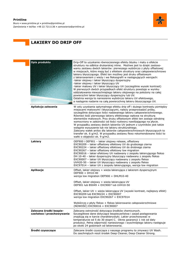 Printline Biuro • www.printline.pl • [email protected] Zamówienia • tel/fax +48 22 7211136 • [email protected] LAKIERY DO DRIP OFF Opis produktu Drip-Off to uzyskanie równoczesnego efektu błysku i matu o efekcie struktury na odbitce drukarskiej inline. Możliwe jest to dzięki zastosowaniu zestawu dwóch lakierów: pierwszego wybiórczo z płyty offsetowej w miejscach, które mają być z efektem struktury oraz całopowierzchniowo lakieru błyszczącego. Efekt ten możliwy jest druku offsetowym z lakierowaniem z wieży i we fleksografii w następujących wersjach: -lakier olejowy i lakier błyszczący dyspersyjny -lakier olejowy i lakier błyszczący UV -lakier matowy UV i lakier błyszczący UV (szczególnie wysoki kontrast) W pierwszych dwóch przypadkach efekt struktury powstaje w wyniku oddziaływania niewyschniętego lakieru olejowego na położony na całej powierzchni lakier błyszczący dyspersyjny lub UV. Ostatnia wersja to naniesienie wybiórczo lakieru UV efektowego, a następnie nadanie na całą powierzchnię lakieru błyszczącego UV. Apliakcja zalecenia W celu uzyskania optymalnego efektu drip off i dużego kontrastu pomiędzy miejscami matowymi i błyszczącymi, należy przeprowadzić próby, szczególnie dotyczące ilości nadawanego lakieru całopowierzchniowego. Również ilość pierwszego lakieru efektowego wpływa na strukturę elementów matowych. Przy druku offsetowym efekt ten zostaje odrobinę wzmocniony w zależności od ilości roztworu nawilżającego na płycie. W przypadku zestawu dwóch lakierów UV jednym z czynników jest także wstępne wysuszenie lub nie lakieru strukturalnego. Zalecany wałek anilox dla lakierów całopowierzchniowych błyszczących to transfer ok. 6 g/m2. W przypadku zestawu flexo rekomendowane ilości to wałki o objętości ok. 9 g/m2. Lakiery OEF900 i OEF901 – lakier olejowy release, offsetowy EXC90209 – lakier offsetowy efektowy UV do grubszego ziarna EXC90224 – lakier offsetowy efektowy UV do drobnego ziarna EXC90267 – lakier offsetowy efektowy low migration EXC90016 – lakier efektowy UV nadawany z zespołu lakierującego flekso DH 10-40 – lakier dyspersyjny błyszczący nadawany z zespołu flekso EXC90007 – lakier UV błyszczący nadawany z zespołu flekso UVH20-50 – lakier UV błyszczący nadawany z zespołu flekso EXC97014 – lakier UV z zespołu lakierującego, wersja low migration Aplikacje Offset, lakier olejowy + wieża lakierująca z lakierem dyspersyjnym OEF900 + DH10-40 wersja low migration OEF900 + DHLM10-40 Offset, lakier olejowy + wieża lakierująca UV OEF901 lub B5049 + EXC9007 lub UVH10-50 Offset, lakier UV + wieża lakierująca UV (wysoki kontrast, najlepszy efekt) EXC90209 lub EXC90224 + EXC90007 wersja low migration EXC90267 + EXC97014 Wybiórczo z płyty flekso + flekso lakierowanie całopowierzchniowe (NOWOŚĆ) EXC90016 + EXC90007 Zalecane środki bezpieczeństwa i przechowywania Zalecana ostrożność dotycząca środków chemicznych. Szczegółowe dane dotyczące bezpieczeństwa i zasad postępowania znajdują się w karcie charakterystyki. Lakier przechowywać w temperaturze od 5 do 30 stopni C. Okres gwarancji 1 rok od daty produkcji. Pełna odporność naniesionego i wyschniętego lakieru następuje po około 24 godzinach od lakierowania. Środki czyszczące Zalecane środki czyszczące z naszego programu to zmywacz UV Wash. Do zaschniętych reszt środek Deep Cleaner, Deep Cleaner Strong.