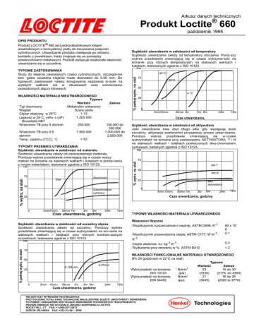 Arkusz danych technicznych Produkt Loctite® 660 październik 1995 OPIS PRODUKTU Produkt LOCTITE® 660 jest jednoskładnikowym klejem TYPOWE ZASTOSOWANIA Służy do klejenia pasowanych części cylindrycznych, szczegól-nie tam, gdzie szczelina klejenia może dochodzić do 0.50 mm. Do typowych zastosowań należy korygowanie osadzania ło-żysk na wybitych wałkach lub w obudowach oraz wzmacnianie uszkodzonych złączy klinowych. Wrzeciono TB przy 0.5 obr/min Temp. zapłonu (TCC), °C 1.500.000 Zakres 150.000 do 350.000 1.000.000 do 2.000.000 > 93 100 % wytrz. na stali Aluminium Stal 50 22°C 50 4 °C 25 0 5min10min 30min 1hr 3hr 6hr 24hr 72hr Szybkość utwardzania w zależności od aktywatora Jeśli utwardzanie trwa zbyt długo albo gdy występują duże szczeliny, aktywacja powierzchni przyspieszy proces utwar-dzania. Poniższy wykres przedstawia zmieniającą się w czasie wytrzymałość na ścinanie przy zastosowaniu AKTYWATORA T i N na stalowych wałkach i tulejkach powleczonych dwu-chromianem cynkowym, badanych zgodnie z ISO 10123. 100 75 Akt T 50 Akt N 25 0 Dwuchromian cynkowy Bez aktywatora 5min 10min 30min 1hr 3hr 6hr 24hr 72hr Czas utwardzania, godziny 25 0 5min10min 30min 1hr 3hr 6hr Czas utwardzania, godziny 24hr 72hr Szybkość utwardzania w zależności od szczeliny złącza Szybkość utwardzania zależy od szczeliny. Poniższy wykres przedstawia zmieniającą się w czasie wytrzymałość na ści-nanie na stalowych wałkach i tulejkach przy różnych kontrolo-wanych szczelinach; testowane zgodnie z ISO 10123. 100 % pełnej wytrz. na stali 40°C 75 Czas utwardzania, TYPOWY PRZEBIEG UTWARDZANIA Szybkość utwardzania w zależności od materiału Szybkość utwardzania zależy od zastosowanego materiału. Poniższy wykres przedstawia zmieniającą się w czasie wytrzy małość na ścinanie na stalowych wałkach i tulejkach w porów-naniu z innymi materiałami, testowane zgodnie z ISO 10123. 75 100 % wytrz. na stali WŁASNOŚCI MATERIAŁU NIEUTWARDZONEGO Typowe Wartość Typ chemiczny Metakrylan uretanowy Wygląd Szara pasta Ciężar właściwy w 25°C 1.13 1.200.000 Lepkość w 25°C, mPa· s (cP) Brookfield HBT Wrzeciono TB przy 5 obr/min 250.000 Szybkość utwardzania w zależności od temperatury Szybkość utwardzania zależy od temperatury otoczenia. Poniż-szy wykres przedstawia zmieniającą się w czasie wytrzyma-łość na ścinanie przy różnych temperaturach na stalowych wał-kach i tulejkach, testowanych zgodnie z ISO 10123. % pełnej wytrz. na stali anaerobowym o konsystencji pasty do mocowania połączeń cylindrycznych. Utwardzanie produktu następuje po odcięciu kontaktu z powietrzem, kiedy znajduje się on pomiędzy powierzchniami metalowymi. Produkt wykazuje doskonałe własności utwardzania się w szczelinie. TYPOWE WŁASNOŚCI MATERIAŁU UTWARDZONEGO Własności fizyczne Współczynnik rozszerzalności cieplnej, ASTM D696, K-1 Wspólczynnik przewodzenia ciepła, ASTM C177, W·m-1 K-1 Ciepło właściwe, kJ· kg-1 K-1 Wydłużenie przy zerwaniu w %, ASTM D412 75 0.27mm 0.154 mm 0 5min 10min 30min 1hr 3hr 6hr Czas utwardzania, godziny 24hr 0.3 <2 WŁASNOŚCI FUNKCJONALNE MATERIAŁU UTWARDZONEGO (Po 24 godzinach w 22°C na stali) Typowe Wartość Zakres 2 23 15 do 30 Wytrzymałość na ścinanie, N/mm ISO 10123 (psi) (3335) (2175 do 4350) 2 21 16 do 26 Wytrzymałość na ścinanie, N/mm DIN 54452 (psi) (3045) (2320 to 3770) 50 25 80 x 106 0.1 72hr NIE DOTYCZY WYMOGÓW TECHNICZNYCH. PRZYTOCZONE TUTAJ DANE TECHNICZNE MAJĄ JEDYNIE SŁUŻYĆ JAKO PUNKTY ODNIESIENIA. PO POMOC I WSKAZÓWKI DOTYCZĄCE WARUNKÓW TECHNICZNYCH TEGO PRODUKTU PROSZĘ ZWRÓCIĆ SIĘ DO DZIAŁU JAKOŚCI KORPORACJI LOCTITE. ROCKY HILL, CT FAX: +1 (860)-571-5473 DUBLIN, IRLANDIA FAX: +353-(1)-451 - 9959 TDS Loctite®660 październik 1995 TYPOWA ODPORNOŚĆ NA ŚRODOWISKO Proces badawczy : Materiał: Proces utwardzania: Wytrzymałość na ścinanie, ISO 10123 Stalowe wałki i tulejki 1 tydzień w 22°C Wytrzymałość na temperaturę Badane w temperaturze. % wytrz. w temp. pokojowej 100 75 50 25 Magazynowanie O ile na etykiecie produktu nie ma innych wskazañ, idealnym sposobem jego przechowywania bêdzie pozostawienie go w zamkniêtych pojemnikach w ch³odnym i suchym pomiesz-czeniu w temperaturze pomiêdzy 8°C a 28°C (46°F do 82°F). Optymalna temperatura magazynowania to dolna po³owa tego zakresu. Resztek materia³u nie nale¿y umieszczaæ z powrotem w jego oryginalnym pojemniku, gdy¿ mog³oby dojœæ do zanie-czyszczenia produktu. Dalsze informacje na temat okresu przydatnoœci produktu mo¿na uzyskaæ w lokalnym oœrodku obs³ugi technicznej. 0 (50) 0 50 150 100 Temperatura, °C Starzenie cieplne Starzenie w danej temperaturze, testowane w 22°C. % pocz. wytrz. w temp. Pok. 200 Zakresy danych Przytoczone tutaj dane mog¹ s³u¿yæ jako wartoœci typowe i/lub jako ich zakres (na podstawie œredniej wielkoœci ±2 odchy³ki standardowej). Wartoœci oparte s¹ na danych uzyskanych z aktualnie przeprowadzonych badañ i s¹ okresowo weryfiko-wane. 150°C 150 120°C 100 50 0 0 1,000 2,000 Godzin 3,000 4,000 5,000 Odporność chemiczna Starzenie w określonych warunkach, testowane w 22°C. Medium Olej silnikowy Benzyna bezo³owiowa P³yn hamulcowy Etanol Aceton Woda/glikol (50%/50%) Temp. 125°C 22°C 22°C 22°C 22°C 87°C Pozosta³a wytrzyma³oœæ w % po: 100 h 500 h 1000 h 100 100 80 95 80 100 Wskazówki dotycz¹ce stosowania Aby uzyskaæ jak najlepsze wyniki, nale¿y dok³adnie oczyœciæ i odt³uœciæ powierzchnie. Z³¹cze musi byæ ca³kowicie wype³nio-ne klejem. Aby to osi¹gn¹æ, w po³¹czeniach pasowanych luŸno nale¿y nanieœæ klej wokó³ wa³ka i krawêdzi wlotu tulei, ruch obrotowy czêœci podczas monta¿u zapewni dok³adne rozprowadzenie kleju. W po³¹czeniach wt³aczanych, trzeba starannie pokryæ produktem obie klejone powierzchnie i wykonaæ szybki monta¿ pod du¿ym naciskiem. W po³¹czeniach pasowanych skurczowo klej nanosi siê na wa³ek; tulejê nal