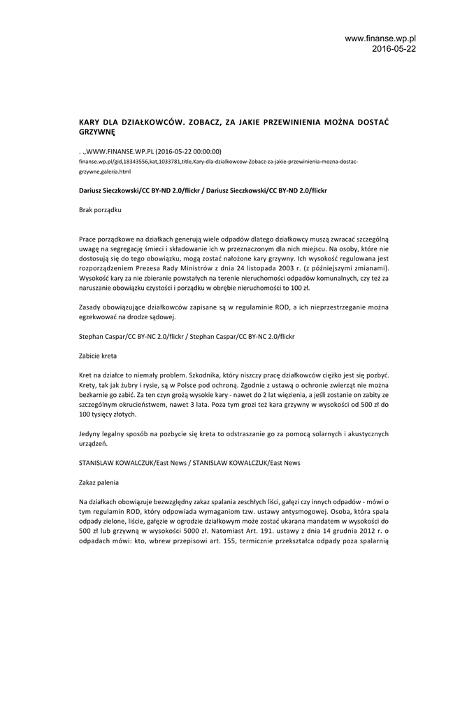 www.finanse.wp.pl 2016-05-22 KARY DLA DZIAŁKOWCÓW. ZOBACZ, ZA JAKIE PRZEWINIENIA MOŻNA DOSTAĆ GRZYWNĘ . .,WWW.FINANSE.WP.PL (2016-05-22 00:00:00) finanse.wp.pl/gid,18343556,kat,1033781,title,Kary-dla-dzialkowcow-Zobacz-za-jakie-przewinienia-mozna-dostacgrzywne,galeria.html Dariusz Sieczkowski/CC BY-ND 2.0/flickr / Dariusz Sieczkowski/CC BY-ND 2.0/flickr Brak porządku Prace porządkowe na działkach generują wiele odpadów dlatego działkowcy muszą zwracać szczególną uwagę na segregację śmieci i składowanie ich w przeznaczonym dla nich miejscu. Na osoby, które nie dostosują się do tego obowiązku, mogą zostać nałożone kary grzywny. Ich wysokość regulowana jest rozporządzeniem Prezesa Rady Ministrów z dnia 24 listopada 2003 r. (z późniejszymi zmianami). Wysokość kary za nie zbieranie powstałych na terenie nieruchomości odpadów komunalnych, czy też za naruszanie obowiązku czystości i porządku w obrębie nieruchomości to 100 zł. Zasady obowiązujące działkowców zapisane są w regulaminie ROD, a ich nieprzestrzeganie można egzekwować na drodze sądowej. Stephan Caspar/CC BY-NC 2.0/flickr / Stephan Caspar/CC BY-NC 2.0/flickr Zabicie kreta Kret na działce to niemały problem. Szkodnika, który niszczy pracę działkowców ciężko jest się pozbyć. Krety, tak jak żubry i rysie, są w Polsce pod ochroną. Zgodnie z ustawą o ochronie zwierząt nie można bezkarnie go zabić. Za ten czyn grożą wysokie kary - nawet do 2 lat więzienia, a jeśli zostanie on zabity ze szczególnym okrucieństwem, nawet 3 lata. Poza tym grozi też kara grzywny w wysokości od 500 zł do 100 tysięcy złotych. Jedyny legalny sposób na pozbycie się kreta to odstraszanie go za pomocą solarnych i akustycznych urządzeń. STANISLAW KOWALCZUK/East News / STANISLAW KOWALCZUK/East News Zakaz palenia Na działkach obowiązuje bezwzględny zakaz spalania zeschłych liści, gałęzi czy innych odpadów - mówi o tym regulamin ROD, który odpowiada wymaganiom tzw. ustawy antysmogowej. Osoba, która spala odpady zielone, liście, gałęzie w ogrodzie działkowym może zostać ukarana mandatem w wysokości do 500 zł lub grzywną w wysokości 5000 zł. Natomiast Art. 191. ustawy z dnia 14 grudnia 2012 r. o odpadach mówi: kto, wbrew przepisowi art. 155, termicznie przekształca odpady poza spalarnią www.finanse.wp.pl 2016-05-22 odpadów lub współspalarnią odpadów podlega karze aresztu lub grzywny. Najprostszym sposobem na utylizację roślinności jest prywatny kompostownik, w który każdy użytkownik działki ma obowiązek ją wyposażyć. Te rośliny natomiast, które się nie nadają do kompostowania, powinny być gromadzone w specjalnych pojemnikach i odbierane z ogrodu, jako odpady zielone. East News / East News Wycinka drzew Kwestie wycinki drzew z terenów ROD reguluje ustawa o ROD oraz ustawa z 16 kwietnia 2004 r. o ochronie przyrody, która została zmieniona przez nowelizację w czerwcu 2015 roku. Zgodnie z nowymi ustaleniami z terenów ROD można usuwać już bez żadnych formalności krzewy, których wiek nie przekracza 10 lat i krzewy ozdobne raz drzewa owocowe i te, których obwód pnia na wysokości 5 cm nie przekracza: 35 cm (w przypadku topoli, wierzb, kasztanowca zwyczajnego, klonu jesionolistnego, klonu srebrzystego, robinii akacjowej oraz platanu klonolistnego) oraz 25 cm - w przypadku pozostałych gatunków drzew. Oznacza to, że na usunięcie niektórych kategorii drzew nadal konieczne będzie uzyskania zezwolenia. Zezwolenie na wycinkę drzew wydaje zasadniczo wójt, burmistrz albo prezydent miasta, a wniosek musi złożyć sam działkowiec. Ponieważ za usunięcie drzew ponosi się czasami opłaty, trzeba się liczyć z ewentualnymi dodatkowymi kosztami. Ich wysokość podaje w zezwoleniu organ, który zezwolił na wycinkę. Naruszenie powyższych zasad wiąże się z negatywnymi konsekwencjami finansowymi. Kary za wycinkę drzew i krzewów bez zezwolenia są 2 razy większe od opłat. Maksymalną stawką opłat za usuwanie drzew za jeden centymetr obwodu pnia mierzonego na wysokości 130 cm to: przy wielkości obwodu pnia do 25 cm - 99,05 zł, przy wielkości obwodu pnia od 26 do 50 cm - 346,67 zł, a przy wielkości obwodu pnia od 51 do 100 - 656,20 zł.