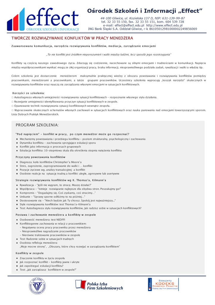 TWÓRCZE ROZWIĄZYWANIE KONFLIKTÓW W PRACY MENEDŻERA Z a a wa nso wa na ko munika c ja , na rzę d zia ro związywa nia ko nfliktó w, me d ia c ja , za rząd za nie e mo c ja mi To nie konflikt jest źródłem nieporozumień i walki między ludźmi, lecz sposób jego rozstrzygania Konflikty są częścią naszego zawodowego życia. Zdarzają się codziennie, nacechowane są silnymi emocjami i trudnościami w komunikacji. Napięcia między współpracownikami wynikać mogą ze złej organizacji pracy, braku informacji, niesprawiedliwego podziału zadań, rywalizacji i walki o władzę itp. Celem szkolenia jest dostarczenie menedżerom maksymalnie praktycznej wiedzy z obszaru powstawania i rozwiązywania konfliktów pomiędzy pracownikami, menedżerami a pracownikami, a także grupami pracowników. Uczestnicy szkolenia wypracują koszyk narzędzi skutecznych w rozwiązywaniu konfliktów oraz nauczą się zarządzania własnymi emocjami w sytuacjach konfliktowych. K o rzyśc i ze szko le nia : Autodiagnoza własnych umiejętności rozwiązywania sytuacji konfliktowych rozpoznanie własnego stylu działania. Rozwijanie umiejętności identyfikowania przyczyn sytuacji konfliktowych w zespole. Opanowanie technik rozwiązywania sytuacji konfliktowych wewnątrz zespołu. Wypracowanie skutecznych schematów własnych zachowań w sytuacjach konfliktowych oraz nauka panowania nad emocjami towarzyszącymi sporom. Lista Dobrych Praktyk Menedżerskich. PROGRAM SZKOLENIA: " P o d na p ię c ie m" - ko nflikt w p ra c y, p o c zym me ne d że r mo że g o ro zp o zna ć ? Mechanizmy powstawiania i przebiegu konfliktu - poziom strukturalny, psychologiczny i zachowania Dynamika konfliktu - zachowania sprzyjające eskalacji sporu Konflikt jako informacja o procesach grupowych Eskalacja konfliktu: 10-stopniowa skala dla określenia stopnia natężenia konfliktu P rzyc zyny p o wsta wa nia ko nfliktó w Diagnoza: koło konfliktów Christophera Moorea Stres, zagrożenie, zaprogramowanie do walki i konflikt Pozycje życiowe wg. analizy transakcyjnej a konflikt Osobiste reakcje na sytuację trudną a konflikt: uległe, agresywne lub asertywne S tra te g ie ro związywa nia ko nfliktó w wg K . Tho ma s' a , K ilma nn a Rywalizacja "Jęśli nie wygram, to stracę. Muszę działać!" Współpraca - "Istnieje rozwiązanie najlepsze dla obydwu stron. Poszukajmy go!" Kompromis "Dogadajmy się. Coś zyskamy, coś stracimy Unikanie "Sprawy sporne odłóżmy to na później " Dostosowanie się "Niech będzie jak Ty chcesz. Spokój jest najważniejszy..." Style rozwiązywania konfliktów: test Thomasa-Kilmanna Test: Autodiagnoza stylu rozwiązywania konfliktów, Jak radzisz sobie w sytuacjach konfliktowych? P o sta wa i za c ho wa nie me ne d że ra a ko nflikty w ze sp o le Osobowość menedżera: test NEOFFI Konfliktogenne zachowania w relacji z pracownikiem: - Negatywna ocena pracy pracownika przez menedżera - Niesprawiedliwe nagradzanie pracowników - Nierówne traktowanie pracowników w zespole Test: Radzenie sobie w sytuacjach trudnych Osobista refleksja menedżera: Moje mocne strony, Obszary, które chcę rozwijać w zarządzaniu konfliktem K o nflikty w ze sp o le Znaczenie konfliktu w życiu zespołu Jak rozpoznać konflikt - konflikty jawne i ukryte Jak zapobiegać eskalacji konfliktu? Test: Jak zarządzasz konfliktem w zespole? Info rma c ja zwro tna ja ko na rzę d zie na p ra wia nia re la c ji Podstawowe zasady udzielania feedbacku Zasady formułowania komunikatów JA Zasada FUKO mów o Faktach, Uczuciach, Konsekwencjach, Oczekiwaniach Szanowanie granic psychologicznych rozmówcy Asertywne komunikowanie potrzeb Komunikaty niewerbalne jako pochodna nieświadomych potrzeb Sztuka milczenia i dyplomacji Me to d y za rząd za nia ko nflikte m p o mię d zy p o je d ync zymi p ra c o wnika mi Rodzaje zachowań w sytuacji konfliktowej i strategie konstruktywnego reagowania Techniki komunikacyjne minimalizujące bariery w porozumieniu Metody zapobiegania eskalacja konfliktu Techniki obrony przed manipulacją i presją Radzenie sobie z trudnym pracownikiem (brak zaangażowania, roszczeniowość, konfliktowość) Me to d y za rząd za nia ko nflikte m w ze sp o le Analiza przyczyn - skąd biorą się problemy w relacjach w zespole, pomiędzy zespołami, pomiędzy menedżerem a kierowanym przez niego zespołem Radzenie sobie z sytuacjami trudnymi w zespole (opór, niechęć, konflikt, agresja, brak kreatywności, bierność) Zarządzanie emocjami zespołu w konflikcie Twórcze podejście do konfliktu czyli poszukiwanie konstruktywnych rozwiązań: - metoda 6 pytań - metoda 6 kapeluszy De Bono - metoda Metaplanu Me ne d że r ja ko ne g o c ja to r Kryteria negocjacji zakończonych sukcesem Etapy negocjacji wg Gavina Kennedy Me ne d że r ja ko me d ia to r Czym są mediacje? Wskazówki dla mediatorów jak postępować, by doprowadzić do porozumienia? Etapy mediacji: odkrycie interesów, poszukiwanie rozwiązań Me ne d że r ja ko fa c ylita to r Czym jest facylitacja i kiedy warto ją stosować? Narzędzia pracy facylitatora Me ne d że r ja ko a rb ite r Wskazówki dla arbitra jak postępować, by przedstawić najlepsze możliwe rozstrzygnięcie problemu? Przegląd etapów arbitrażu - na zdobywanie informacji K o nflikt ja ko wyzwa la c z trud nyc h e mo c ji Naturalne sposoby reagowania na stres w sytuacjach konfliktowych Autodiagnoza sposobów reagowania na stres własny i innych w trudnych sytuacjach - rozpoznawanie emocji - reagowanie świadome, proaktywne - konsekwencje reakcji automatycznych i świadomych dla sytuacji Analiza własnych emocji: test Moje emocje w konflikcie Test inteligencji emocjonalnej Kontrolowanie stanów emocjonalnych - sposoby zmiany stanu poprzez wizualizację, autosugestię, reframing przekonań. Z a rząd za nie ko nflikte m w p ra ktyc e d nia c o d zie nne g o me ne d że ra Lista Dobrych Praktyk Menedżerskich dla rozwoju własnych kompetencji w obszarze zarządzania konflik