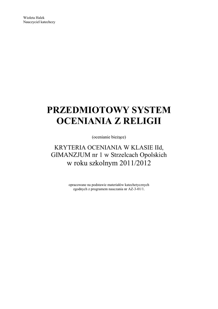 Wioleta Halek Nauczyciel katechezy PRZEDMIOTOWY SYSTEM OCENIANIA Z RELIGII (ocenianie bieżące) KRYTERIA OCENIANIA W KLASIE IId, GIMANZJUM nr 1 w Strzelcach Opolskich w roku szkolnym 2011/2012 opracowane na podstawie materiałów katechetycznych zgodnych z programem nauczania nr AZ-3-01/1. I. Pragnienia ludzi Ocena dopuszczająca Katechizowany: - wylicza sposoby doświadczenia obecności Boga; - określa, co wyraża imię Boga; - opowiada tekst Łk 24,13-35; - definiuje, czym jest liturgia. II. Ku pełni czasów Ocena dopuszczająca Katechizowany: - wskazuje sposoby przeciwstawiania się złu; - wylicza warunki sakramentu pokuty; - definiuje, kim jest anioł; - przedstawia podstawowe wiadomości na temat adwentu; - opisuje, jakie znaczenie ma dla chrześcijan świętowanie Bożego Narodzenia; - opowiada o świadectwie wiary św. Szczepana. Ocena dostateczna Ocena dobra Katechizowany: - definiuje pojęcie teofanii; - interpretuje tekst Wj 3,10- 15; - wskazuje, co może nam pomóc w zrozumieniu prawdy o Panu Bogu; - wylicza cele liturgii. Katechizowany: - określa, po co Bóg objawia się ludziom; - uzasadnia, że Bóg objawiając swoje imię ukazuje przyjazne nastawienie do człowieka; - określa, co należy czynić, by doświadczyć spotkania z Jezusem; - wylicza argumenty przemawiające za uczestnictwem w liturgii. Ocena dostateczna Katechizowany: - przekonuje, że Bóg nie toleruje zła; - interpretuje tekst Wj 3,7-9; - wyjaśnia rolę aniołów i sposoby działania szatana; - wskazuje biblijne przykłady zaufania Bogu; - interpretuje teksty biblijne o narodzeniu Jezusa; - interpretuje tekst biblijny o Symeonie. Ocena dobra Katechizowany: - opisuje, co symbolizuje i wyraża woda chrztu; - określa, czym dla chrześcijanina jest żal za grzechy; - interpretuje teksty KKK o aniołach; - określa religijne wezwania adwentu; - wyjaśnia sens czytań z liturgii Bożego Narodzenia; - analizuje, na jakich argumentach opierają ludzie wiarę w Boga. Ocena bardzo dobra Katechizowany: - reflektuje, jak można przekonać się o obecności Boga; - analizuje, co wyraża nazwanie Jezusa imieniem JESTEM; - przekonuje, w jaki sposób można w pełni rozpoznać Jezusa; - wykazuje, co tracimy, gdy nie jesteśmy obecni na nabożeństwach liturgicznych. Ocena bardzo dobra Katechizowany: - przedstawia analogię pomiędzy wodami potopu i wodą chrztu; - analizuje, w jaki sposób Bóg wspiera nas w walce ze złem; - określa, na czym polega walka między dobrem a złem; - analizuje, na czym polega bezwarunkowe zaufanie Bogu; - uzasadnia, dlaczego Jezusa nazywamy Słowem Boga; - przyjmuje odpowiedzialność za świadectwo wiary. III. W Królestwie Bożym Ocena dopuszczająca Katechizowany: - opowiada, kim jest Jezus; - przedstawia teksty biblijne podkreślające troskę Boga o człowieka; - wyjaśnia rzeczywistość Królestwa Bożego; - opowiada o spotkaniu Jezusa z Samarytanką; - definiuje pojecie Eucharystii; - wylicza znaki przyjaźni Boga do człowieka IV. Ukrzyżowany i zmartwychwstały Ocena dopuszczająca Katechizowany: - wskazuje, dlaczego Jezus umarł na krzyżu; - interpretuje tekst biblijny o uczniach idących do Emaus; - przedstawia spotkanie Jezusa zmartwychwstałego z Tomaszem; - uczestniczy w rekolekcjach szkolnych; - określa, na czym powinno polegać rzeczywiste świętowanie Wielkanocy; - wyjaśnia sens zmartwychwstania Jezusa; - wskazuje, czym jest oktawa wielkanocna; - opisuje, kim jest Duch Święty, którego Jezus posyła od Ojca; - wylicza modlitwy w których występuje odniesienie do wszystkich Osób Trójcy Świętej. Ocena dostateczna Katechizowany: - wylicza tytuły stosowane do określenia Jezusa; - przedstawia Jezusa jako Boga zatroskanego o człowieka; - dokonuje zestawienia skarbu z Królestwem Bożym; - określa, jaką funkcję spełnia osoba proroka; - informuje, jaki będzie los tych, którzy odrzucają Pokarm wieczności; - wskazuje sposoby obecności Chrystusa w Kościele. Ocena dobra Katechizowany: - wyjaśnia znaczenie tytułów Jezusa; - określa, w jaki sposób Bóg okazuje człowiekowi swoją troskę o niego; - uzasadnia potrzebę troski o zdobycie Królestwa Bożego; - uzasadnia, że zbawienie jest podstawowym zamiarem Boga wobec człowieka; - interpretuje teksty biblijne o Eucharystii; - analizuje, w jaki sposób możemy odkryć Jezusa w Kościele. Ocena bardzo dobra Katechizowany: - interpretuje, co znaczy świadczyć o Jezusie; - wyjaśnia, kiedy chrześcijanin szczególnie doświadcza Bożej troski; - analizuje, dlaczego Królestwo Boże uznawane jest za skarb; - interpretuje, dlaczego Jezus posłużył się określeniem „woda żywa"; - przedstawia naukę Jezusa dotyczącą pokarmu wiecznego; - przyjmuje odpowiedzialność za Kościół. Ocena dostateczna Katechizowany: - wyjaśnia, dlaczego krzyż jest dla chrześcijan znakiem zbawienia; - określa, do czego odnosi się udzielana wierzącym moc Jezusa; - wskazuje, jakiej wiary oczekuje Jezus od swoich uczniów; - opowiada przypowieść o miłosiernym Ojcu; - uczestniczy w Triduum Paschalnym; - uczestniczy w liturgii Wielkanocy; - wylicza wydarzenia wspominane po zmartwychwstaniu Jezusa; - redaguje modlitwę do Ducha Świętego; - wskazuje, kiedy jest obchodzona uroczystość Trójcy Świętej. Ocena dobra Katechizowany: - informuje, czemu ma służyć „nowe narodzenie"; - uzasadnia, że spotkanie ze Zmartwychwstałym przemienia życie wierzących; - określa, na jakiej podstawie przyjmujemy prawdę o zmartwychwstaniu Jezusa; - wskazuje cechy charakterystyczne nawrócenia; - wyjaśnia religijne znaczenie tajemnicy Paschalnej; - wskazuje charakterystyczne elementy liturgii wielkanocnej; - wyjaśnia znaczenie poszczególnych form świętowania okresu wielkanocnego; - wskazuje, w czym Duch Święty pomaga człowiekowi; - opisuje, jakie treści kryją się w wierze chrześcijan w Trójcę Świętą. Ocena bardzo dobra Katechizowany: - uzasadnia, że „wywyższenie" Jezusa na krzyżu nie jest Jego klęską, ale