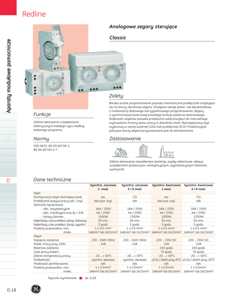 Redline Aparaty modułowe pomocnicze Analogowe zegary sterujące A B Classic Zalety Zdalne sterowanie urządzeniami elektrycznymi każdego typu według zadanego programu. Bardzo proste programowanie poprzez mechaniczne przełączniki znajdujące się na tarczy obrotowej zegara. Dostępne wersje jedno- lub dwukanałowe z możliwością dobowego lub tygodniowego programowania. Zegary o synchronizacji kwarcowej posiadają funkcję zasilania rezerwowego. Większość zegarów posiada przełącznik załącz/wyłącz do manualnego wymuszania zmiany stanu pracy w dowolnej chwili. Beznapięciowy styk wyjściowy w wersji zwiernej (1Zw.) lub przełącznej (1CO). Przeźroczysta pokrywa tarczy zegara przystosowana jest do plombowania. Normy Zastosowanie Funkcje VDE 0633, BS EN 60730-1, BS EN 60730-2-7 Zdalne sterowanie oświetleniem (parkingi, szyldy reklamowe, sklepy) urządzeniami grzewczymi, wentylacyjnymi, sygnalizacyjnymi (dzwonki, syreny) itd. C D Dane techniczne Synchro. sieciowa 1- mod. E F X Synchro. kwarcowa 1 mod. Synchro. kwarcowa 3 / 6 mod. Styki zw. CO zw. CO Konfiguracja (styki beznapięciowe) bez poz. wył. tak bez poz. wył. tak Przełącznik pozycji pracy zał. / wył. Zdolność łączeniowa: 16A / 250V 16A / 250V 16A / 250V 16A / 250V - obc. rezystancyjne 4A / 250V 4A / 250V 4A / 250V 4A / 250V - obc. indukcyjne (cos φ = 0,6) 1000W 1000W 1350W 1350W - lampy żarowe 30 min. 30 min. 30 min. 30 min. Najkrótszy czas przełącz. (prog. dobowy) 3 godz. 3 godz. 3 godz. 3 godz. Najkrótszy czas przełącz. (prog. tygodn.) 1 x 0,5 mm2 1 x 0,5 mm2 1 x 0,5 mm2 1 x 0,5 mm2 Przekrój przewodów: min. 1x6mm2 lub 2x2,5mm2 1x6mm2 lub 2x2,5mm2 1x6mm2 lub 2x2,5mm2 1x6mm2 lub 2x2,5mm2 maks. Zegar 220 - 240V 50Hz 220 - 130V DC 220 - 240V 50Hz 220 - 130V DC Napięcie zasilania 1VA 1VA 1VA 1VA Pobór mocy przy 230V 150 godz. 150 godz. Rezerwa zasilania 70 godz. 70 godz. Czas pracy baterii -20 ...+ 50°C -20 ...+ 50°C -20 ...+ 50°C -20 ...+ 50°C Zakres temperatury pracy synchro. sieciowa ±2,5s / dzień przy 20°C ±2,5s / dzień przy 20°C synchro. sieciowa Dokładność tak tak tak tak Możliwość plombowania 1 x 0,5mm2 1 x 0,5mm2 1 x 0,5mm2 1 x 0,5mm2 Przekrój przewodów: min. 1x6mm2 lub 2x2,5mm2 1x6mm2 lub 2x2,5mm2 1x6mm2 lub 2x2,5mm2 1x6mm2 lub 2x2,5mm2 maks. Rysunki wymiarowe D.18 Synchro. sieciowa 3 / 6 mod. str. D.39 Redline CLASSIC – Analogowe zegary sterujące Synchronizacja sieciowa Programowanie dobowe CLS S 11 D CLS S 31 D 1zw. Programowanie tygodniowe Program Typ 1 x 24 x 2 1 x 24 x 2 Konfiguracja Znamion. Rezerwa Minimalny Przełącznik Liczba styków prąd/ zasilania czas zał./wył. mod. napięcie przełączenia 1 zw. Bez poz. wył. 1 16A / 250V 30 min. 1 CO tak 3 16A / 250V 30 min. Nr kat. Opak. 666111 666112 1 1 1CO CLS S 31 W 7 x 24 /3 1 CO 16A / 250V 1 x 24 x 2 1 x 24 x 2 1 zw. 1 CO 1 CO 3 godz. tak 3 666114 1 16A / 250V 50 godz. 16A / 250V 150 godz. 30 min. 30 min. tak 1 3 666105 666104 1 1 16A / 250V 150 godz. 3 godz. tak 3 666109 1 - 1CO Synchronizacja kwarcowa 1NO Classic CLS Q 11 D Programowanie dobowe CLS Q 31 D 1CO Programowanie CLS Q 31 W tygodniowe 7 x 24 /3 A 1CO Programowanie dobowe / dobowe - 2 kanał. B CLS Q 62 DD 1x24x2+ 1x24x2 2 CO 16A / 250V 150 godz. 30 min./30 min. tak 6 666103 1 C 2CO Prodramowanie dobowe / tygodniowe - 2 kanał. CLS Q 62 DW 1x24x2+ 7x24/3 2 CO 16A / 250V 150 godz. 30 min./3 godz. tak 6 666108 1 D E 2CO F Akcesoria Typ Zestaw do montażu natynkowego SMS 1 SMS 3 SMS 6 Liczba mod. Nr kat. Opak. 1 3 6 666100 666101 666102 1 1 1 X 1 x 24 x 2 oznacza programowanie dobowe (1 x 24), gdzie najkrótszy czas przełączania pomiędzy sąsiednimi przełącznikami 30 minut (x 2); 7 x 24 : 3 oznacza programowanie tygodniowe (7 x 24), przy najkrótszym czasie przełączania 3 godziny (: 3); 1 x 24 x 4 + 7 x 24 : 12 oznacza zegar dwukanałowy z programowaniem dziennym (1 x 24), i najkrótszym czasie przełączania 15 minut (x 4) oraz programowaniem tygodniowym (7 x 24) i najkrótszym czasie przełączania 2 godziny (: 12); D.19 Redline Cyfrowe zegary sterujące Aparaty modułowe pomocnicze Galax Zastosowanie Zdalne sterowanie oświetleniem (parkingi, szyldy reklamowe, sklepy) urządzeniami grzewczymi, wentylacyjnymi, sygnalizacyjnymi (dzwonki, syreny) itd. Zalety Bardzo proste programowanie, o znacznie większych możliwościach kombinacyjnych w porównaniu do zegarów analogowych. Dostępne wersje jedno- , dwu- lub czterokanałowe z możliwością dobowego, tygodniowego lub rocznego programowania. Wszystkie zegary z synchronizacją kwarcową oraz funkcją zasilania rezerwowego. Najkrótszy czas przełączania 1 min. lub 1 sek. Możliwość sterowane zegara (program roczny) drogą radiową przy wykorzystaniu anteny (opcja) w celu uzyskania 100% dokładności. Większość tych aparatów posiada cały szereg dodatkowych udogodnień tj. funkcja wakacyjna, funkcja random, funkcja lato / zima. Opcjonalnie możliwość programowania zdalnego przy pomocy pilota. Przeźroczysta pokrywa tarczy zegara przystosowana jest do plombowania. Funkcje Zdalne sterowanie urządzeniami elektrycznymi każdego typu według zadanego programu. A B Normy BS EN-60730-1, BS EN-60730-2-7, VDE 0633 C D E F Dane techniczne Styki Konfiguracja (styki beznapięciowe) Zdolność łączeniowa: - obc. rezystancyjne - obc. indukcyjne (cos φ = 0,6) - lampy żarowe - prąd stały Najkrótszy czas przełączania Przekrój przewodów: X 1; 2; 4CO min. maks. Zegar Napięcie zasilania Pobór mocy przy 230 V Rezerwa zasilania przy 20 °C (dla mod. 1/2; 3/6) Bateria Zakres temperatury pracy Dokładność (dla mod. 1; 2/6) Możliwość plombowania Przekrój przewodów: min. maks. Rysunki wymiarowe D.20 str. D.39-40 16A / 250V 2,5A / 250V 1000W na życzenie 1 min. / 1 s. 1 x 0,5 mm2 1 x 6mm2 lub 2 x 2,5mm2 220 - 240V 50 - 60Hz 5VA 150 godz. / 3 lata / 6 lat litowa (oprócz zeg. 1 mod.) -25 ...+ 50°C ±2,5s / dzień przy 20°C; ±1s / dzień przy 20°C tak 1 x 0,5mm2 1 x 6mm2 lub 2 x 2,5mm2 Redlin