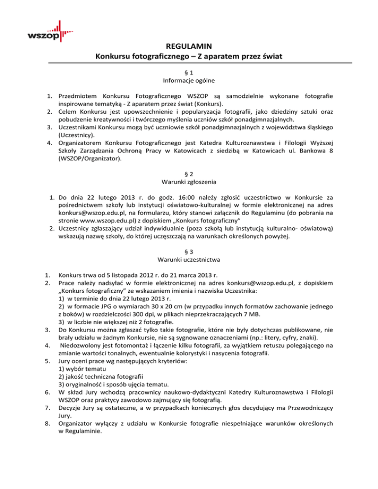 REGULAMIN Konkursu fotograficznego – Z aparatem przez świat §1 Informacje ogólne 1. Przedmiotem Konkursu Fotograficznego WSZOP są samodzielnie wykonane fotografie inspirowane tematyką - Z aparatem przez świat (Konkurs). 2. Celem Konkursu jest upowszechnienie i popularyzacja fotografii, jako dziedziny sztuki oraz pobudzenie kreatywności i twórczego myślenia uczniów szkół ponadgimnazjalnych. 3. Uczestnikami Konkursu mogą być uczniowie szkół ponadgimnazjalnych z województwa śląskiego śląski (Uczestnicy). atorem Konkursu Fotograficznego jest Katedra Kulturoznawstwa i Filologii Wyższej 4. Organizatorem Szkoły Zarządzania Ochroną Pracy w Katowicach z siedzibą w Katowicach Katowicach ul. Bankowa 8 (WSZOP/Organizator). §2 Warunki zgłoszenia 1. Do dnia 22 lutego 2013 r. do godz. 16:00 należy zgłosić uczestnictwo czestnictwo w Konkursie za pośrednictwem szkoły koły lub instytucji oświatowo-kulturalnej oświatowo kulturalnej w formie elektronicznej na adres [email protected], naa formularzu, który stanowi załącznik załącznik do Regulaminu (do pobrania na stronie www.wszop.edu.pl) z dopiskiem dop „Konkurs fotograficzny” 2. Uczestnicy czestnicy zgłaszający udział indywidualnie (poza szkołą lub instytucją kulturalnokulturalno oświatową) wskazują nazwę szkoły, do której uczęszczają na warunkach określonych powyżej. §3 Warunki uczestnictwa 1. 2. 3. 4. 5. 6. 7. 8. Konkurs onkurs trwa od 5 listopada 2012 r. do 21 marca 2013 r. Prace należy nadsyłać w formie elektronicznej na adres [email protected], [email protected] z dopiskiem „Konkurs fotograficzny” ze wskazaniem imienia i nazwiska Uczestnika: U 1) w terminie do dnia 22 lutego 2013 r. 2) w formacie JPG o wymiarach 30 x 20 cm (w przypadku innych innych formatów zachowanie jednego z boków) w rozdzielczości 300 dpi, w plikach nieprzekraczających 7 MB. 3) w liczbie nie większej niż 2 fotografie. Do Konkursu można zgłaszać tylko takie fotografie, które nie były dotychczas publikowane, nie brały udziału w żadnym Konkursie, nie są sygnowane oznaczeniami (np.: litery, cyfry, znaki). Niedozwolony jest fotomontaż fotomontaż i łączenie kilku fotografii, za wyjątkiem retuszu polegającego na zmianie wartości tonalnych, ewentualnie kolorystyki i nasycenia fotografii. Jury oceni prace wg następujących kryteriów: 1) wybór tematu 2)) jakość techniczna fotografii 3) oryginalność ść i sposób ujęcia tematu. W skład Jury wchodzą pracownicy naukowo-dydaktyczni naukowo dydaktyczni Katedry Kulturoznawstwa i Filologii WSZOP oraz praktycy zawodowo zajmujący się fotografią. Decyzje Jury są ostateczne, a w przypadkach koniecznych głos decydujący ma Przewodniczący Jury. Organizator wyłączy z udziału w Konkursie fotografie niespełniające warunków określonych w Regulaminie. §4 1. Zwycięzca Konkursu otrzyma nagrodę główną w postaci konsoli Playstation Portable. 2. Wszyscy wyróżnieni Uczestnicy otrzymają atrakcyjne nagrody książkowe oraz dyplomy uczestnictwa w Konkursie. 3. Zwycięskie i wyróżnione fotografie zostaną zaprezentowane podczas wernisażu wystawy we WSZOP, a następnie podczas wystawy pokonkursowej. 4. Uroczyste wręczenie nagród i dyplomów osobom wyróżnionym odbędzie się dnia 27 marca 2013 r. w Katowicach, przy ul. Bankowej 8. §5 1. Organizator zastrzega prawo do bezterminowego i nieodpłatnego wykorzystania zdjęć. m.in. poprzez: zamieszczenie informacji na stronie internetowej WSZOP, opublikowanie imion i nazwisk laureatów. 2. Kwestie nieunormowane Regulaminem, a dotyczące Konkursu rozstrzyga Organizator.