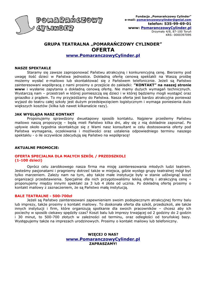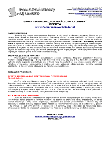 Fundacja „Pomarańczowy Cylinder” e-mail: [email protected] telefon: 535-99-69-01 www: PomaranczowyCylinder.pl Drzymały 4/8, 87-100 Toruń KRS: 0000397095 GRUPA TEATRALNA „POMARAŃCZOWY CYLINDER” OFERTA www.PomaranczowyCylinder.pl NASZE SPEKTAKLE Staramy się zawsze zaproponować Państwu atrakcyjną i konkurencyjną cenę. Bierzemy pod uwagę ilość dzieci w Państwa jednostce. Dokładną ofertę cenową spektakli na Waszą prośbę możemy wysłać e-mailowo lub skontaktować się z Państwem telefonicznie. Jeżeli są Państwo zainteresowani współpracą z nami prosimy o przejście do zakładki: ”KONTAKT” na naszej stronie www i wysłanie zapytania o dokładną cenową ofertę. Nie mamy dużych wymagań technicznych. Wystarczą nam – przestrzeń w której pomieszczą się dzieci i w której będziemy mogli wystąpić oraz gniazdko z prądem. To my przyjeżdżamy do Państwa. Nasza oferta jest bardzo atrakcyjna ponieważ wyjazd do teatru całej szkoły jest dużym przedsięwzięciem logistycznym i wymaga poniesienia dużo większych kosztów (kilka lub nawet kilkanaście razy). JAK WYGLĄDA NASZ KONTAKT Proponujemy sprawdzony dwuetapowy sposób kontaktu. Najpierw prześlemy Państwu mailowo naszą propozycję – będą mieli Państwo kilka dni, aby się z nią dokładnie zapoznać. Po upływie około tygodnia skontaktuje się z Wami nasz konsultant w celu dostosowania oferty pod Państwa wymagania, oczekiwania i możliwości oraz ustalenia odpowiedniego terminu naszego spektaklu - o ile oczywiście zdecydują się Państwo na współpracę! AKTUALNE PROMOCJE: OFERTA SPECJALNA DLA MAŁYCH SZKÓŁ / PRZEDSZKOLI (1-100 dzieci) Oprócz celu zarobkowego nasza firma ma misję zainteresowania młodych ludzi teatrem. Jesteśmy pasjonatami i pragniemy dotrzeć także w miejsca, gdzie występ grupy teatralnej mógł być tylko marzeniem. Zależy nam na tym, aby także małe instytucje były w stanie udźwignąć koszt organizacji przedstawienia. Specjalnie dla nich przygotowaliśmy lekką ofertę i atrakcyjną cenę – proponujemy między innymi spektakl za 3 lub 4 złote od ucznia. Po dokładną ofertę prosimy o kontakt mailowy z zaznaczeniem, że są Państwo małą instytucją. BALE TEATRALNE - 500-700zł Jeżeli są Państwo zainteresowani zapewnieniem swoim podopiecznym atrakcyjnej formy balu lub imprezy, także prosimy o kontakt mailowy. To doskonała oferta dla szkół, przedszkoli, ale także innych instytucji i firm, które organizują spotkanie dla swoich pracowników – chcesz aby ich pociechy w sposób ciekawy spędziły czas? Koszt balu lub imprezy trwającej od 2 godziny do 2 godzin i 30 minut, to 500-700 złotych w zależności od terminu, oraz odległości od toruńskiej bazy. Występujemy także na imprezach urodzinowych. Prosimy o kontakt mailowy lub telefoniczny. WIĘCEJ O NAS? www.PomaranczowyCylinder.pl ZAPRASZAMY!