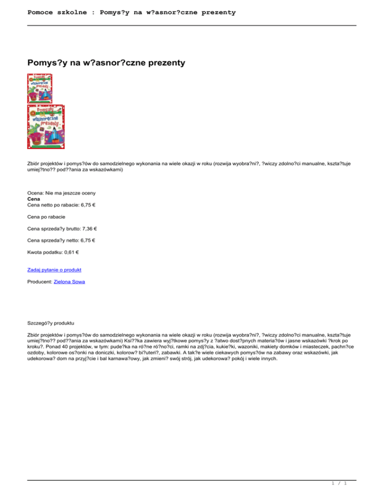 Pomoce szkolne : Pomys?y na w?asnor?czne prezenty Pomys?y na w?asnor?czne prezenty Zbiór projektów i pomys?ów do samodzielnego wykonania na wiele okazji w roku (rozwija wyobra?ni?, ?wiczy zdolno?ci manualne, kszta?tuje umiej?tno?? pod??ania za wskazówkami) Ocena: Nie ma jeszcze oceny Cena Cena netto po rabacie: 6,75 € Cena po rabacie Cena sprzeda?y brutto: 7,36 € Cena sprzeda?y netto: 6,75 € Kwota podatku: 0,61 € Zadaj pytanie o produkt Producent: Zielona Sowa Szczegó?y produktu Zbiór projektów i pomys?ów do samodzielnego wykonania na wiele okazji w roku (rozwija wyobra?ni?, ?wiczy zdolno?ci manualne, kszta?tuje umiej?tno?? pod??ania za wskazówkami) Ksi??ka zawiera wyj?tkowe pomys?y z ?atwo dost?pnych materia?ów i jasne wskazówki ?krok po kroku?. Ponad 40 projektów, w tym: pude?ka na ró?ne ró?no?ci, ramki na zdj?cia, kukie?ki, wazoniki, makiety domków i miasteczek, pachn?ce ozdoby, kolorowe os?onki na doniczki, kolorow? bi?uteri?, zabawki. A tak?e wiele ciekawych pomys?ów na zabawy oraz wskazówki, jak udekorowa? dom na przyj?cie i bal karnawa?owy, jak zmieni? swój strój, jak udekorowa? pokój i wiele innych. 1 / 1 Powered by TCPDF (www.tcpdf.org)