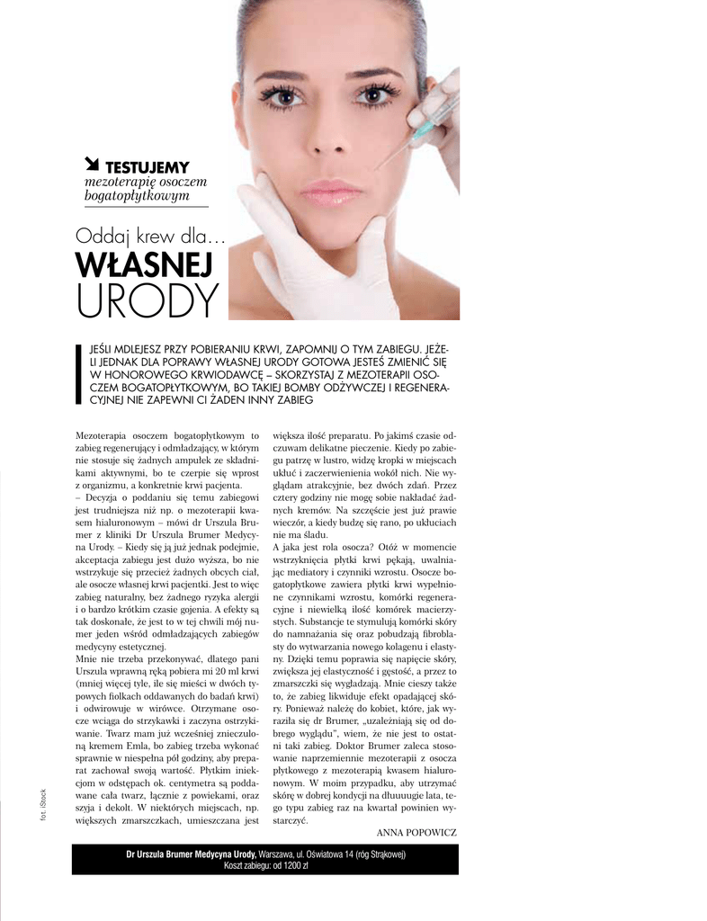 Testujemy mezoterapię osoczem bogatopłytkowym Oddaj krew dla… własnej urody fot. iStock Jeśli mdlejesz przy pobieraniu krwi, zapomnij o tym zabiegu. Jeżeli jednak dla poprawy własnej urody gotowa jesteś zmienić się w honorowego krwiodawcę – skorzystaj z mezoterapii osoczem bogatopłytkowym, bo takiej bomby odżywczej i regeneracyjnej nie zapewni ci żaden inny zabieg Mezoterapia osoczem bogatopłytkowym to zabieg regenerujący i odmładzający, w którym nie stosuje się żadnych ampułek ze składnikami aktywnymi, bo te czerpie się wprost z organizmu, a konkretnie krwi pacjenta. – Decyzja o poddaniu się temu zabiegowi jest trudniejsza niż np. o mezoterapii kwasem hialuronowym – mówi dr Urszula Brumer z kliniki Dr Urszula Brumer Medycyna Urody. – Kiedy się ją już jednak podejmie, akceptacja zabiegu jest dużo wyższa, bo nie wstrzykuje się przecież żadnych obcych ciał, ale osocze własnej krwi pacjentki. Jest to więc zabieg naturalny, bez żadnego ryzyka alergii i o bardzo krótkim czasie gojenia. A efekty są tak doskonałe, że jest to w tej chwili mój numer jeden wśród odmładzających zabiegów medycyny estetycznej. Mnie nie trzeba przekonywać, dlatego pani Urszula wprawną ręką pobiera mi 20 ml krwi (mniej więcej tyle, ile się mieści w dwóch typowych fiolkach oddawanych do badań krwi) i odwirowuje w wirówce. Otrzymane osocze wciąga do strzykawki i zaczyna ostrzykiwanie. Twarz mam już wcześniej znieczuloną kremem Emla, bo zabieg trzeba wykonać sprawnie w niespełna pół godziny, aby preparat zachował swoją wartość. Płytkim iniekcjom w odstępach ok. centymetra są poddawane cała twarz, łącznie z powiekami, oraz szyja i dekolt. W niektórych miejscach, np. większych zmarszczkach, umieszczana jest większa ilość preparatu. Po jakimś czasie odczuwam delikatne pieczenie. Kiedy po zabiegu patrzę w lustro, widzę kropki w miejscach ukłuć i zaczerwienienia wokół nich. Nie wyglądam atrakcyjnie, bez dwóch zdań. Przez cztery godziny nie mogę sobie nakładać żadnych kremów. Na szczęście jest już prawie wieczór, a kiedy budzę się rano, po ukłuciach nie ma śladu. A jaka jest rola osocza? Otóż w momencie wstrzyknięcia płytki krwi pękają, uwalniając mediatory i czynniki wzrostu. Osocze bogatopłytkowe zawiera płytki krwi wypełnione czynnikami wzrostu, komórki regeneracyjne i niewielką ilość komórek macierzystych. Substancje te stymulują komórki skóry do namnażania się oraz pobudzają fibroblasty do wytwarzania nowego kolagenu i elastyny. Dzięki temu poprawia się napięcie skóry, zwiększa jej elastyczność i gęstość, a przez to zmarszczki się wygładzają. Mnie cieszy także to, że zabieg likwiduje efekt opadającej skóry. Ponieważ należę do kobiet, które, jak wyraziła się dr Brumer, „uzależniają się od dobrego wyglądu”, wiem, że nie jest to ostatni taki zabieg. Doktor Brumer zaleca stosowanie naprzemiennie mezoterapii z osocza płytkowego z mezoterapią kwasem hialuronowym. W moim przypadku, aby utrzymać skórę w dobrej kondycji na dłuuuugie lata, tego typu zabieg raz na kwartał powinien wystarczyć. Anna Popowicz Dr Urszula Brumer Medycyna Urody, Warszawa, ul. Oświatowa 14 (róg Strąkowej) Koszt zabiegu: od 1200 zł