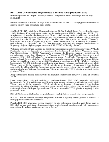 RB 11/2016 Oświadczenie akcjonariusza o zmianie stanu posiadania akcji Podstawa prawna Art. 70 pkt 1 Ustawy o ofercie - nabycie lub zbycie znacznego pakietu akcji 23.05.2016 Emitent informuje, iż w dniu 23 maja 2016 roku otrzymał od RDI LLC następujące oświadczenie w sprawie zmiany stanu posiadania akcji Spółki. „Spółka RDI LLC z siedzibą w Dover pod adresem: 28 Old Rudnick Lane, Dover, Stan Delaware 19901, Hrabstwo Kent, wpisana do rejestru spółek pod numerem: 5991311 (dalej jako „RDI LLC”), w wykonaniu obowiązku określonego w art. 69 ust. 1 pkt 2 ustawy o ofercie publicznej i warunkach wprowadzania instrumentów finansowych do zorganizowanego systemu obrotu oraz o spółkach publicznych z dnia 29 lipca 2005 r. (Dz.U. Nr 184, poz. 1539 z poźn. zm.) (dalej ’’Ustawa”), mniejszym zawiadamia o zbyciu akcji spółki Triton Development S.A. z siedzibą w Warszawie, pod adresem: ul. Grójecka 194, 02- 390 Warszawa, wpisanej do rejestru przedsiębiorców Krajowego Rejestru Sądowego pod numerem KRS 0000023078 (dalej „Triton”). Wskazane powyżej zbycie nastąpiło na podstawie wniesienia papierów wartościowych do VALUE Fundusz Inwestycyjny Zamknięty z wydzielonym Subfunduszem 1 z siedzibą w Warszawie (adres: Plac Dąbrowskiego 1, 00-057 Warszawa), wpisanego do Rejestru Funduszy Inwestycyjnych prowadzonego przez Sąd Okręgowy w Warszawie, VII Wydział Cywilny Rejestrowy, pod numerem RFi 1339 („Fundusz”), zarządzanego przez AgioFunds Towarzystwo Funduszy Inwestycyjnych S.A., z siedzibą w Warszawie, w ramach dokonanej w dniu 28 kwietnia 2016 r. wpłaty na certyfikaty inwestycyjne serii 002 Funduszu, w wyniku czego RDI LLC zbyło posiadane bezpośrednio 765.866 (siedemset sześćdziesiąt pięć tysięcy osiemset sześćdziesiąt sześć) akcji Triton, która to liczba stanowiła 12,03% udziału w jej kapitale zakładowym i bezpośrednio uprawniała do oddania 765.866 (siedmiuset sześćdziesięciu pięciu tysięcy ośmiuset sześćdziesięciu sześciu) głosów na Walnym Zgromadzeniu Triton, co stanowiło 7,05% głosów w ogólnej liczbie głosów w Triton. Akcje z transakcji zostały zaksięgowane na rachunku maklerskim nabywcy w dniu 28 kwietnia 2016 r. Przed zdarzeniami objętymi niniejszym zawiadomieniem RDI LLC posiadała wyłącznie bezpośrednio 765.866 (siedemset sześćdziesiąt pięć tysięcy osiemset sześćdziesiąt sześć) akcji Triton, która to liczba stanowiła 12,03% udziału w jej kapitale zakładowym i bezpośrednio uprawniała do oddania 765.866 (siedmiuset sześćdziesięciu pięciu tysięcy ośmiuset sześćdziesięciu sześciu) głosów na Walnym Zgromadzeniu Triton, co stanowiło 7,05% głosów w ogólnej liczbie głosów w Triton. RDI LLC informuje, iż aktualnie nie posiada żadnych akcji Triton, bezpośrednio ani pośrednio. RDI LLC nie ma zamiaru dalszego zwiększania udziału w ogólnej liczbie głosów w okresie 12 miesięcy od złożenia zawiadomienia. Ponadto RDI LLC informuje, że inne podmioty od niej zależne nie posiadają akcji Triton oraz że RDI LLC nie zawierała żadnych porozumień ani umów, których przedmiotem byłoby przekazanie uprawnienia do wykonywania prawa głosu w Triton.”