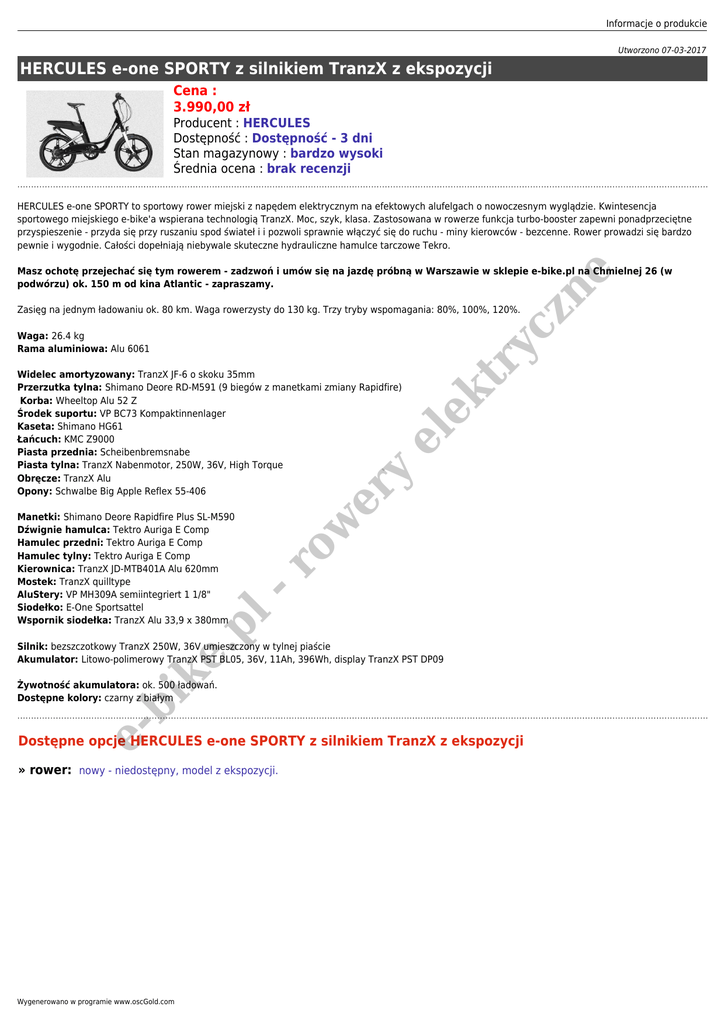 Informacje o produkcie Utworzono 07-03-2017 HERCULES e-one SPORTY z silnikiem TranzX z ekspozycji Cena : 3.990,00 zł Producent : HERCULES Dostępność : Dostępność - 3 dni Stan magazynowy : bardzo wysoki Średnia ocena : brak recenzji HERCULES e-one SPORTY to sportowy rower miejski z napędem elektrycznym na efektowych alufelgach o nowoczesnym wyglądzie. Kwintesencja sportowego miejskiego e-bike'a wspierana technologią TranzX. Moc, szyk, klasa. Zastosowana w rowerze funkcja turbo-booster zapewni ponadprzeciętne przyspieszenie - przyda się przy ruszaniu spod świateł i i pozwoli sprawnie włączyć się do ruchu - miny kierowców - bezcenne. Rower prowadzi się bardzo pewnie i wygodnie. Całości dopełniają niebywale skuteczne hydrauliczne hamulce tarczowe Tekro. cz ne Masz ochotę przejechać się tym rowerem - zadzwoń i umów się na jazdę próbną w Warszawie w sklepie e-bike.pl na Chmielnej 26 (w podwórzu) ok. 150 m od kina Atlantic - zapraszamy. Waga: 26.4 kg Rama aluminiowa: Alu 6061 w ro .p l- Manetki: Shimano Deore Rapidfire Plus SL-M590 Dźwignie hamulca: Tektro Auriga E Comp Hamulec przedni: Tektro Auriga E Comp Hamulec tylny: Tektro Auriga E Comp Kierownica: TranzX JD-MTB401A Alu 620mm Mostek: TranzX quilltype AluStery: VP MH309A semiintegriert 1 1/8" Siodełko: E-One Sportsattel Wspornik siodełka: TranzX Alu 33,9 x 380mm er y el Widelec amortyzowany: TranzX JF-6 o skoku 35mm Przerzutka tylna: Shimano Deore RD-M591 (9 biegów z manetkami zmiany Rapidfire) Korba: Wheeltop Alu 52 Z Środek suportu: VP BC73 Kompaktinnenlager Kaseta: Shimano HG61 Łańcuch: KMC Z9000 Piasta przednia: Scheibenbremsnabe Piasta tylna: TranzX Nabenmotor, 250W, 36V, High Torque Obręcze: TranzX Alu Opony: Schwalbe Big Apple Reflex 55-406 ek tr y Zasięg na jednym ładowaniu ok. 80 km. Waga rowerzysty do 130 kg. Trzy tryby wspomagania: 80%, 100%, 120%. ke Silnik: bezszczotkowy TranzX 250W, 36V umieszczony w tylnej piaście Akumulator: Litowo-polimerowy TranzX PST BL05, 36V, 11Ah, 396Wh, display TranzX PST DP09 e- bi Żywotność akumulatora: ok. 500 ładowań. Dostępne kolory: czarny z białym Dostępne opcje HERCULES e-one SPORTY z silnikiem TranzX z ekspozycji » rower: nowy - niedostępny, model z ekspozycji. Wygenerowano w programie www.oscGold.com