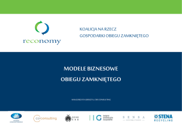 KOALICJA NA RZECZ GOSPODARKI OBIEGU ZAMKNIĘTEGO MODELE BIZNESOWE OBIEGU ZAMKNIĘTEGO MAŁGORZATA GRESZTA, CSR CONSULTING PODSTAWOWE ZAŁOŻENIA Źródło: Korzyści społeczne z gospodarki o obiegu zamkniętym, Raport Klubu Rzymskiego za Ellen MacArthur Foundation 2 W PRAKTYCE 3 MODELE BIZNESOWE GOSPODARKI OBIEGU ZAMKNIĘTEGO Używanie materiałów z recyklingu jako surowców do produkcji nowych produktów Włączenie materiałów z jednego lub więcej zużytych produktów do tworzenia nowego produktu niższej jakości lub wyższej jakości / wartości Udostępnianie usług, narzędzi i produktów powiązanych wśród branż w celu poprawy efektywności wykorzystania zasobów Świadczenia usługi zbierania starych lub zużytych produktów Źródło: Circular Business Models, Forum for the Future, Unilever 4 CLOSED-LOOP RECYCLING Używanie materiałów z recyklingu jako surowców do produkcji nowych produktów Korzyści dla klientów (materialne i emocjonalne): - Obniżenie cen materiałów - oszczędności Zachęcenie do recyklingu Brak kosztów usuwania odpadów Etyczna konsumpcja Szanse na rozwój rynku: - - Bezpieczna dostawa materiałów, większa stabilność łańcucha dostaw i niższe koszty materiałów Większe możliwości marketingowe przez interakcję z konsumentem 5 DOWNCYCLING Włączenie materiałów z jednego lub więcej zużytych produktów do tworzenia nowego produktu niższej jakości Korzyści dla klientów (materialne i emocjonalne): - Obniżenie cen materiałów Zachęcenie do recyklingu Brak kosztów usuwania odpadów Etyczna konsumpcja Szanse na rozwój rynku: - Bezpieczna dostawa materiałów, większa stabilność łańcucha dostaw i niższe koszty materiałów Niższe koszty materiałowe i utylizacji Lepsza reputacja / wartości marki (CSR) 6 UPCYCLING Włączenie materiałów z jednego lub więcej zużytych produktów do tworzenia nowego produktu, co implikuje poprawę jakości Korzyści dla klientów (materialne i emocjonalne): - Zwiększona jakość produktu w stosunku do oryginalnego produktu Przedłużenie użytkowania produktu Obniżenie cen przez oszczędności kosztów materiałowych Unikalny i spersonalizowany produkt Szanse na rozwój rynku - Bezpieczeństwo ekologiczne lub surowców Brak kosztów wydobycia surowców Zwiększenie wartości produktu poprzez recykling produktów o niskiej wartości 7 METHOD (Close loop recycling / upcycling) 8 INDUSTRIAL SYMBIOSIS Udostępnianie usług, narzędzi i produktów wśród powiązanych branż w celu poprawy efektywności wykorzystania zasobów. Korzyści dla klientów: - Rozwiązanie systemowe, brak bezpośredniej wartości dla klienta Szanse na rozwój rynku - Osiąganie wzrostu poprzez optymalizację kosztów Zapewnienie ciągłości działania poprzez zapewnienie dostaw surowców Niższe koszty surowców 9 DuPont and Procter & Gamble (Industrial symbiosis) 10 COLLECTION SERVICES Świadczenia usługi zbierania starych lub zużytych produktów. Korzyści dla klientów (materialne i emocjonalne): - Wygodna i odpowiedzialna utylizacja produktów Unikalne doświadczenie marki Etyczna konsumpcja jako symbol statusu Szanse na rozwój rynku: - Konsumenci lub partner przemysłowy ponosi koszty zbiórki Dodatkowe środki pozyskiwane od władz lokalnych Zapewnienie ciągłości działania poprzez zapewnienie dostaw ograniczonych surowców Brak kosztów wydobycia kosztów 11 Nesspresso (Collection services) 12 MODELE BIZNESOWE I WSPIERAJĄCE Źródło: Circular Business Models, Forum for the Future, Unilever 13 KOALICJA NA RZECZ GOSPODARKI OBIEGU ZAMKNIĘTEGO KONTAKT: Małgorzata Greszta Partner Zarządzający Tel. 662 347 471 [email protected]
