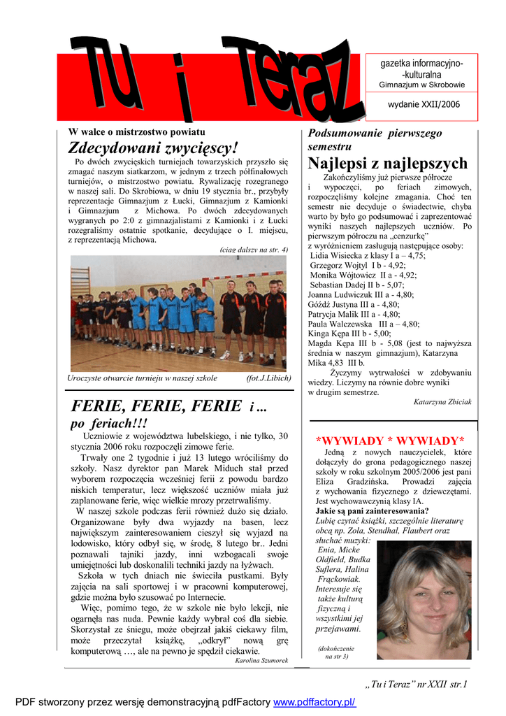 gazetka informacyjno-kulturalna Gimnazjum w Skrobowie wydanie XXII/2006 W walce o mistrzostwo powiatu Podsumowanie pierwszego semestru Zdecydowani zwycięscy! Po dwóch zwycięskich turniejach towarzyskich przyszło się zmagać naszym siatkarzom, w jednym z trzech półfinałowych turniejów, o mistrzostwo powiatu. Rywalizację rozegranego w naszej sali. Do Skrobiowa, w dniu 19 stycznia br., przybyły reprezentacje Gimnazjum z Łucki, Gimnazjum z Kamionki i Gimnazjum z Michowa. Po dwóch zdecydowanych wygranych po 2:0 z gimnazjalistami z Kamionki i z Łucki rozegraliśmy ostatnie spotkanie, decydujące o I. miejscu, z reprezentacją Michowa. (ciąg dalszy na str. 4) Uroczyste otwarcie turnieju w naszej szkole (fot.J.Libich) FERIE, FERIE, FERIE i ... Najlepsi z najlepszych Zakończyliśmy już pierwsze półrocze i wypoczęci, po feriach zimowych, rozpoczęliśmy kolejne zmagania. Choć ten semestr nie decyduje o świadectwie, chyba warto by było go podsumować i zaprezentować wyniki naszych najlepszych uczniów. Po pierwszym półroczu na „cenzurkę” z wyróżnieniem zasługują następujące osoby: Lidia Wisiecka z klasy I a – 4,75; Grzegorz Wojtyl I b - 4,92; Monika Wójtowicz II a - 4,92; Sebastian Dadej II b - 5,07; Joanna Ludwiczuk III a - 4,80; Góźdź Justyna III a - 4,80; Patrycja Malik III a - 4,80; Paula Walczewska III a – 4,80; Kinga Kępa III b - 5,00; Magda Kępa III b - 5,08 (jest to najwyższa średnia w naszym gimnazjum), Katarzyna Mika 4,83 III b. Życzymy wytrwałości w zdobywaniu wiedzy. Liczymy na równie dobre wyniki w drugim semestrze. Katarzyna Zbiciak po feriach!!! Uczniowie z województwa lubelskiego, i nie tylko, 30 stycznia 2006 roku rozpoczęli zimowe ferie. Trwały one 2 tygodnie i już 13 lutego wróciliśmy do szkoły. Nasz dyrektor pan Marek Miduch stał przed wyborem rozpoczęcia wcześniej ferii z powodu bardzo niskich temperatur, lecz większość uczniów miała już zaplanowane ferie, więc wielkie mrozy przetrwaliśmy. W naszej szkole podczas ferii również dużo się działo. Organizowane były dwa wyjazdy na basen, lecz największym zainteresowaniem cieszył się wyjazd na lodowisko, który odbył się, w środę, 8 lutego br.. Jedni poznawali tajniki jazdy, inni wzbogacali swoje umiejętności lub doskonalili techniki jazdy na łyżwach. Szkoła w tych dniach nie świeciła pustkami. Były zajęcia na sali sportowej i w pracowni komputerowej, gdzie można było szusować po Internecie. Więc, pomimo tego, że w szkole nie było lekcji, nie ogarnęła nas nuda. Pewnie każdy wybrał coś dla siebie. Skorzystał ze śniegu, może obejrzał jakiś ciekawy film, może przeczytał książkę, „odkrył” nową grę komputerową …, ale na pewno je spędził ciekawie. Karolina Szumorek *WYWIADY * WYWIADY* Jedną z nowych nauczycielek, które dołączyły do grona pedagogicznego naszej szkoły w roku szkolnym 2005/2006 jest pani Eliza Gradzińska. Prowadzi zajęcia z wychowania fizycznego z dziewczętami. Jest wychowawczynią klasy IA. Jakie są pani zainteresowania? Lubię czytać książki, szczególnie literaturę obcą np. Zola, Stendhal, Flaubert oraz słuchać muzyki: Enia, Micke Oldfield, Budka Suflera, Halina Frąckowiak. Interesuje się także kulturą fizyczną i wszystkimi jej przejawami. (dokończenie na str 3) „Tu i Teraz” nr XXII str.1 PDF stworzony przez wersję demonstracyjną pdfFactory www.pdffactory.pl/ Pamiętajmy o zwierzętach! Sylwester – szampan, zabawa do rana, sztuczne ognie... W tym dniu wszyscy chcemy się dobrze bawić. Przygotowujemy stroje, dbamy o wystrój pomieszczeń, planujemy menu… Ale czy na pewno o wszystkim pomyśleliśmy? Tak często zapominamy o naszych czworonożnych przyjaciołach, dla których ten dzień jest jednym z najgorszych w roku. Jak powszechnie wiadomo psy mają bardziej wyczulone zmysły, boją się fajerwerków, cierpią z powodu głośnych wybuchów. W takim razie czy ze względu na naszych pupili mamy ten dzień, jak każdy inny, spędzić przed telewizorem? Oczywiście, że nie, ale należy zadbać o to, aby nasi czworonożni przyjaciele nie przeżyli tak ogromnego szoku. Wystraszony pies staje się agresywny i jest w stanie ugryźć nawet właściciela. Nie mądrze postępuje ten kto naraża psa na tak duży stres i pozwala mu na przebywanie w pobliżu wybuchów sztucznych ogni. Dlatego powinniśmy pamiętać, iż psy to nie są „pluszowe zabawki”, więc postarajmy się nie dostarczać im za dużo wrażeń, które mogą odbić się na ich psychice. Karolina Szumorek Kasia Zbiciak Zabawa choinkowa Jak co roku, zawsze w styczniu, mamy w szkole szczyptę karnawału - zabawę choinkową. Tym razem zaplanowano ją na 26 stycznia 2006 roku. Od godz. 16.00 rozpoczęła się impreza taneczna. Uczestniczyli w niej uczniowie z klas I-III gimnazjum oraz rodzice i nauczyciele. Miejscem dyskoteki była sala gimnastyczna. (ciąg dalszy na str.3) SYLWETKI NASZYCH GIMNAZJALISTÓW Przemek Bochniak uczęszcza do klasy IIIB. Jest zodiakalnym koziorożcem, interesuje się sportem. W wolnych chwilach słucha muzyki poważnej, ale gustuje również w romantycznych klimatach. W roku szkolnym 2005/2006 należy do grona Samorządu Uczniowskiego i jest najlepszym sportowcem szkoły. Jedna z naszych redakcyjnych koleżanek – Natalia Góźdź umówiła się z Przemkiem na krótką rozmowę. O to co zdołała zanotować: Sport jest całym moim życiem, od najmłodszych lat interesuję się różnymi dyscyplinami. Od roku gram w MKS Lewart Lubartów w piłkę nożną. Ale prawdziwą dyscypliną, która mnie pasjonuje i poświęcam jej swój czas jest siatkówka. Jestem kapitanem szkolnej drużyny. Wraz z moimi kolegami- Michałem Zygą, Jakubem Robakiem, Pawłem Kaznowskim, Robertem Filipkiem, Andrzejem Lalakiem, Łukaszem Broniszem odnieśliśmy kilka znaczących dla nas zwycięstw. To wszystko zawdzięczamy naszemu nauczycielowi wychowania fizycznego, a zarazem trenerowi. Pan Henryk Libich mob