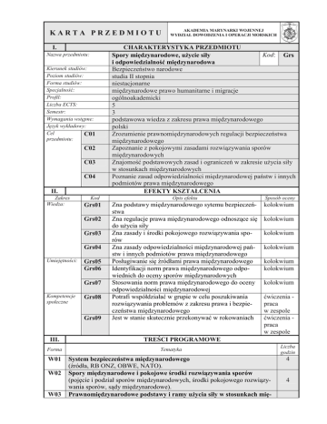 KARTA PRZEDMIOTU I. Nazwa przedmiotu: Kierunek studiów: Poziom studiów: Forma studiów: Specjalność: Profil: Liczba ECTS: Semestr: Wymagania wstępne: Język wykładowy: Cel C01 przedmiotu: C02 C03 C04 II. Zakres Wiedza: Kod Grs01 Grs02 Grs03 Grs04 Umiejętności: Grs05 Grs06 Grs07 Kompetencje społeczne Grs08 Grs09 III. AKADEMIA MARYNARKI WOJENNEJ WYDZIAŁ DOWODZENIA I OPERACJI MORSKICH CHARAKTERYSTYKA PRZEDMIOTU Kod: Grs Spory międzynarodowe, użycie siły i odpowiedzialność międzynarodowa Bezpieczeństwo narodowe studia II stopnia niestacjonarne międzynarodowe prawo humanitarne i migracje ogólnoakademicki 5 3 podstawowa wiedza z zakresu prawa międzynarodowego polski Zrozumienie prawnomiędzynarodowych regulacji bezpieczeństwa międzynarodowego Zapoznanie z pokojowymi zasadami rozwiązywania sporów międzynarodowych Znajomość podstawowych zasad i ograniczeń w zakresie użycia siły w stosunkach międzynarodowych Poznanie zasad odpowiedzialności międzynarodowej państw i innych podmiotów prawa międzynarodowego EFEKTY KSZTAŁCENIA Opis efektu Sposób oceny Zna podstawy międzynarodowego sytemu bezpieczeństwa Zna regulacje prawa międzynarodowego odnoszące się do użycia siły Zna zasady i środki pokojowego rozwiązywania sporów Zna zasady odpowiedzialności międzynarodowej państw i innych podmiotów prawa międzynarodowego Posługiwanie się źródłami prawa międzynarodowego Identyfikacji norm prawa międzynarodowego odpowiednich do oceny sporów międzynarodowych Stosowania norm prawa międzynarodowego do oceny odpowiedzialności międzynarodowej Potrafi współdziałać w grupie w celu poszukiwania rozwiązywania problemów z zakresu prawa i bezpieczeństwa międzynarodowego Jest w stanie skutecznie przekonywać w rokowaniach kolokwium kolokwium kolokwium kolokwium kolokwium kolokwium kolokwium ćwiczenia praca w zespole ćwiczenia praca w zespole TREŚCI PROGRAMOWE Forma Tematyka W01 System bezpieczeństwa międzynarodowego (źródła, RB ONZ, OBWE, NATO). Spory międzynarodowe i pokojowe środki rozwiązywania sporów (pojęcie i podział sporów międzynarodowych, środki pokojowego rozwiązywania sporów, sądy międzynarodowe). Prawnomiędzynarodowe podstawy i ramy użycia siły w stosunkach mię- W02 W03 Liczba godzin 4 4 W04 W05 C01 C02 C03 C04 IV. Forma Kod efektu przedmiotu W01 Grs01, Grs02, Grs03 W02 Grs01, Grs02, Grs03 W03 Grs01, Grs02, Grs03 W04 Grs01, Grs02 Grs03, Grs04 W05 C01 Grs01, Grs05 C02 C03 C04 6 dzynarodowych (zakaz użycia siły współcześnie - samoobrona indywidualna i zbiorowa, agresja, zasada nieinterwencji a „interwencja humanitarna” i R2P). Odpowiedzialność międzynarodowa państw i innych podmiotów prawa międzynarodowego (źródła odpowiedzialności, odpowiedzialność bezpośrednia i pośrednia, formy odpowiedzialności). Identyfikacja współczesnych sporów międzynarodowych Identyfikacja współczesnych sporów międzynarodowych Spór przed Międzynarodowym Trybunałem Sprawiedliwości Posiedzenie Rady Bezpieczeństwa ONZ Kolokwium KORELACJA EFEKTÓW KSZTAŁCENIA Grs05, Grs07,Grs08 Grs05, Grs06,Grs07, Grs08, Grs09 Grs05, Grs06,Grs07, Grs08, Grs09 V. Kod efektu kierunkowego BN2_W01; BN2_W03; BN2_W04 BN2_W06; BN2_W07; BN2_W08; BN2_W23 BN2_W06; BN2_W07; BN2_W08; BN2_W23 BN2_W06; BN2_W07; BN2_W08; BN2_W23 BN2_W01; BN2_W13 BN2_U01; BN2_U03; BN2_U05 BN2_U01; BN2_U03; BN2_U05 BN2_U0; BN2_U03; BN2_U05 BN2_U01; BN_U03; BN_U05; BN2_K07 3 3 2 2 4 2 Kod efektu obszarowego S2A_W01; S2A_W03; S2A_W07 S2A_W02; S2A_W03; S2A_W07; S2A_W08 S2A_W02; S2A_W03; S2A_W07; S2A_W08 S2A_W02; S2A_W03; S2A_W07; S2A_W08 S2A_W07; S2A_W08 S2A_U01; S2A_U02; S2A_U03; S2A_U04; S2A_U05 S2A_U01; S2A_U02; S2A_U03; S2A_U04; S2A_U05 S2A_U01; S2A_U02; S2A_U03; S2A_U04; S2A_U05 S2A_U01; S2A_U02; S2A_U03; S2A_U04; S2A_K07 NAKŁAD PRACY STUDENTA Forma aktywności Wykład Ćwiczenia Seminaria Konwersatoria Konsultacje Rozliczenie rygorów przedmiotu Przygotowanie do ćwiczeń Opanowanie informacji Przygotowanie do rozliczenia rygorów RAZEM VI. Liczba godzin kontaktowych 20 8 0 0 11 2 Liczba godzin niekontaktowych X 51 Razem liczba godzin Pkt. ECTS 100 5 X 15 24 10 49 METODY DYDAKTYCZNE 1. 2. 3. Wykłady – studium przypadku Ćwiczenia – seminaria VII. FORMA ZALICZENIA PRZEDMIOTU Rygor Zaliczenie Egzamin VIII. Kryteria składowe Ustny lub pisemny sprawdzian znajomości i identyfikacji współczesnych sporów wg odrębnego katalogu Grs06 Obecność na 75% wykładów Średnia pozytywnych ocen z ćwiczeń C01-C03 Kolokwium (obejmuje treści ćwiczeń i wykładów) Test i kazus do rozwiązania LITERATURA PODSTAWOWA I UZUPEŁNIAJĄCA OBOWIĄZKOWA Waga 0,0 0,0 0,4 0,6 1,0 1. 2. 3. 4. 5. 6. W. Czapliński, A. Wyrozumska, Prawo międzynarodowe publiczne. Zagadnienia systemowe, Warszawa 2004 (rozdział 5) J. Kranz (red.), Świat współczesny wobec użycia siły zbrojnej. Dylematy prawa i polityki, Warszawa 2009 W. Czapliński, Odpowiedzialność za naruszenia prawa międzynarodowego w związku z konfliktem zbrojnym, Warszawa 2009 T. Leśko, Międzynarodowe ograniczenia w prowadzeniu konfliktów zbrojnych, Warszawa 1990 wybór źródeł: A. Przyborowska-Klimczak, Prawo międzynarodowe publiczne. Wybór dokumentów, Lublin 2005 M. Flemming, Międzynarodowe prawo konfliktów zbrojnych. Zbiór dokumentów, Warszawa 2005 UZUPEŁNIAJĄCA R. Bierzanek, Wojna a prawo międzynarodowe, Warszawa 1982 IX. Stopień, Imię i nazwisko adres e-mail PROWADZĄCY PRZEDMIOT kmdr dr hab. Dariusz R. Bugajski [email protected]