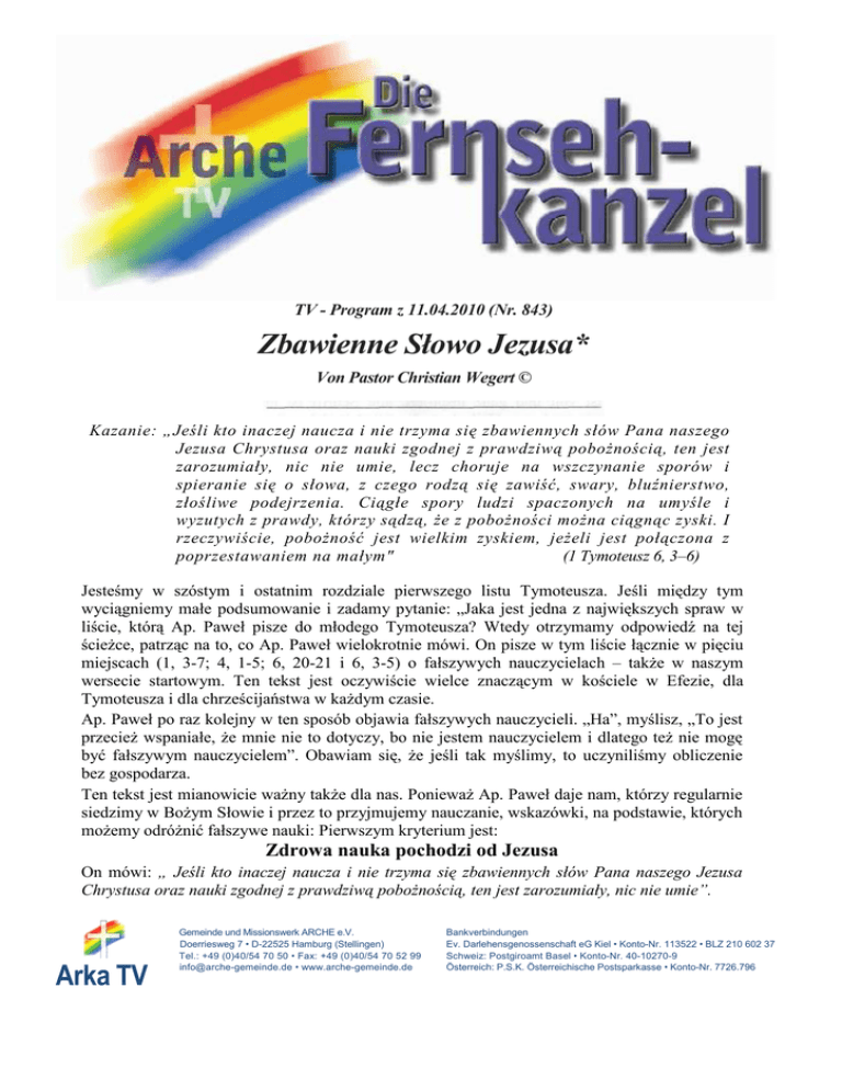 TV - Program z 11.04.2010 (Nr. 843) Zbawienne Słowo Jezusa* Von Pastor Christian Wegert © Kazanie: „Jeśli kto inaczej naucza i nie trzyma się zbawiennych słów Pana naszego Jezusa Chrystusa oraz nauki zgodnej z prawdziwą poboŜnością, ten jest zarozumiały, nic nie umie, lecz choruje na wszczynanie sporów i spieranie się o słowa, z czego rodzą się zawiść, swary, bluźnierstwo, złośliwe podejrzenia. Ciągłe spory ludzi spaczonych na umyśle i wyzutych z prawdy, którzy sądzą, Ŝe z poboŜności moŜna ciągnąc zyski. I rzeczywiście, poboŜność jest wielkim zyskiem, jeŜeli jest połączona z poprzestawaniem na małym" (1 Tymoteusz 6, 3–6) Jesteśmy w szóstym i ostatnim rozdziale pierwszego listu Tymoteusza. Jeśli między tym wyciągniemy małe podsumowanie i zadamy pytanie: „Jaka jest jedna z największych spraw w liście, którą Ap. Paweł pisze do młodego Tymoteusza? Wtedy otrzymamy odpowiedź na tej ścieŜce, patrząc na to, co Ap. Paweł wielokrotnie mówi. On pisze w tym liście łącznie w pięciu miejscach (1, 3-7; 4, 1-5; 6, 20-21 i 6, 3-5) o fałszywych nauczycielach – takŜe w naszym wersecie startowym. Ten tekst jest oczywiście wielce znaczącym w kościele w Efezie, dla Tymoteusza i dla chrześcijaństwa w kaŜdym czasie. Ap. Paweł po raz kolejny w ten sposób objawia fałszywych nauczycieli. „Ha”, myślisz, „To jest przecieŜ wspaniałe, Ŝe mnie nie to dotyczy, bo nie jestem nauczycielem i dlatego teŜ nie mogę być fałszywym nauczycielem”. Obawiam się, Ŝe jeśli tak myślimy, to uczyniliśmy obliczenie bez gospodarza. Ten tekst jest mianowicie waŜny takŜe dla nas. PoniewaŜ Ap. Paweł daje nam, którzy regularnie siedzimy w BoŜym Słowie i przez to przyjmujemy nauczanie, wskazówki, na podstawie, których moŜemy odróŜnić fałszywe nauki: Pierwszym kryterium jest: Zdrowa nauka pochodzi od Jezusa On mówi: „ Jeśli kto inaczej naucza i nie trzyma się zbawiennych słów Pana naszego Jezusa Chrystusa oraz nauki zgodnej z prawdziwą poboŜnością, ten jest zarozumiały, nic nie umie”. Arka TV Gemeinde und Missionswerk ARCHE e.V. Doerriesweg 7 • D-22525 Hamburg (Stellingen) Tel.: +49 (0)40/54 70 50 • Fax: +49 (0)40/54 70 52 99 [email protected] • www.arche-gemeinde.de Bankverbindungen Ev. Darlehensgenossenschaft eG Kiel • Konto-Nr. 113522 • BLZ 210 602 37 Schweiz: Postgiroamt Basel • Konto-Nr. 40-10270-9 Österreich: P.S.K. Österreichische Postsparkasse • Konto-Nr. 7726.796 Strona 2 - TV-Program 843 / „Zbawienne słowo Jezusa“ Po raz kolejny zwróćmy uwagę, jak Ap. Paweł opisuje zdrowe nauczanie. Mówi, Ŝe jest zgodne ze słowami Jezusa Chrystusa. On powiedział przez to, co do jednej nauki Jezusa Chrystusa – to, co głosił Chrystus – i on równieŜ myślał o tym, jak mówi Ewangelia, Ŝe apostołowie byli inspirowani przez Ducha Świętego, o czym napisali w listach poniŜej (zob. Koryntian 13, 3; Tesaloniczan 3, 6 i 12). W 2 Koryntian 13, 3 Ap. Paweł mówi na przykład, Ŝe Chrystus mówi przez niego. Zdrowa nauka jest, więc zgodna z tym, co nauczali Jezus i apostołowie. To nie są jakieś tajne nauki, które wcześniej nie były nikomu znane. To jest stare przesłanie, które Jezus i apostołowie głosili i kościół od początku był nimi odŜywiany. Fałszywi nauczyciele ówczesnego czasu, roszczyli sobie prawo, Ŝe otrzymali objawienie od Boga, którego nie mieli nawet kiedyś apostołowie. Oni mówili, Ŝe Jezus przez Ducha Świętego objawił im pewne prawdy, które są kluczem do sukcesu i materialnie błogosławionego Ŝycia. Werset 5 wyjaśnia nam i mówi: oni „sądzą, Ŝe z poboŜności moŜna ciągnąć zyski”. I tak ciągnęli przez kościoły i głosili rzeczy, których wcześniej nikt nie słyszał i które dezorientowały chrześcijan. Paweł odsuwa takich ludzi i ostro występuje przeciwko nim. On nazywa ich „zarozumiałymi”. On mówi: „Ja wam nic nowego nie głoszę. Moja nauka jest niczym więcej niŜ tym, co głosił Jezus. Ona zgadza się z tym, czego uczą moi koledzy apostołowie. My tego nie wymyśliliśmy, lecz jest sprawdzone, stare, dobrze znane Ewangelii, dobrej Nowinie Jezusa Chrystusa.” Zdrowa nauka nie jest tajemnicą, jest otwarta i przejrzysta. Ona nie potrzebuje Ŝadnej dalszej ksiąŜki, która jest teŜ ustanowiona na autorytecie Pisma Świętego. Nie potrzebuje teŜ specjalnych osób i ludzi, którzy biorą sobie prawo twierdząc, Ŝe otrzymali wyłączne objawienie od Boga. Fałszywi nauczyciele nie powołują jednak swojej nauki na Pismo Święte. Oni uczą czegoś innego. Oni mają wizje, objawienia, porady i wskazówki jak osiągnąć sukces w Ŝyciu i rozrzucają kilka wersetów Biblii w swoim systemie myślenia. KrzyŜ Golgoty nie stoi w centrum ich mowy. Istnieje wiele obszarów, które róŜnią się od słów Jezusa Chrystusa. Na przykład niektórzy zaprzeczają, - śe Bóg jest Bogiem w trójcy - MoŜe być teŜ, Ŝe nie świadczą, Ŝe Bóg jest wszechmocny i suwerenny - Lub, Ŝe jest On stwórcą nieba i ziemi. - Być moŜe wątpisz w narodziny Jezusa z dziewicy Marii Panny - Lub stawiasz bezgrzeszność Jezusa pod znakiem zapytania, Jego zastępczą ofiarę na krzyŜu Golgoty i tak czy owak Jego zmartwychwstanie. - Inni wątpią w nieomylność Pisma Świętego, chociaŜ Ap. Paweł przecieŜ mówi: „Całe Pismo jest natchnione przez Boga”. Moglibyśmy kontynuować tę listę dalej i zauwaŜymy dość szybko, Ŝe nie tylko wówczas, ale teŜ i dzisiaj kościół Jezusa musi rozmówić się z tymi fałszywymi nauczycielami, aby nie dopuścić do „rozbicia statku”. Jakie praktyczne wnioski z tego wyciągamy? Jeśli fałszywi nauczyciele reprezentują rzeczy, które nie spełniają słów Jezusa i Apostołów, wtedy musimy chronić się przed tym bakcylem. Ten tekst mówi, Ŝe oni są chorzy, mają epidemię. Jak moŜemy chronić siebie? Przez to, Ŝe znamy Pismo Święte. Tą złą grę, złego nauczyciela moŜna pr