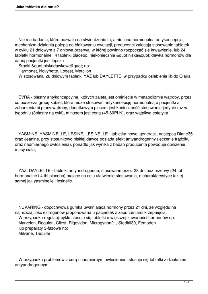 Jaka tabletka dla mnie? Nie ma badania, które pozwala na stwierdzenie ta, a nie inna hormonalna antykoncepcja, mechanizm działania polega na blokowaniu owulacji, producenci zalecają stosowanie tabletek w cyklu 21 dniowym z 7 dniową przerwą, w której powinno rozpocząć się krwawienie, lub 24 tabletki hormonalne i 4 tabletki placebo, niekoniecznie "niska" dawka hormonów dla danej pacjentki jest lepsza Środki "niskodawkowe" np: Harmonet, Novynette, Logest, Mercilon W stosowaniu 28 dniowym tabletki YAZ lub DAYLETTE, w przypadku osłabienia libido Qlaira EVRA - plastry antykoncepcyjne, których zaletą jest ominięcie w metabolizmie wątroby, przez co poszerza grupę kobiet, która może stosować antykoncepcję hormonalną o pacjentki z zaburzeniami pracy wątroby, dodatkowym plusem jest konieczność stosowania jedynie raz w tygodniu (3plastry na cykl), minusem jest cena (45-60PLN), oraz wątpliwa estetyka YASMINE, YASMINELLE, LESINE, LESINELLE - tabletka nowej generacji, następca Diane35 oraz Jeanine, przy stosunkowo niskiej dawce posiada efekt antyandrogenny (leczenie trądziku oraz nadmiernego owłosienia), ponadto jak wynika z badań producenta powoduje obniżenie masy ciała, YAZ, DAYLETTE - tabletki antyandrogenne, stosowane przez 28 dni bez przerwy (24 tbl hormonalne i 4 tbl placebo) majace na celu ułatwienie stosowania, o charakterystyce takiej samej jak yasminelle i lesinelle. NUVARING - dopochwowa gumka uwalniająca hormony przez 21 dni, ze względu na najniższą ilość estrogenów proponowana u pacjentek z zaburzeniami krzepnięcia. W przypadku regulacji cyklu stosuje się tabletki o większej zawartości hormonów np: Marvelon, Regulon, Cilest, Rigevidon, Microgynon21, Stediril30, Femoden lub preparaty 3-fazowe np: Milvane, Triquilar W przypadku problemów z cerą i nadmiernym owłosieniem stosuje się tabletki z działaniem antyandrogennym: 1/2 Jaka tabletka dla mnie? Diane35, Cilest, Jeanine, Yasmin, Yasminelle, Naraya, Asubtela, Midiane, Lesine, Lesinelle U kobiet karmiących stosuje się antykoncepcję jednoskładnikową (stosowane bez 7 dniowej przerwy), ktorą mogą zastosować od 6 tyg. po porodzie: Depo-Provera (zastrzyki), Cerazette lub Azalia (minipills). 2/2
