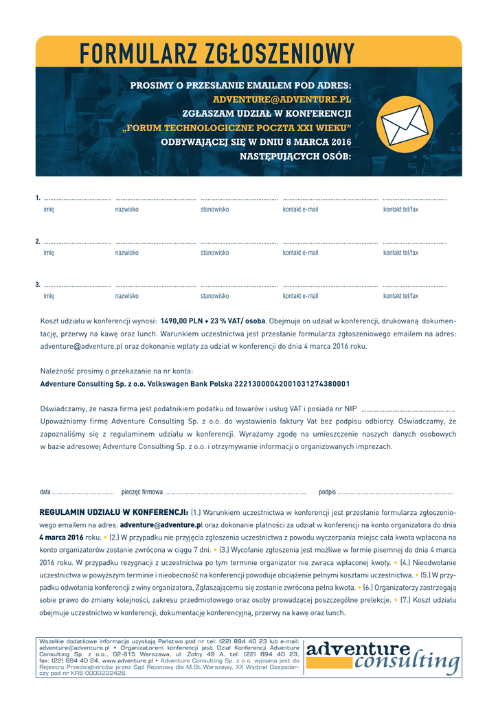 PROSIMY O PRZESŁANIE EMAILEM POD ADRES: [email protected] ZGŁASZAM UDZIAŁ W KONFERENCJI „FORUM TECHNOLOGICZNE POCZTA XXI WIEKU” ODBYWAJĄCEJ SIĘ W DNIU 8 MARCA 2016 NASTĘPUJĄCYCH OSÓB: 1. ......................................... ................................................. ............................................... .......................................................... ....................................... imię nazwisko stanowisko kontakt e-mail kontakt tel/fax 2. ......................................... ................................................. ............................................... .......................................................... ....................................... imię nazwisko stanowisko kontakt e-mail kontakt tel/fax 3. ......................................... ................................................. ............................................... .......................................................... ....................................... imię nazwisko stanowisko kontakt e-mail kontakt tel/fax Koszt udziału w konferencji wynosi: 1490,00 PLN + 23 % VAT/ osoba. Obejmuje on udział w konferencji, drukowaną dokumentację, przerwy na kawę oraz lunch. Warunkiem uczestnictwa jest przesłanie formularza zgłoszeniowego emailem na adres: [email protected] oraz dokonanie wpłaty za udział w konferencji do dnia 4 marca 2016 roku. Należność prosimy o przekazanie na nr konta: Adventure Consulting Sp. z o.o. Volkswagen Bank Polska 22213000042001031274380001 Oświadczamy, że nasza firma jest podatnikiem podatku od towarów i usług VAT i posiada nr NIP ......................................................... Upoważniamy firmę Adventure Consulting Sp. z o.o. do wystawienia faktury Vat bez podpisu odbiorcy. Oświadczamy, że zapoznaliśmy się z regulaminem udziału w konferencji. Wyrażamy zgodę na umieszczenie naszych danych osobowych w bazie adresowej Adventure Consulting Sp. z o.o. i otrzymywanie informacji o organizowanych imprezach. data ..................................... pieczęć firmowa ....................................................................................... podpis ....................................................................... REGULAMIN UDZIAŁU W KONFERENCJI: (1.) Warunkiem uczestnictwa w konferencji jest przesłanie formularza zgłoszeniowego emailem na adres: [email protected] oraz dokonanie płatności za udział w konferencji na konto organizatora do dnia 4 marca 2016 roku. • (2.) W przypadku nie przyjęcia zgłoszenia uczestnictwa z powodu wyczerpania miejsc cała kwota wpłacona na konto organizatorów zostanie zwrócona w ciągu 7 dni. • (3.) Wycofanie zgłoszenia jest możliwe w formie pisemnej do dnia 4 marca 2016 roku. W przypadku rezygnacji z uczestnictwa po tym terminie organizator nie zwraca wpłaconej kwoty. • (4.) Nieodwołanie uczestnictwa w powyższym terminie i nieobecność na konferencji powoduje obciążenie pełnymi kosztami uczestnictwa. • (5.) W przypadku odwołania konferencji z winy organizatora, Zgłaszającemu się zostanie zwrócona pełna kwota. • (6.) Organizatorzy zastrzegają sobie prawo do zmiany kolejności, zakresu przedmiotowego oraz osoby prowadzącej poszczególne prelekcje. • (7.) Koszt udziału obejmuje uczestnictwo w konferencji, dokumentację konferencyjną, przerwy na kawę oraz lunch. Wszelkie dodatkowe informacje uzyskają Państwo pod nr tel: (22) 894 40 23 lub e-mail: [email protected] • Organizatorem konferencji jest Dział Konferencji Adventure Consulting Sp. z o.o., 02-815 Warszawa, ul. Żołny 49 A, tel: (22) 894 40 23, fax: (22) 894 40 24, www.adventure.pl • Adventure Consulting Sp. z o.o. wpisana jest do Rejestru Przedsiębiorców przez Sąd Rejonowy dla M.St.Warszawy, XX Wydział Gospodarczy pod nr KRS 0000222426.