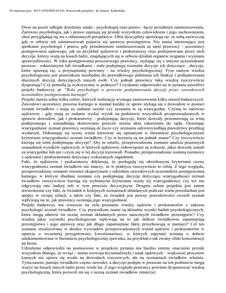 Nr rejestracyjny: 2015/19/D/HS5/01241; Kierownik projektu: dr Joanna Kabzińska Dwie na pozór odległe dziedziny nauki - psychologię oraz prawo - łączy przedmiot zainteresowania. Zarówno psychologia, jak i prawo zajmują się przede wszystkim człowiekiem i jego zachowaniem, choć przyglądają się im z odmiennych perspektyw. Obie dyscypliny spotykają się ze sobą zazwyczaj gdy w orbicie ich zainteresowań pojawia się sprawca przestępstwa. Nie mniej interesujące jest spotkanie psychologii i prawa, gdy przedmiotem zainteresowania są sami prawnicy - uczestnicy postępowania sądowego, jak na przykład sędziowie i prokuratorzy oraz podejmowane przez nich decyzje, którzy ważą na losach ludzi, znajdujących się w orbicie działań organów ścigania i wymiaru sprawiedliwości. W toku postępowania procesowego prawnicy, stykając się z innymi uczestnikami procesu - oskarżonymi lub świadkami - stale podejmują rozmaite decyzje ich dotyczące - decyzje, które opierają się, a przynajmniej powinny - na wiedzy psychologicznej. Tym samym wiedza psychologiczna jest prawnikom niezbędna do prawidłowego pełnienia ich funkcji i podejmowania słusznych decyzji dotyczących innych osób. Czy jednak prawnicy taką wiedzą rzeczywiście dysponują? Czy potrafią ją wykorzystać w praktyce? Uzyskanie odpowiedzi na te pytania umożliwi projekt badawczy pt. "Rola psychologii w procesie podejmowania decyzji przez zawodowych uczestników postępowania karnego". Projekt stawia sobie kilka celów, których realizacja wymaga zastosowania kilku metod badawczych. Zawodowi uczestnicy procesu karnego w niemal każdej ze spraw stykają się z dowodem w postaci zeznań świadków i mają za zadanie ocenić czy zeznania te są wiarygodne. Czynią to zarówno sędziowie - gdy mają za zadanie wydać wyrok na podstawie wszystkich przeprowadzonych w sprawie dowodów, jak i prokuratorzy - podejmując decyzje, które dowody przemawiają za winą podejrzanego i uzasadniają skierowanie przeciw niemu aktu oskarżenia do sądu. Oceniając wiarygodność zeznań prawnicy oceniają de facto czy zeznania odzwierciedlają prawdziwy przebieg wydarzeń. Dokonując tej oceny winni kierować się opisanymi w literaturze psychologicznymi kryteriami wiarygodności zeznań świadków. Czy te kryteria są im jednak znane? Czy rzeczywiście kierują się nimi podejmując decyzje? Aby to ustalić, przeprowadzona zostanie analiza pisemnych uzasadnień wyroków sądowych, w których sędziowie zobowiązani są wskazać, jakie dowody uznali za wiarygodne lub nie i czym się w tej decyzji kierowali. Ponadto, przeprowadzone zostaną rozmowy z sędziami i prokuratorami dotyczące wskazanych zagadnień. Fakt, że sędziowie i prokuratorzy deklarują, że posługują się określonymi kryteriami oceny wiarygodności zeznań świadków nie znaczy, że w praktyce rzeczywiście to robią. Z tego względu, przeprowadzony zostanie również eksperyment z udziałem zawodowych uczestników postępowania karnego, w którym zbadane zostanie czy podejmując decyzje dotyczące wiarygodności zeznań świadków rzeczywiście kierują się wybranymi kryteriami oceny tej wiarygodności, czy też nie odgrywają one żadnej roli w tym procesie decyzyjnym. Drugim celem projektu jest zatem stwierdzenie czy fakt, że świadek w kolejnych zeznaniach składanych podczas wielu przesłuchań jest spójny w swojej relacji, a także czy fakt, że świadek jest pewny prawdziwości swoich zeznań wpływają na to, jak prawnicy oceniają jego wiarygodność. Projekt badawczy ma wreszcie na celu poznanie wiedzy sędziów i prokuratorów z zakresu psychologii zeznań świadków. Czy prawnikom znane są aktualne wyniki badań psychologicznych, które mogą ułatwić im ocenę zeznań składanych przez naocznych świadków przestępstw? Czy wiedzą jakie czynniki psychologiczne wpływają na to jak dobrze świadkowie zapamiętują przestępstwo i jego sprawcę oraz jak długo zapamiętane fakty przechowują w pamięci? Cel ten zostanie zrealizowany w drodze wywiadów przeprowadzonych wśród sędziów i prokuratorów w oparciu o wcześniej przygotowany kwestionariusz, w których zapytani zostaną o dobrze udokumentowane w literaturze psychologicznej zjawiska, na przykład o tak zwany efekt koncentracji na broni. Udzielenie odpowiedzi na postawione w projekcie pytania ma bardzo istotne znaczenie przede wszystkim dlatego, że wciąż – mimo rozwoju kryminalistyki i nauk sądowych – większość procesów karnych nie opiera się wcale na dowodach rzeczowych, ale na zeznaniach świadków właśnie. Tymczasem, pamięć świadków często zawodzi, a decyzje podjęte w procesie na ich podstawie mogą ważyć na losach innych ludzi przez wiele lat. Z tego względu prawnicy powinni dysponować wiedzą psychologiczną, która pozwoli im się z oceną zeznań świadków zmierzyć.