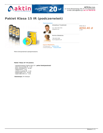Pakiet Klasa 15 IR (podczerwień) Twój konsultant Arkadiusz Trzebiński tel. 503 030 555 [email protected] NOWOŚĆ W OFERCIE 4050.40 zł 4050.40 zł z VAT Karina Gładecka 796 603 606 [email protected] CECHY PRODUKTU: 1.Producent - Testico Edu 2.Komunikacja - Podczerwień Pełna funkcjonalność oprogramowania Pakiet "Klasa 15" IR zawiera: - oprogramowanie Testico Edu 2.0 - pełna funkcjonalność pilot nauczycielski IR - 1 szt. pilot uczniowski IR - 15 szt. odbiornik IR - 1 szt. walizka na piloty IR - 1 szt. baterie R03 1,5 V - 32 szt. kabel USB A-B 5 m - 1 szt. Gwarancja: 24 miesiące Strona 1 / 1 Powered by TCPDF (www.tcpdf.org)