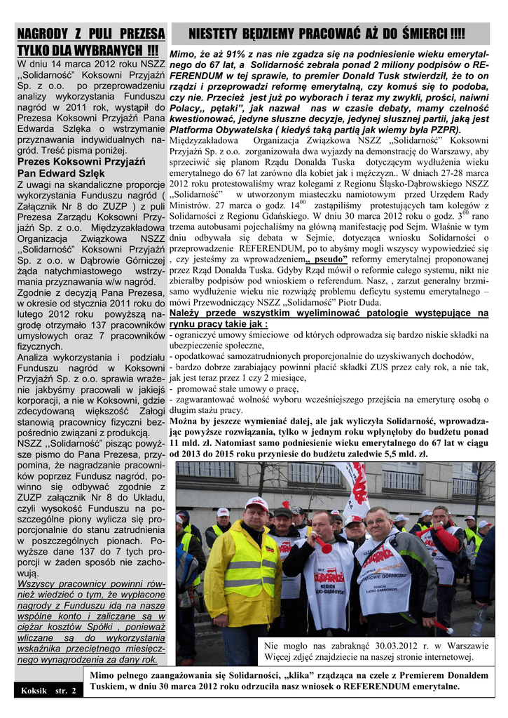 NAGRODY Z PULI PREZESA TYLKO DLA WYBRANYCH !!! W dniu 14 marca 2012 roku NSZZ ,,Solidarność” Koksowni Przyjaźń Sp. z o.o. po przeprowadzeniu analizy wykorzystania Funduszu nagród w 2011 rok, wystąpił do Prezesa Koksowni Przyjaźń Pana Edwarda Szlęka o wstrzymanie przyznawania indywidualnych nagród. Treść pisma poniżej. Prezes Koksowni Przyjaźń Pan Edward Szlęk Z uwagi na skandaliczne proporcje wykorzystania Funduszu nagród ( Załącznik Nr 8 do ZUZP ) z puli Prezesa Zarządu Koksowni Przyjaźń Sp. z o.o. Międzyzakładowa Organizacja Związkowa NSZZ ,,Solidarność” Koksowni Przyjaźń Sp. z o.o. w Dąbrowie Górniczej żąda natychmiastowego wstrzymania przyznawania w/w nagród. Zgodnie z decyzją Pana Prezesa, w okresie od stycznia 2011 roku do lutego 2012 roku powyższą nagrodę otrzymało 137 pracowników umysłowych oraz 7 pracowników fizycznych. Analiza wykorzystania i podziału Funduszu nagród w Koksowni Przyjaźń Sp. z o.o. sprawia wrażenie jakbyśmy pracowali w jakiejś korporacji, a nie w Koksowni, gdzie zdecydowaną większość Załogi stanowią pracownicy fizyczni bezpośrednio związani z produkcją. NSZZ ,,Solidarność” pisząc powyższe pismo do Pana Prezesa, przypomina, że nagradzanie pracowników poprzez Fundusz nagród, powinno się odbywać zgodnie z ZUZP załącznik Nr 8 do Układu, czyli wysokość Funduszu na poszczególne piony wylicza się proporcjonalnie do stanu zatrudnienia w poszczególnych pionach. Powyższe dane 137 do 7 tych proporcji w żaden sposób nie zachowują. Wszyscy pracownicy powinni również wiedzieć o tym, że wypłacone nagrody z Funduszu idą na nasze wspólne konto i zaliczane są w ciężar kosztów Spółki , ponieważ wliczane są do wykorzystania wskaźnika przeciętnego miesięcznego wynagrodzenia za dany rok. Koksik str. 2 NIESTETY BĘDZIEMY PRACOWAĆ AŻ DO ŚMIERCI !!!! Mimo, że aż 91% z nas nie zgadza się na podniesienie wieku emerytalnego do 67 lat, a Solidarność zebrała ponad 2 miliony podpisów o REFERENDUM w tej sprawie, to premier Donald Tusk stwierdził, że to on rządzi i przeprowadzi reformę emerytalną, czy komuś się to podoba, czy nie. Przecież jest już po wyborach i teraz my zwykli, prości, naiwni Polacy,, pętaki”, jak nazwał nas w czasie debaty, mamy czelność kwestionować, jedyne słuszne decyzje, jedynej słusznej partii, jaką jest Platforma Obywatelska ( kiedyś taką partią jak wiemy była PZPR). Międzyzakładowa Organizacja Związkowa NSZZ ,,Solidarność” Koksowni Przyjaźń Sp. z o.o. zorganizowała dwa wyjazdy na demonstrację do Warszawy, aby sprzeciwić się planom Rządu Donalda Tuska dotyczącym wydłużenia wieku emerytalnego do 67 lat zarówno dla kobiet jak i mężczyzn.. W dniach 27-28 marca 2012 roku protestowaliśmy wraz kolegami z Regionu Śląsko-Dąbrowskiego NSZZ ,,Solidarność” w utworzonym miasteczku namiotowym przed Urzędem Rady Ministrów. 27 marca o godz. 1400 zastąpiliśmy protestujących tam kolegów z Solidarności z Regionu Gdańskiego. W dniu 30 marca 2012 roku o godz. 300 rano trzema autobusami pojechaliśmy na główną manifestację pod Sejm. Właśnie w tym dniu odbywała się debata w Sejmie, dotycząca wniosku Solidarności o przeprowadzenie REFERENDUM, po to abyśmy mogli wszyscy wypowiedzieć się , czy jesteśmy za wprowadzeniem,, pseudo” reformy emerytalnej proponowanej przez Rząd Donalda Tuska. Gdyby Rząd mówił o reformie całego systemu, nikt nie zbierałby podpisów pod wnioskiem o referendum. Nasz, , zarzut generalny brzmisamo wydłużenie wieku nie rozwiążę problemu deficytu systemu emerytalnego – mówi Przewodniczący NSZZ ,,Solidarność” Piotr Duda. Należy przede wszystkim wyeliminować patologie występujące na rynku pracy takie jak : - ograniczyć umowy śmieciowe od których odprowadza się bardzo niskie składki na ubezpieczenie społeczne, - opodatkować samozatrudnionych proporcjonalnie do uzyskiwanych dochodów, - bardzo dobrze zarabiający powinni płacić składki ZUS przez cały rok, a nie tak, jak jest teraz przez 1 czy 2 miesiące, - promować stałe umowy o pracę, - zagwarantować wolność wyboru wcześniejszego przejścia na emeryturę osobą o długim stażu pracy. Można by jeszcze wymieniać dalej, ale jak wyliczyła Solidarność, wprowadzając powyższe rozwiązania, tylko w jednym roku wpłynęłoby do budżetu ponad 11 mld. zł. Natomiast samo podniesienie wieku emerytalnego do 67 lat w ciągu od 2013 do 2015 roku przyniesie do budżetu zaledwie 5,5 mld. zł. Nie mogło nas zabraknąć 30.03.2012 r. w Warszawie Więcej zdjęć znajdziecie na naszej stronie internetowej. Mimo pełnego zaangażowania się Solidarności, ,,klika” rządząca na czele z Premierem Donaldem Tuskiem, w dniu 30 marca 2012 roku odrzuciła nasz wniosek o REFERENDUM emerytalne.