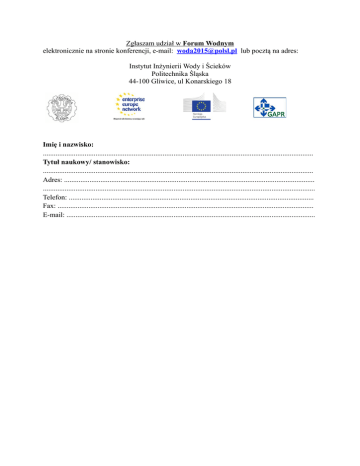 Zgłaszam udział w Forum Wodnym elektronicznie na stronie konferencji, e-mail: [email protected] lub pocztą na adres: Instytut Inżynierii Wody i Ścieków Politechnika Śląska 44-100 Gliwice, ul Konarskiego 18 Imię i nazwisko: ..................................................................................................................................................... Tytuł naukowy/ stanowisko: ..................................................................................................................................................... Adres: .......................................................................................................................................... ...................................................................................................................................................... Telefon: ....................................................................................................................................... Fax: ............................................................................................................................................. E-mail: .........................................................................................................................................