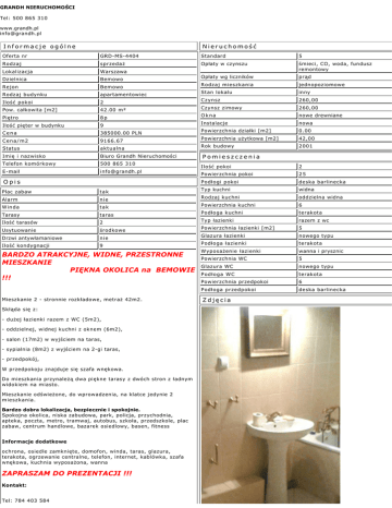 GRANDH NIERUCHOMOŚCI Tel: 500 865 310 www.grandh.pl [email protected] Informacje ogólne Nieruchomość Oferta nr GRD-MS-4404 Standard 5 Rodzaj sprzedaż Opłaty w czynszu Lokalizacja Warszawa śmieci, CO, woda, fundusz remontowy Dzielnica Bemowo Opłaty wg liczników prąd Bemowo Rodzaj mieszkania jednopoziomowe Rodzaj budynku apartamentowiec Stan lokalu inny Ilość pokoi 2 Czynsz 260,00 42.00 m² Czynsz zimowy 260,00 8p Okna nowe drewniane 9 Instalacje nowa Cena 385000.00 PLN Powierzchnia działki [m2] 0.00 Cena/m2 9166.67 Powierzchnia użytkowa [m2] 42,00 Status aktualna Rok budowy 2001 Imię i nazwisko Biuro Grandh Nieruchomości Pomieszczenia Telefon komórkowy 500 865 310 E-mail [email protected] Rejon Pow. całkowita [m2] Piętro Ilość pięter w budynku Ilość pokoi 2 Powierzchnia pokoi 25 Podłogi pokoi deska barlinecka tak Typ kuchni widna nie Rodzaj kuchni oddzielna widna tak Powierzchnia kuchni 6 Tarasy taras Podłoga kuchni terakota Ilość tarasów 2 Typ łazienki razem z wc środkowe Powierzchnia łazienki [m2] 5 nie Glazura łazienki nowego typu 9 Podłoga łazienki terakota Wyposażenie łazienki wanna i prysznic Powierzchnia WC 5 Glazura WC nowego typu Podłoga WC terakota Powierzchnia przedpokoi 6 Podłoga przedpokoi deska barlinecka Opis Plac zabaw Alarm Winda Usytuowanie Drzwi antywłamaniowe Ilość kondygnacji BARDZO ATRAKCYJNE, WIDNE, PRZESTRONNE MIESZKANIE PIĘKNA OKOLICA na BEMOWIE !!! Mieszkanie 2 - stronnie rozkładowe, metraż 42m2. Skłąda się z: - dużej łazienki razem z WC (5m2), - oddzielnej, widnej kuchni z oknem (6m2), - salon (17m2) w wyjściem na taras, - sypialnia (8m2) z wyjściem na 2-gi taras, - przedpokój, W przedpokoju znajduje się szafa wnękowa. Do mieszkania przynależą dwa piękne tarasy z dwóch stron z ładnym widokiem na miasto. Mieszkanie odświeżone, do wprowadzenia, na klatce jedynie 2 mieszkania. Bardzo dobra lokalizacja, bezpiecznie i spokojnie. Spokojna okolica, niska zabudowa, park, policja, przychodnia, apteka, poczta, metro, tramwaj, autobus, szkoła, przedszkole, plac zabaw, centrum handlowe, bazarek osiedlowy, basen, fitness Informacje dodatkowe ochrona, osiedle zamknięte, domofon, winda, taras, glazura, terakota, ogrzewanie centralne, telefon, internet, kablówka, szafa wnękowa, kuchnia wyposażona, wanna ZAPRASZAM DO PREZENTACJI !!! Kontakt: Tel: 784 403 584 Zdjęcia Biuro GRANDH NIERUCHOMOŚCI ul.Rakowiecka 41, 02-521 Warszawa mail: [email protected] www.grandh.pl GRANDH NIERUCHOMOŚCI Tel:500 865 310/> www.grandh.pl [email protected] Nr licencji pośrednika nieruchomości nadzorującego ofertę - 18607