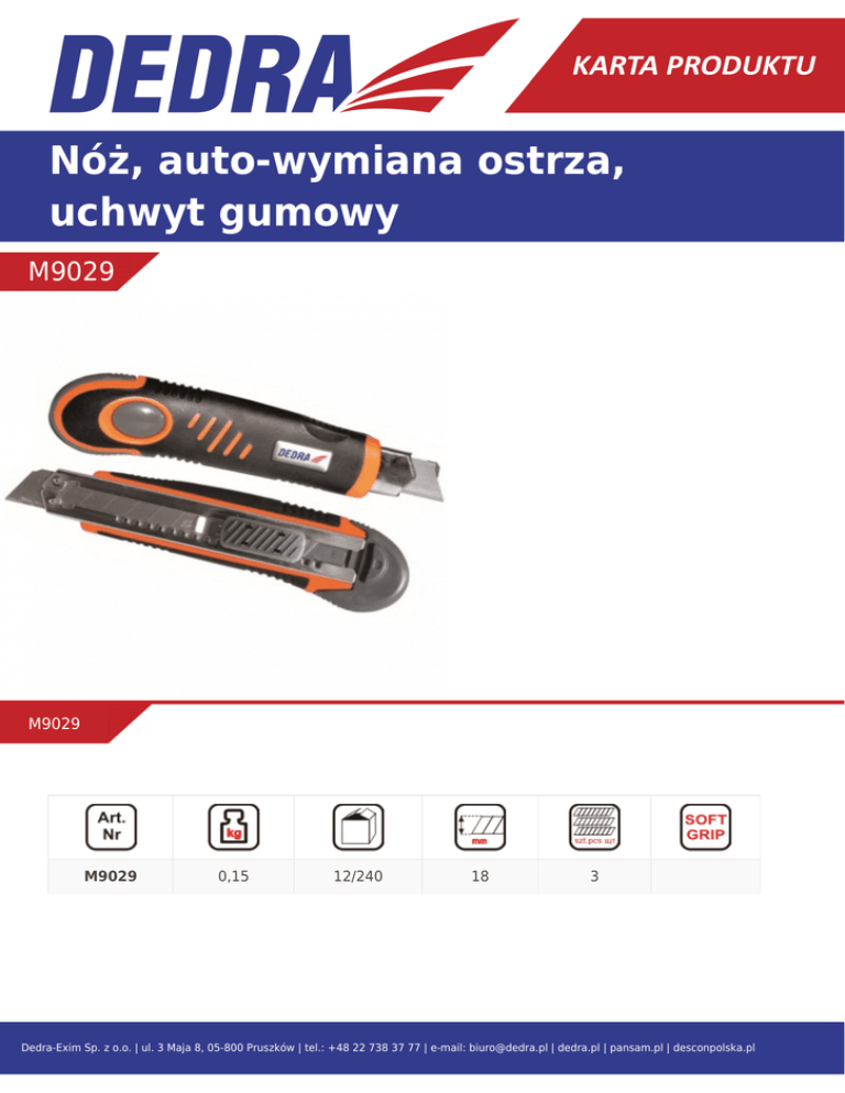 Nóż, auto-wymiana ostrza, uchwyt gumowy M9029 M9029 M9029 0,15 12/240 18 3 Dedra-Exim Sp. z o.o. | ul. 3 Maja 8, 05-800 Pruszków | tel.: +48 22 738 37 77 | e-mail: [email protected] | dedra.pl | pansam.pl | desconpolska.pl