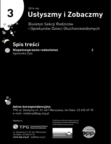 3 2014 rok Usłyszmy i Zobaczmy Biuletyn Sekcji Rodziców i Opiekunów Dzieci Głuchoniewidomych Spis treści Niepełnosprawne rodzeństwo Agnieszka Żyta Adres korespondencyjny: 2 TPG ul. Deotymy 41, 01-441 Warszawa, tel./faks: 22 635 69 70 e-mail: [email protected] Wydawca: ul. Deotymy 41, 01-441 Warszawa tel./faks: 22 635 69 70 www.tpg.org.pl [email protected] Publikacja dofinansowana przez Państwowy Fundusz Rehabilitacji Osób Niepełnosprawnych tematy bliskie rodzicom Niepełnosprawne rodzeństwo Przyjście na świat dziecka niepełnosprawnego to swoista rewolucja zmieniająca dotychczasowe życie wszystkich członków rodziny. Nie tylko rodziców, na których oczywiście w największym stopniu spoczywa obowiązek radzenia sobie z nowymi wyzwaniami, lecz także pełnosprawnego rodzeństwa. Ono także czuje się niepewne i zdezorientowane, nie rozumie pewnych zachowań, nie wie, jak reagować na pytania i docinki otoczenia, czuje się obciążone dodatkowymi obowiązkami. Rodzice, sami niejednokrotnie przytłoczeni sytuacją – koniecznością zaakceptowania niepełnosprawności dziecka i szukania optymalnych sposobów wspierania jego rozwoju – nie zawsze są w stanie odpowiedzieć na potrzeby pozostałych dzieci. Reakcje na brata lub siostrę z dysfunkcją są jednakowe dla wszystkich rodzin osób niepełnosprawnych. Poniżej przedstawię te najczęściej wymieniane w literaturze przedmiotu. Brak uwagi rodzicielskiej spowodowany koncentracją na dziecku niepełnosprawnym Zdarza się, że rodzice tak bardzo angażują się w starania na rzecz rehabilitacji dziecka niepełnosprawnego, iż tracą z oczu pozostałe dzieci. Zapominają o tym, że wszystkie ich pociechy wymagają uwagi, rozmowy, poczucia bezpieczeństwa i akceptacji. Wydaje im się niekiedy, że sprawne dzieci są w dużo lepszej sytuacji niż niepełnosprawne i poradzą sobie w życiu bez szczególnego wspar- 2 UiZ cia. „Mój brat – mów Hubert (lat 21) – ma pierwszeństwo w każdej sytuacji. Rodzice na każdym kroku pokazują mu, jaki jest kochany. Dla mnie mają zdecydowanie mniej czasu. Poza tym zawsze było mu znacznie więcej wolno niż mnie”. Większa odpowiedzialność za niepełnosprawne rodzeństwo Rodzeństwo pełnosprawne jest często obarczane obowiązkami związanymi z opieką nad niepełnosprawnymi bratem lub siostrą. Starsze dzieci (częściej są to siostry) pomagają w czynnościach higienicznych, karmieniu, ubieraniu, prowadzeniu ćwiczeń rehabilitacyjno-edukacyjnych, a także odprowadzają rodzeństwo do szkoły czy ośrodka, pilnują go podczas nieobecności rodziców. Młodsze dzieci, chociaż rzadziej, także angażowane są w wiele czynności związanych z opieką nad bratem lub siostrą. Powoduje to ograniczenie ilości wolnego czasu, jakim dysponują, i niekiedy poczucie przeciążenia obowiązkami. Wiąże się także z szybszym niż u rówieśników osiąganiem dojrzałości oraz odpowiedzialności za drugiego człowieka. „Córki, mając niepełnosprawną siostrę, są obarczone większą liczbą obowiązków i znacznie większą odpowiedzialnością niż ich rówieśnicy – mówi pewna czterdziestoośmioletnia matka. – Nie zawsze mogą swobodnie dysponować wolnym czasem, szybciej musiały dorosnąć. Życie z upośledzoną umysłowo siostrą wymaga od nich wielu wyrzeczeń i wpływa na ograniczenie kontaktów z koleżankami i kolegami”. Wewnętrzna presja „zadośćuczynienia” za ograniczenia niepełnosprawnego rodzeństwa Niektóre pełnosprawne dzieci, obserwując rodziców, widzą, że ich nadzieje dotyczące rozwoju niepełnosprawnego dziecka nie zawsze się spełniają, i czują potrzebę wynagrodzenia im tego. Takie „zadośćuczynienie” przejawia się w różny sposób. Niekiedy jest to UiZ 3 ukrywanie prawdy o kłopotach i problemach związanych z posiadaniem niepełnosprawnego brata lub siostry. Kiedy indziej – gotowość do przejęcia większości obowiązków związanych z czynnościami opiekuńczo-rehabilitacyjnymi. Bywa też, że sprawne dzieci czują wewnętrzny przymus, aby bardzo dobrze się uczyć i zdobyć wyższe wykształcenie. Zdarza się, że wybierają zawód związany z pomocą osobom niepełnosprawnym – zostają lekarzami, pedagogami specjalnymi, psychologami czy rehabilitantami. Stygmatyzacja, poczucie inności Życie z bratem lub siostrą z niepełnosprawnością intelektualną oznacza często – w okresie szkolnym – docinki, agresję słowną czy czynną ze strony rówieśników. Porównując swoją sytuację rodzinną z życiem kolegów i koleżanek, rodzeństwo sprawne niekiedy czuje się w jakiś sposób inne, naznaczone. Nie zawsze jest to inność rozumiana jako coś gorszego. Bywa, że dostrzegają swoją większą wrażliwość na drugiego człowieka, na jego cierpienie i choroby. „Czasami wydaje mi się, że rówieśnicy uważają mnie za gorszą. Mam mniej wolnego czasu, muszę opiekować się siostrą – mówi Kasia (13 lat). – Czuję się pokrzywdzona przez los. Gdy koleżanki rozmawiają o rodzeństwie, co ciekawego zrobiło lub powiedziało, jest mi przykro. Mam siostrę, która nigdy nic śmiesznego nie powie. Wtedy czuję się inna”. Brak normalnej interakcji między rodzeństwem Całkowicie pełnosprawne rodzeństwo doświadcza szeregu sytuacji, w trakcie których uczy się od siebie różnych zachowań społecznych. Wspólne zabawy, uczestnictwo w pracach domowych, kłótnie, a nawet bójki mają swój sens. Dzieci uczą się współpracy, walki o swoje prawa, odpowiedzialności, asertywności, zachowań, które przydadzą im się w kontaktach z ludźmi spoza rodziny. Gdy jedno 4 UiZ z dzieci jest niepełnosprawne intelektualnie, relacje te ulegają zachwianiu. Brat lub siostra niepełnosprawni umysłowo w stopniu głębokim nigdy nie będą się bawić tak jak sprawne dziecko, nie będą dyskutować czy pomagać w pracach domowych. Zamiana ról Pozycja dziecka – to, jak jest ono traktowanie przez pozosta