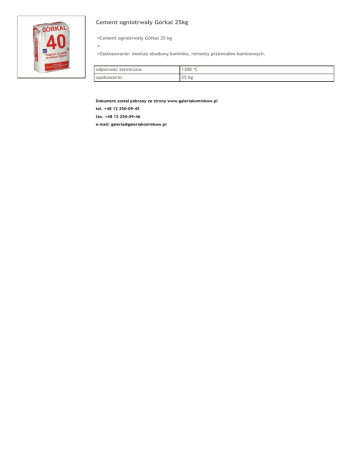 Cement ogniotrwały Górkal 25kg Cement ogniotrwały Górkal 25 kg Zastosowanie: montaż obudowy kominka, remonty przewodów kominowych. odporność termiczna: 1300 *C opakowanie: 25 kg Dokument został pobrany ze strony www.galeriakominkow.pl tel. +48 12 250-09-45 fax. +48 12 250-09-46 e-mail: [email protected]