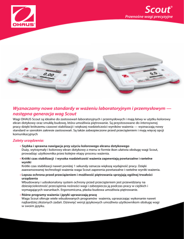 Scout® Przenośne wagi precyzyjne Wyznaczamy nowe standardy w ważeniu laboratoryjnym i przemysłowym — następna generacja wag Scout Wagi OHAUS Scout są idealne do zastosowań laboratoryjnych i przemysłowych i mają łatwy w użytku kolorowy ekran dotykowy oraz smukłą budowę, która umożliwia piętrowanie. Są przystosowane do intensywnej pracy dzięki krótszemu czasowi stabilizacji i większej rozdzielczości wyników ważenia — wyznaczają nowy standard w szerokim zakresie zastosowań. Są także zabezpieczone przed przeciążeniem i mają więcej opcji komunikacyjnych Zalety urządzenia: • Szybka i sprawna nawigacja przy użyciu kolorowego ekranu dotykowego Duży, wytrzymały i kolorowy ekran dotykowy z menu w formie ikon ułatwia obsługę wagi Scout, prowadząc użytkownika przez kolejne etapy procesu ważenia. • Krótki czas stabilizacji i wysoka rozdzielczość ważenia zapewniają powtarzalne i rzetelne wyniki Krótki czas stabilizacji nawet poniżej 1 sekundy oznacza większą wydajność pracy. Dzięki zaawansowanej technologii ważenia waga Scout zapewnia powtarzalne i rzetelne wyniki ważenia. • Lepsza ochrona przed przeciążeniem i możliwość piętrowania sprzyjają ogólnej trwałości urządzenia Wbudowany i udoskonalony system ochrony przed przeciążeniem jest przewidziany na dziesięciokrotność przeciążenia nośności wagi i zabezpiecza ją podczas pracy w ciężkich i wymagających warunkach. Ergonomiczna, płaska budowa umożliwia piętrowanie. • Różne programy ważenia i języki upraszczają pracę Waga Scout oferuje wiele wbudowanych programów ważenia, upraszczając wykonanie nawet najbardziej złożonych zadań. Dziewięć wersji językowych umożliwia użytkownikom obsługę wagi w swoim języku. Scout® Przenośne wagi precyzyjne Łatwa nawigacja i obsługa wagi dzięki ekranowi dotykowemu Obsługa przenośnej wagi nigdy nie była łatwiejsza, szybsza ani bardziej intuicyjna niż w przypadku wagi OHAUS Scout z kolorowym wyświetlaczem dotykowym. Łatwa nawigacja dzięki ekranowi dotykowemu i menu w formie ikon, sprawne przechodzenie pomiędzy programami pracy, zmiana jednostek ważenia za jednym prostym dotknięciem ekranu oraz niezwykle szybka konfiguracja i kalibracja. Kolorowy ekran dotykowy wagi OHAUS Scout tworzy całkiem nowy poziom wydajności i funkcjonalności, niespotykany dotąd w ważeniu przenośnym. Zegar czasu rzeczywistego podaje dokładny czas nawet po utracie zasilania. Co więcej możliwości śledzenia danych zgodne z GLP/GMP pomagają w monitorowaniu i przekazywaniu danych. Większa wydajność i produktywność W wagach OHAUS Scout z ekranem dotykowym liczy się precyzja i wydajność. Krótki czas stabilizacji nawet poniżej 1 sekundy oznacza większą wydajność pracy w laboratorium lub na linii produkcyjnej. Lepsza rozdzielczość sprawia, że można liczyć na niezwykle dokładne i powtarzalne wyniki ważenia. Duża trwałość, która charakteryzuje wagi Scout, pozostaje bezkonkurencyjna Od firmy OHAUS można oczekiwać wag do przenośnego ważenia o największej wytrzymałości — dlatego wyposażyliśmy je w doskonałą ochronę przed przeciążeniem nawet do dziesięciokrotności nośności wagi, wytrzymałą szalkę ze stali nierdzewnej, podstawę odporną na uszkodzenia oraz wbudowaną blokadę do transportu i przechowywania. Zadbaliśmy także o trwałość wysokiej jakości ekranu dotykowego. Jako dopełnienie wytrzymałości, która charakteryzuje nasze produkty, ekran dotykowy Scout został opracowany w taki sposób, aby wagi można było przechowywać piętrowo po zastosowaniu specjalnej pokrywy dodatkowo zabezpieczającej wagę, kiedy nie jest używana. Więcej opcji podłączeń do wszechstronnego gromadzenia i przesyłania danych Waga Scout oferuje 9 programów ważenia przeznaczonych nawet do najbardziej złożonych zadań. Użytkownicy mają możliwość obsługi wagi w swoim języku. Dostępnych jest 9 wersji językowych: angielska, hiszpańska, niemiecka, włoska, francuska, polska, węgierska, czeska i turecka. Dostępny model z osłoną przeciwpodmuchową Pomysłowa osłona przeciwpodmuchowa (tylko dla modeli 1 mg) została wyposażona w łatwą do zdejmowania górną pokrywkę . Pełni ona funkcję zabezpieczenia przed podmuchami powietrza, które chroni szalkę w trudnych warunkach, jednocześnie skracając czas ważenia. Osłona przeciwpodmuchowa Złącza komunikacyjne Poszerzona możliwość podłączania urządzeń, na przykład przez RS232, USB, Ethernet i Bluetooth® Zabezpiecza próbki przed wpływem czynników zewnętrznych, zwiększając szybkość i powtarzalność pomiarów Uchwyt do ważenia podszalkowego Wbudowany w spód wagi Scout uchwyt do ważenia podszalkowego umożliwia oznaczanie gęstości i obliczanie ciężaru właściwego Gniazdo zabezpieczające Wbudowane gniazdo zabezpieczające zapobiega kradzieży Przycisk blokady Wagę Scout można zablokować w wybranej konfiguracji przy użyciu przycisku blokady mechanicznej Kolorowy ekran dotykowy Kolorowy ekran dotykowy z menu w formie ikon ułatwia nawigację Wbudowane programy: • Ważenie—określanie masy próbki na szalce w wybranej jednostce miary. • Liczenie sztuk — liczenie podobnych elementów znajdujących się na szalce na podstawie masy jednego z nich. • Ważenie procentowe —pomiar masy próbki jako procentowej części uprzednio wprowadzonej masy referencyjnej. • Ważenie kontrolne —porównanie masy próbki z limitami docelowymi. • Ważenie dynamiczne—ważenie niestabilnej próbki. 8.7 in Urządzenie określa średnią masę próbki w danym 222 mm przedziale czasu. • Sumowanie—pomiar łącznej masy wielu próbek. Wartość łączna może przekraczać nośność urządzenia. • Oznaczanie gęstości —określenie gęstości ciał stałych lub cieczy. Dzięki wbudowanemu uchwytowi do ważenia podszalkowego można oznaczać gęstość przedmiotów, których umieszczenie na szalce spra