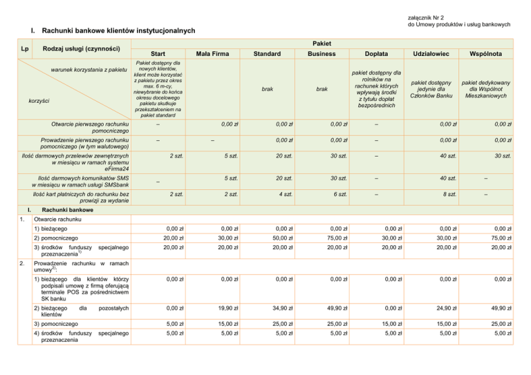 I. Lp Rachunki bankowe klientów instytucjonalnych Rodzaj usługi (czynności) warunek korzystania z pakietu korzyści Pakiet Otwarcie pierwszego rachunku pomocniczego – Prowadzenie pierwszego rachunku pomocniczego (w tym walutowego) – brak 0,00 zł Business Dopłata Udziałowiec Wspólnota brak pakiet dostępny dla rolników na rachunek których wpływają środki z tytułu dopłat bezpośrednich pakiet dostępny jedynie dla Członków Banku pakiet dedykowany dla Wspólnot Mieszkaniowych 0,00 zł – 0,00 zł 0,00 zł 0,00 zł 0,00 zł – 0,00 zł 0,00 zł 5 szt. 20 szt. 30 szt. – 40 szt. 30 szt. 5 szt. 20 szt. 30 szt. – 40 szt. – 2 szt. 2 szt. 4 szt. 6 szt. – 8 szt. – 0,00 zł 0,00 zł 0,00 zł 0,00 zł 0,00 zł 0,00 zł 0,00 zł 20,00 zł 30,00 zł 50,00 zł 75,00 zł 30,00 zł 30,00 zł 75,00 zł 20,00 zł 20,00 zł 20,00 zł 20,00 zł 20,00 zł 20,00 zł 20,00 zł 1) bieżącego dla klientów którzy podpisali umowę z firmą oferującą terminale POS za pośrednictwem SK banku 0,00 zł 0,00 zł 0,00 zł 0,00 zł 0,00 zł 0,00 zł 0,00 zł 2) bieżącego klientów 0,00 zł 19,90 zł 34,90 zł 49,90 zł 0,00 zł 24,90 zł 49,90 zł 5,00 zł 15,00 zł 25,00 zł 25,00 zł 15,00 zł 15,00 zł 25,00 zł 5,00 zł 5,00 zł 5,00 zł 5,00 zł 5,00 zł 5,00 zł 5,00 zł Ilość kart płatniczych do rachunku bez prowizji za wydanie – 2 szt. – Rachunki bankowe Otwarcie rachunku 1) bieżącego 2) pomocniczego 3) środków funduszy 1) przeznaczenia 2. Standard 0,00 zł Ilość darmowych komunikatów SMS w miesiącu w ramach usługi SMSbank I. Mała Firma Start Pakiet dostępny dla nowych klientów, klient może korzystać z pakietu przez okres max. 6 m-cy, niewybranie do końca okresu docelowego pakietu skutkuje przekształceniem na pakiet standard Ilość darmowych przelewów zewnętrznych w miesiącu w ramach systemu eFirma24 1. załącznik Nr 2 do Umowy produktów i usług bankowych specjalnego Prowadzenie rachunku w ramach 2) umowy : dla pozostałych 3) pomocniczego 4) środków funduszy przeznaczenia specjalnego Rodzaj usługi (czynności) 3. 4. Mała Firma Start Standard Business Dopłata Wspólnota Realizacja przelewów wewnętrznych 1) składane w placówce SK banku 2,00 zł 2,00 zł 2,00 zł 2,00 zł 5,00 zł 1,00 zł 1,00 zł 2) składane za pośrednictwem systemu eFirma24 0,00 zł 0,00 zł 0,00 zł 0,00 zł 1,00 zł 0,00 zł 0,00 zł 3) z rachunku środków funduszy specjalnego przeznaczenia 0,00 zł 0,00 zł 0,00 zł 0,00 zł 0,00 zł 0,00 zł 0,00 zł 0,20 % min 5,00 zł max 200,00 zł 0,20 % min 5,00 zł max 200,00 zł 0,20 % min 5,00 zł max 200,00 zł 0,20 % min 5,00 zł max 200,00 zł 0,20 % min 5,00 zł max 200,00 zł 5,00 zł 0,20 % min 5,00 zł max 200,00 zł Realizacja przelewów zewnętrznych do banków krajowych 1) składane w placówce SK banku za pośrednictwem Elixir 2) składane w placówce SK banku za 0,20 % min 50,00 zł 0,20 % min 50,00 zł 0,20 % min 50,00 zł 0,20 % min 50,00 zł 0,20 % min 50,00 zł pośrednictwem Sorbnet max 200,00 zł max 200,00 zł max 200,00 zł max 200,00 zł max 200,00 zł 5. Udziałowiec 50,00 zł 0,20 % min 50,00 zł max 200,00 zł 3) składane za pośrednictwem systemu eFirma24 realizowane za pośrednictwem Elixir 1,00 zł 2,00 zł 1,00 zł 1,00 zł 5,00 zł 1,00 zł 1,00 zł 4) składane za pośrednictwem systemu eFirma24 realizowane za pośrednictwem Sorbnet do kwoty 1 mln (obowiązuje od chwili udostępnienia usługi) 30,00 zł 30,00 zł 30,00 zł 30,00 zł 30,00 zł 30,00 zł 30,00 zł 5) składane za pośrednictwem systemu eFirma24 realizowane za pośrednictwem Sorbnet dla kwoty powyżej 1 mln (obowiązuje od chwili udostępnienia usługi) 25,00 zł 25,00 zł 25,00 zł 25,00 zł 25,00 zł 25,00 zł 25,00 zł 6) składane za pośrednictwem systemu eFirma24 realizowane za pośrednictwem BlueCash (obowiązuje od chwili udostępnienia usługi) 15,00 zł 15,00 zł 15,00 zł 15,00 zł 15,00 zł 15,00 zł 15,00 zł 7) z rachunku środków funduszy specjalnego przeznaczenia 0,00 zł 0,00 zł 0,00 zł 0,00 zł 0,00 zł 0,00 zł 0,00 zł 1) złożenie zlecenia stałego 0,00 zł 0,00 zł 0,00 zł 0,00 zł 0,00 zł 0,00 zł 0,00 zł 2) odwołanie / modyfikacja zlecenia stałego 0,00 zł 0,00 zł 0,00 zł 0,00 zł 0,00 zł 0,00 zł 0,00 zł 5,00 zł 5,00 zł 3,00 zł 3,00 zł 5,00 zł 3,00 zł 3,00 zł Zlecenia stałe 3) realizacja zlecenia stałego 3) a) na podstawie dyspozycji złożonej w placówce SK banku Rodzaj usługi (czynności) 6. 7. 8. 12. Dopłata Udziałowiec Wspólnota 1,00 zł 1,00 zł 5,00 zł 1,00 zł 1,00 zł 1,60 zł 1,60 zł 1,60 zł 1,60 zł 1,60 zł 1,60 zł 1,60 zł 1) oraz przeksięgowania na ROR i a vista posiadacza rachunku 0,30 %, min 4,00 zł 0,30 %, min 4,00 zł 0,50 %, min 5,00 zł 0,50 %, min 5,00 zł 0,28 %, min 4,00 zł 0,28 %, min 4,00 zł 0,50 %, min 5,00 zł 2) oraz bezgotówkowe dokonywane z wpływów bieżących 0,00 % 0,00 % 0,00 % 0,00 % 0,00 zł 0,00 % 0,00 % 3) nie zrealizowanie przez posiadacza rachunku zaawizowanej pisemnej wypłaty 0,20 % 0,20 % 0,20 % 0,20 % 0,20 % 0,20 % 0,20 % 4) sporządzenie bankowego dowodu wypłaty Wpłaty 0,50 zł 0,50 zł 0,50 zł 0,50 zł 0,50 zł 0,50 zł 0,50 zł 1) wpłaty gotówkowe dokonywane w placówce oraz przeksięgowania z rachunków ROR posiadacza rachunku 0,18 % min 5,00 zł 0,30 % min 4,00 zł 0,45 % min 5,00 zł 0,45 % min 5,00 zł 0,30 % min 4,00 zł 0,18 % min 5,00 zł 0,45 % min 5,00 zł może zrobić powyżej 50 szt. 1,00 % 1,00 % 1,00 % 1,00 % 1,00 % 1,00 % ustalane indywidualnie ustalane indywidualnie ustalane indywidualnie ustalane indywidualnie ustalane indywidualnie ustalane indywidualnie ustalane indywidualnie 0,50 zł 0,50 zł 0,50 zł 0,50 zł 0,50 zł 0,50 zł 0,50 zł 2) zastrzeżenie czeku 30,00 zł 30,00 zł 30,00 zł 30,00 zł 30,00 zł 30,00 zł 30,00 zł Przyjęcie i potwierdzenie pełnomocnictwa posiadacza rachunku do realizacji dyspozycji innego banku Przygotowanie i wydanie pisma potwierdzającego blokadę środków na ra