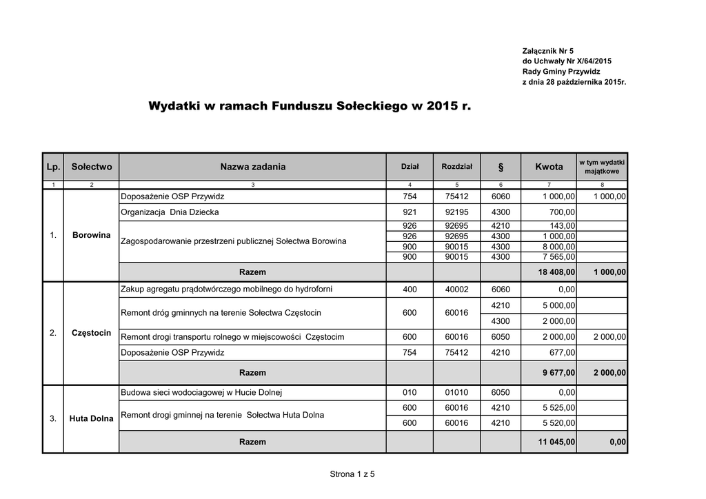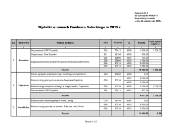 Załącznik Nr 5 do Uchwały Nr X/64/2015 Rady Gminy Przywidz z dnia 28 października 2015r. Wydatki w ramach Funduszu Sołeckiego w 2015 r. Lp. Sołectwo Nazwa zadania Dział Rozdział § Kwota w tym wydatki majątkowe 1 2 3 4 5 6 7 8 Doposażenie OSP Przywidz 754 75412 6060 1 000,00 Organizacja Dnia Dziecka 921 92195 4300 700,00 Zagospodarowanie przestrzeni publicznej Sołectwa Borowina 926 926 900 900 92695 92695 90015 90015 4210 4300 4300 4300 143,00 1 000,00 8 000,00 7 565,00 1. Borowina Razem 2. Częstocin 18 408,00 Zakup agregatu prądotwórczego mobilnego do hydroforni 400 40002 Remont dróg gminnych na terenie Sołectwa Częstocin 600 60016 6060 0,00 4210 5 000,00 4300 2 000,00 Remont drogi transportu rolnego w miejscowości Częstocim 600 60016 6050 2 000,00 Doposażenie OSP Przywidz 754 75412 4210 677,00 Razem 9 677,00 Budowa sieci wodociagowej w Hucie Dolnej 3. Huta Dolna Remont drogi gminnej na terenie Sołectwa Huta Dolna Razem 010 01010 6050 0,00 600 60016 4210 5 525,00 600 60016 4210 5 520,00 11 045,00 Strona 1 z 5 1 000,00 1 000,00 2 000,00 2 000,00 0,00 4. Doposażenie jednostki OSP Jodłowno 754 75412 Zorganizowanie Festynu Sołeckiego w 2015r 921 92195 Jodłowno Zagospodarowanie przestrzeni publicznej terenu sołeckiego Sołectwie Jodłowno w 926 92695 4210 4170 4210 4210 4300 3 000,00 600,00 300,00 4 133,00 600,00 4210 4 283,00 4210 -4 133,00 4300 1 000,00 6050 4 650,00 4 650,00 14 433,00 4 650,00 Razem 5. Kierzkowo Doposażenie OSP Przywidz 754 75412 4210 240,00 Zagospodarowanie przestrzeni publicznej w miejscowości Bliziny 926 92695 4210 2 000,00 926 92695 4210 300,00 926 92695 6050 8 700,00 8 700,00 11 240,00 8 700,00 Zagospodarowanie przestrzeni publicznej w miejscowości Kierzkowo Razem 6. Kozia Góra Doposażenie OSP Przywidz 754 75412 6060 500,00 500,00 Zagospodarowanie przestrzeni publicznej na terenie sołectwa Kozia Góra dz.95/1 921 92195 6050 8 232,00 8 232,00 8 732,00 4210 4300 6050 4170 8 732,00 1 310,00 2 100,00 8 590,00 1 700,00 4210 700,00 4220 327,00 Razem 7. Marszewo Zagospodarowanie terenu rekreacyjnego w Ząbrsku Górnym i Marszewskiej Górze 926 Organizacja Festynu Rodzinnego oraz V Turnieju Piłki Siatkowej 921 92695 92195 Razem 8. 14 727,00 Zagospodarowanie przestrzeni publicznej w Sołectwie Marszewska Marszewska Kolonia Kolonia Razem Strona 2 z 5 900 90015 4300 8 590,00 8 590,00 9 970,00 9 970,00 0,00 Zagospodarowanie przestrzeni publicznej w Klonowie Dolnym 9. Michalin Remont drogi gminnej od Klonowa Dolnego do Michalina 900 90015 4300 5 000,00 926 92695 4300 2 500,00 600 60016 4210 8 367,00 Razem 15 867,00 Organizacja Festynu Rodzinnego 10. 11. Miłowo Zagospodarowanie przestrzeni publicznej w Sołectwie Miłowo 4210 290,00 4220 750,00 92695 6050 6 730,00 6 730,00 92695 6050 2 460,00 2 460,00 10 230,00 6 730,00 921 92195 926 926 Zakup agregatu prądotwórczego mobilnego do hydroforni 400 40002 6060 0,00 Remont dróg gminnych na terenie Sołectwa Nowa Wieś Przywidzka 600 60016 4210 8 000,00 921 92195 4210 832,00 921 92195 4210 9 500,00 921 92195 4300 500,00 Nowa Wieś Przywidzka Wyposażenie świetlicy sołeckiej w Nowej Wsi Przywidzkiej Razem 12. 18 832,00 Doposażenie OSP Przywidz 754 75412 Zorganizowanie Festynu Rodzinnego 921 92195 921 92195 926 92695 Olszanka Zagospodarowanie przestrzeni publicznej w Sołectwie Olszanka Zagospodarowanie miejsca integracji dla mieszkańców sołectwa Piekła Górnego 13. Piekło Górne Zagospodarowanie placu zabaw w miejscowości Piekło Dolne Razem Strona 3 z 5 754 75412 926 92695 926 92695 0,00 4210 500,00 4210 4220 4210 4210 6050 500,00 500,00 2 000,00 500,00 6 621,00 6 621,00 10 621,00 6 621,00 6060 1 000,00 1 000,00 4300 2 000,00 6050 4300 6050 4 032,00 500,00 5 533,00 13 065,00 Razem Doposażenie OSP Przywidz 0,00 4 032,00 5 533,00 10 565,00 14. Pomlewo Doposażenie OSP Przywidz 754 75412 4210 1 000,00 Festyn Sołecki pn. "Święto pieczonego ziemniaka" 921 92195 4300 3 000,00 600 60016 6050 4 000,00 4 000,00 600 60016 6050 -4 000,00 -4 000,00 4210 4210 4300 12 913,00 -630,00 1 000,00 6050 3 500,00 3 500,00 6050 4 000,00 4 000,00 6050 630,00 630,00 25 413,00 8 130,00 Zagospodarowanie przestrzeni publicznej w miejscowości Pomlewo oraz III Rajd Rowerowy 926 92695 Razem Doposażenie świetlicy wiejskiej Organizacja Dnia Dziecka 15. Przywidz 921 92195 4210 12 800,00 921 92195 4210 1 400,00 921 92195 4210 400,00 4220 600,00 600 60016 4270 5 000,00 4210 3 000,00 4300 1 000,00 6050 8 371,00 8 381,00 32 571,00 8 381,00 500,00 Zagospodarowanie przestrzeni publicznej w Sołectwie Przywidz 926 92695 Razem 16 Doposażenie OSP Przywidz 754 75412 6060 500,00 Zagospodarowanie przestrzeni publicznej w miejscowości Stara Huta 926 92695 4210 12 109,00 Stara Huta Razem 12 609,00 Strona 4 z 5 500,00 17. Budowa chodnika w Suchej Hucie 600 60016 Doposażenie jednostki OSP Przywidzu 754 75412 Zagospodarowanie przestrzeni publicznej w Suchej Hucie 926 92695 Sucha Huta 6050 9 238,00 4210 288,00 6060 4210 212,00 500,00 212,00 6050 4 000,00 4 000,00 14 238,00 13 450,00 6060 1 000,00 1 000,00 4210 640,00 4210 -640,00 4300 2 050,00 4300 -2 050,00 4270 14 574,00 Razem Doposażenie OSP Przywidz 18. Trzepowo 754 Zagospodarowanie przestrzeni publicznej .Budowa placu zabaw na działce Nr 200 w Trzepowie Budowa chodnika w m.Trzepowo etap III 926 600 Ogółem Strona 5 z 5 75412 92695 60016 9 238,00 15 574,00 1 000,00 267 252,00 89 049,00